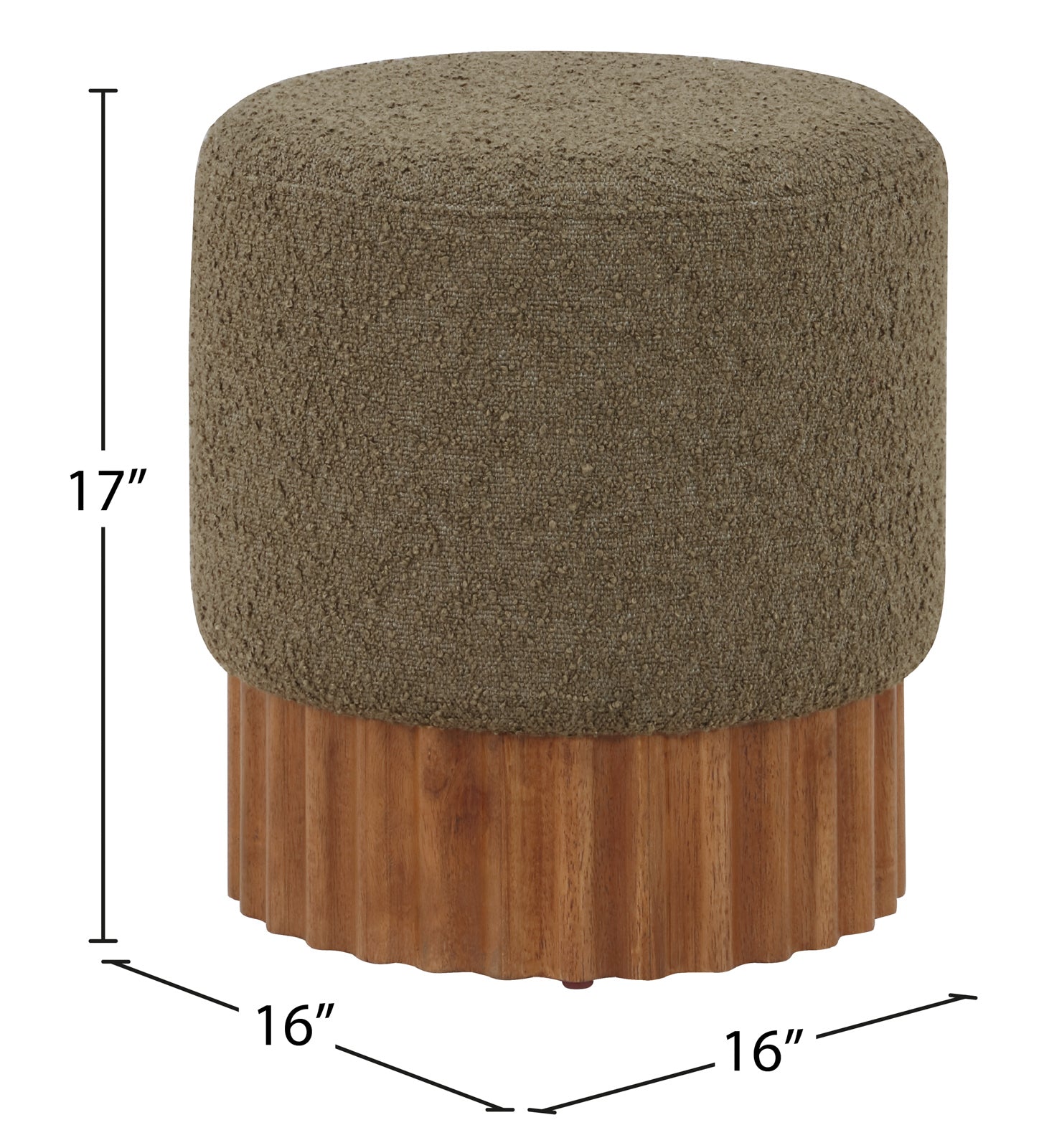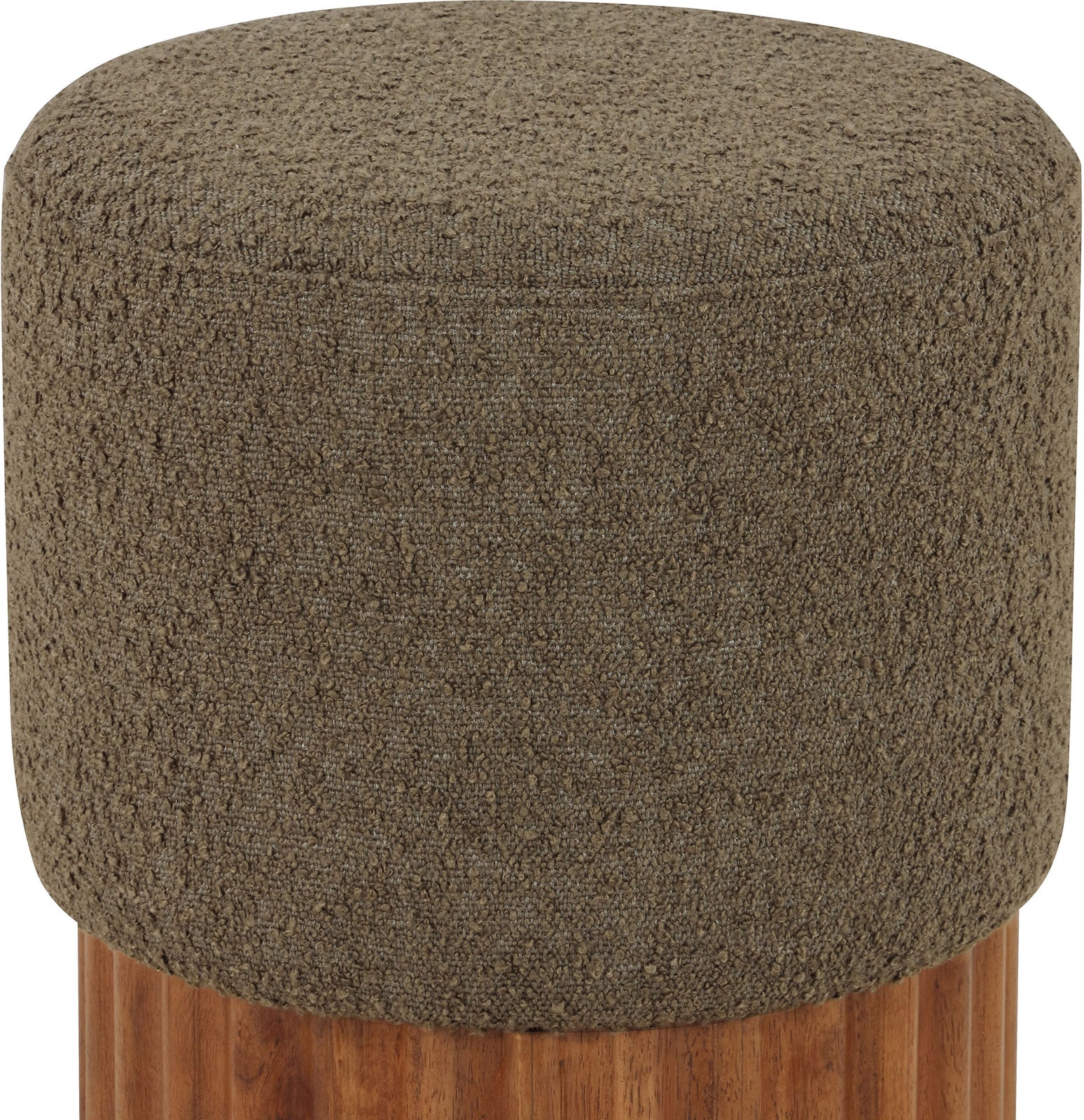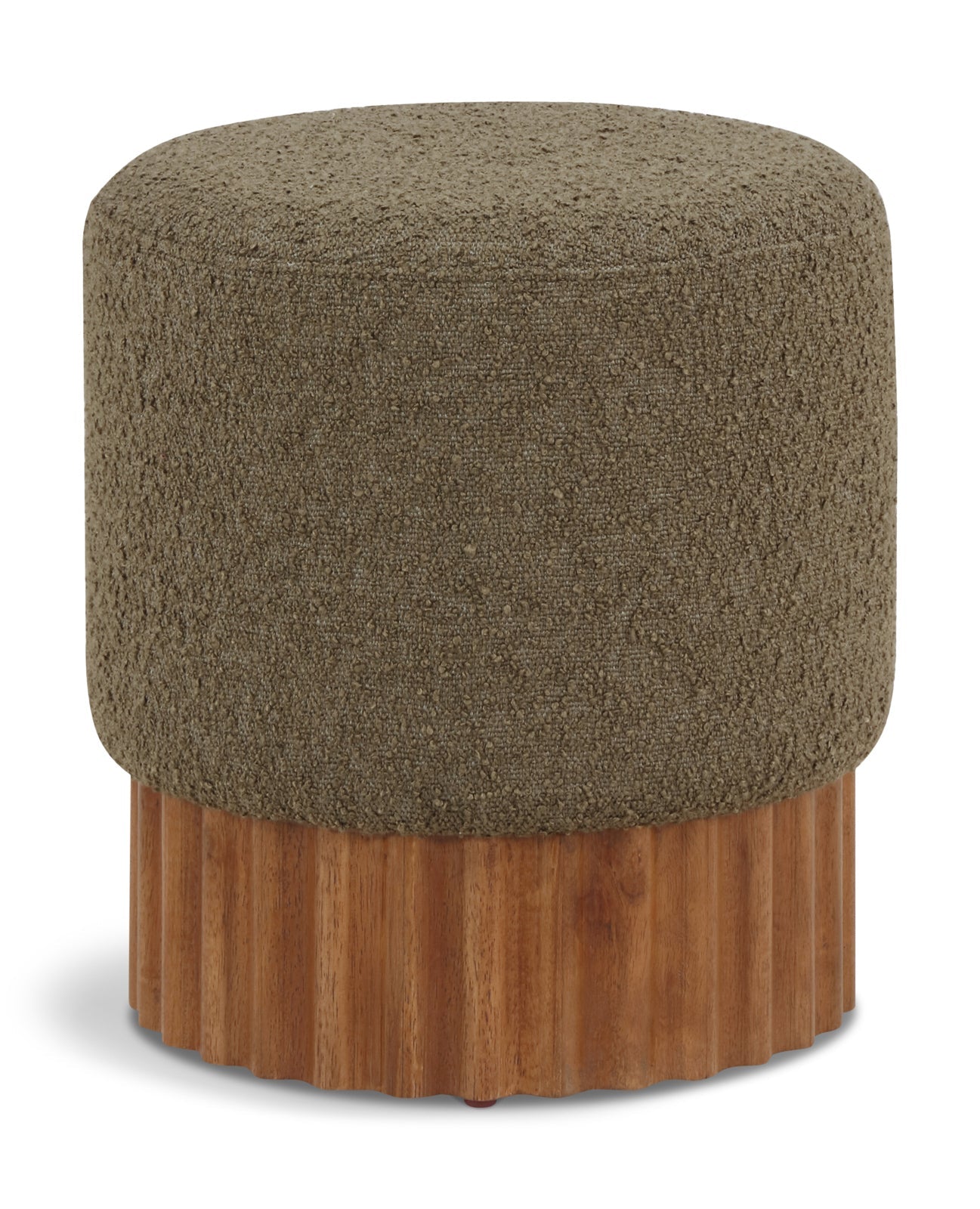 Indulge in the luxurious texture of the Veranda Boucle Fabric Ottoman/Stool. It boasts a rich olive boucle fabric that is paired with an elegant and sturdy solid wood base, featuring a walnut finish that highlights the beautiful wood grain patterns. This unique combination of materials creates a perfect blend of style and durability, making it an ideal addition to any modern or traditional interior design.