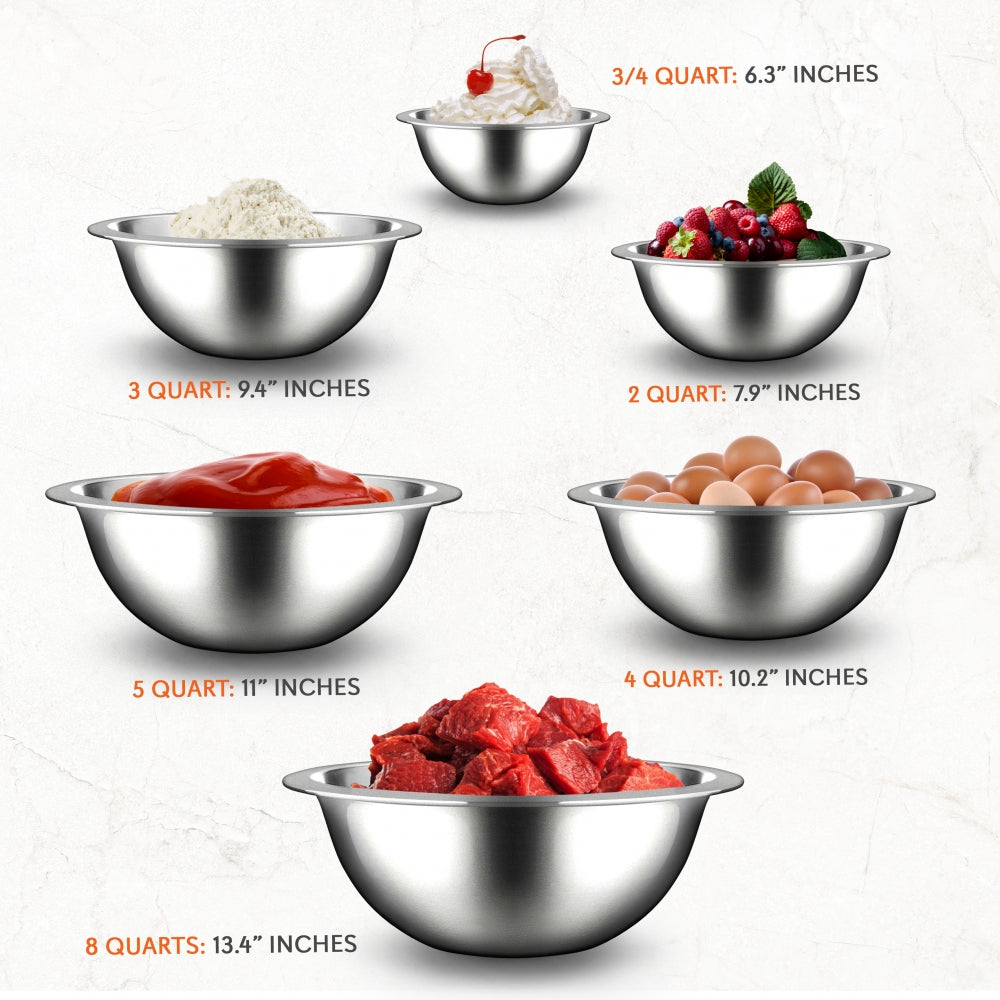6 PIECE SET: The stainless steel mixing bowls set features 6 bowls w/ various sizes including 3/4, 2, 3, 4, 5, 8...