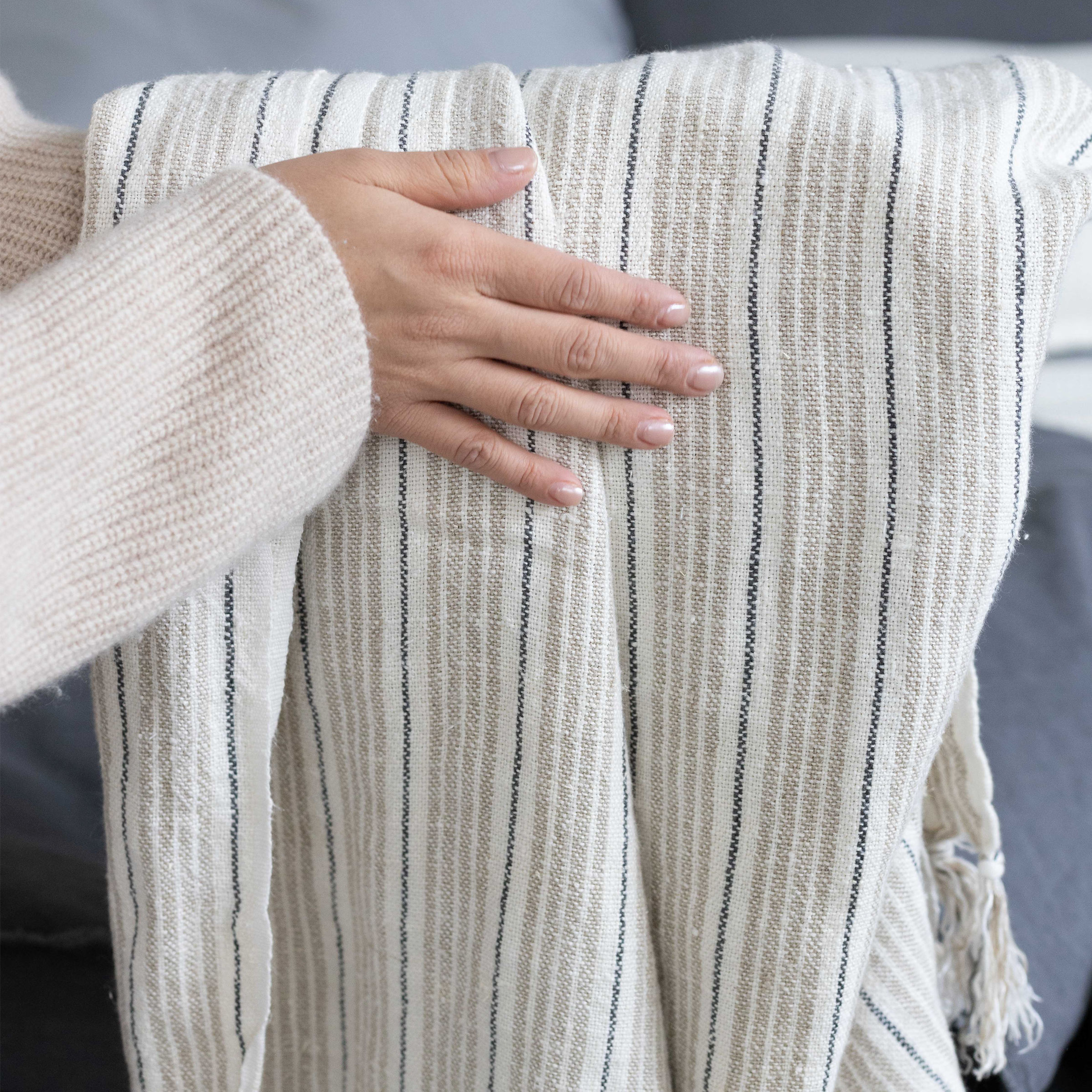 The soft, heavy weight linen Newport blanket is hand-loomed with tassels all along the edge. Featuring alternating stripes in natural and midnight. Made of 100% linen.