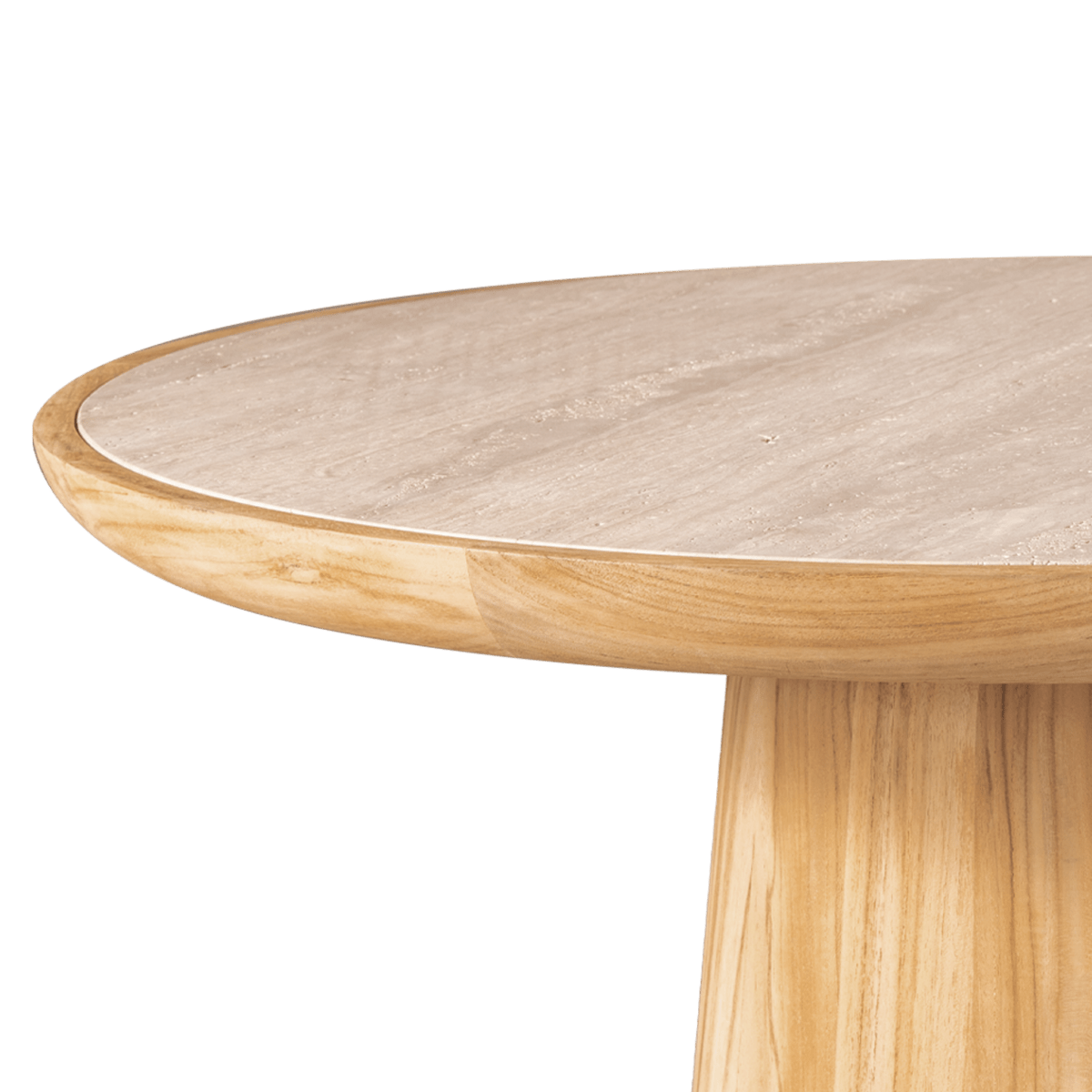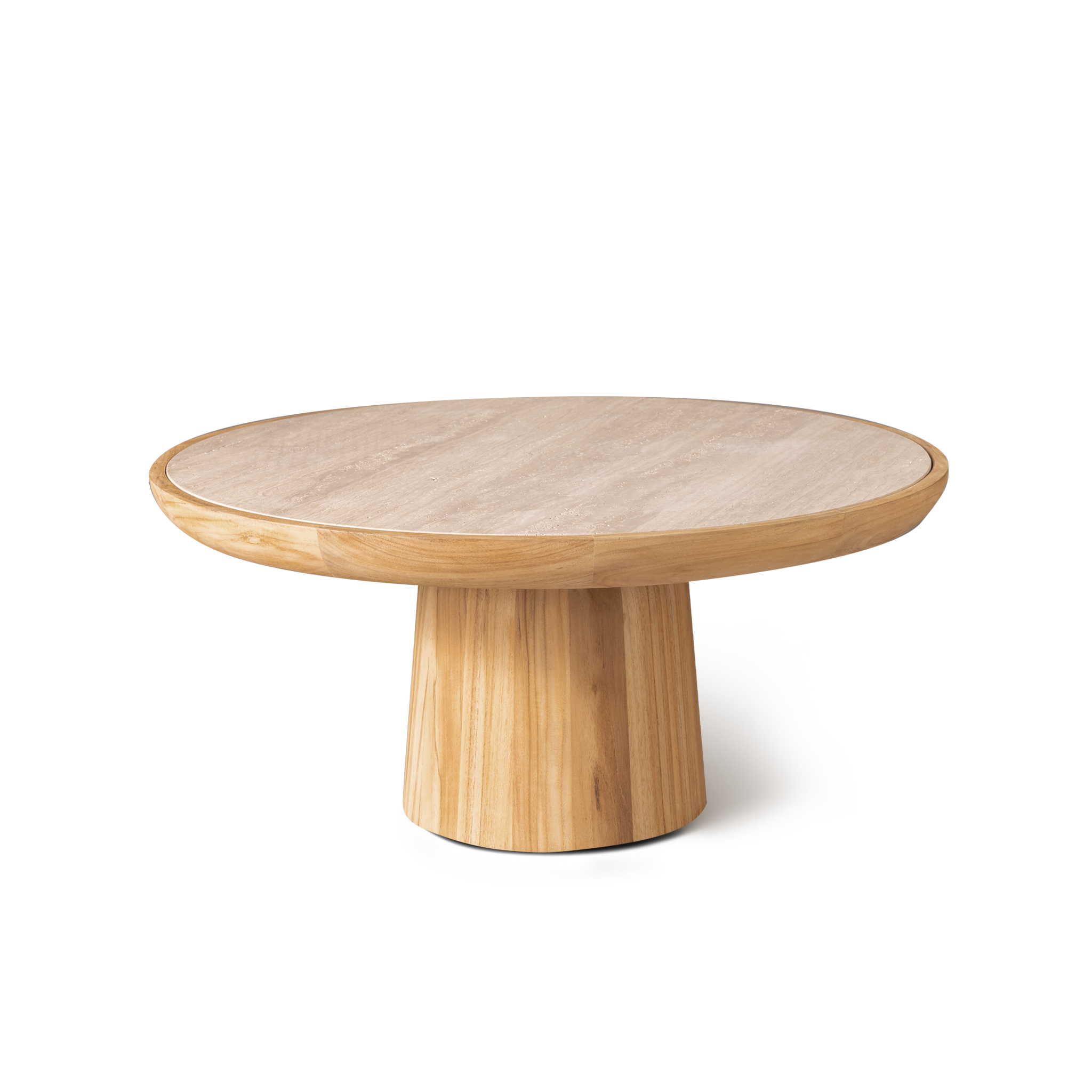 Sculptural simplicity echoes midcentury design in our Nova collection, where sleek and sophisticated lines provide an understated foundation for the contrasting textures of aluminum and travertine. The mixed–material Nova Teak Round Nesting Coffee Table 30" anchors your outdoor seating set — featuring a solid Indonesian teak base in Natural with an inset travertine top in Natural. Enjoy the option to nest this piece with the collection's other tables to create layers and interest or let it make a statement on its own. Our mid–sized coffee table of the collection, this piece adds a refined touch to your outdoor space.