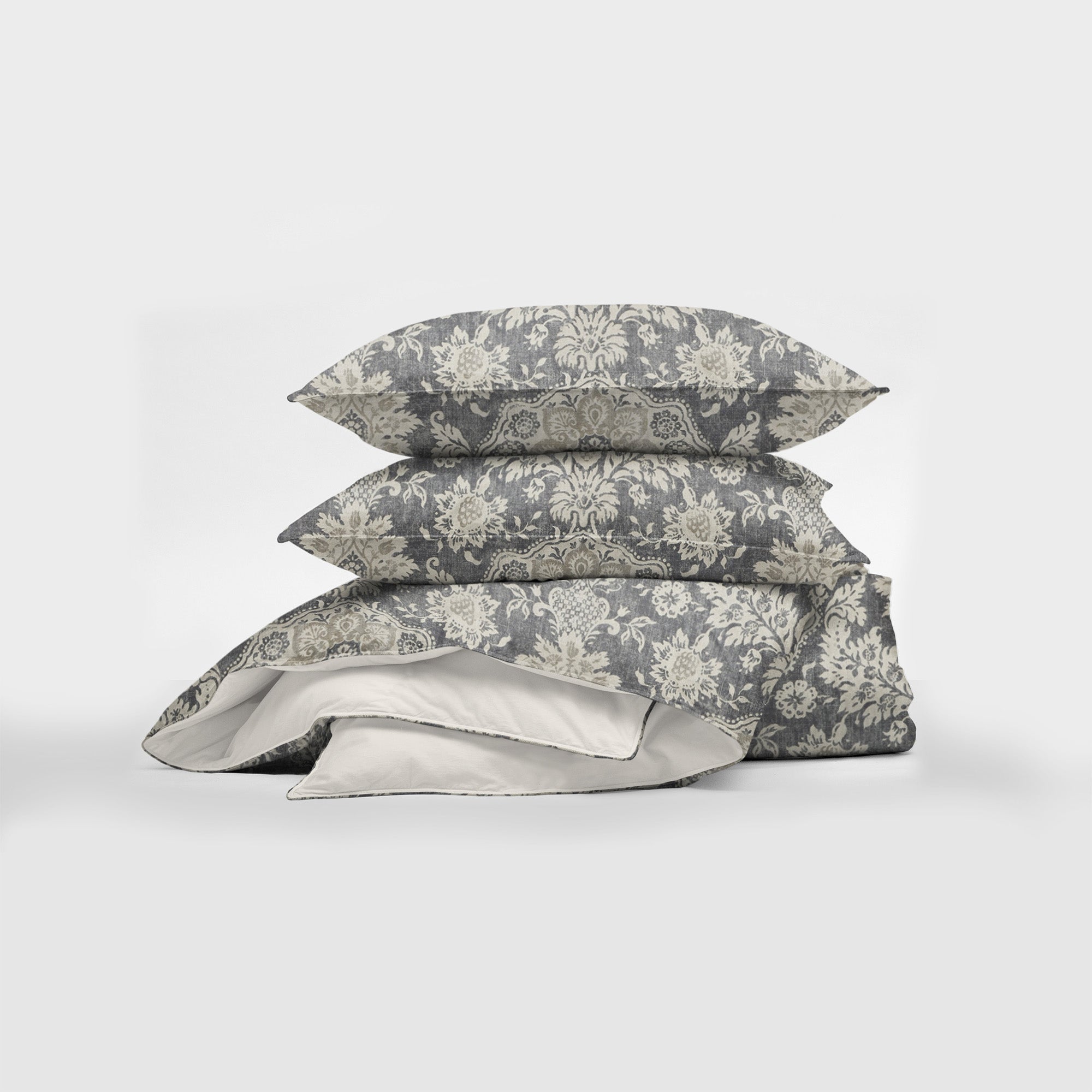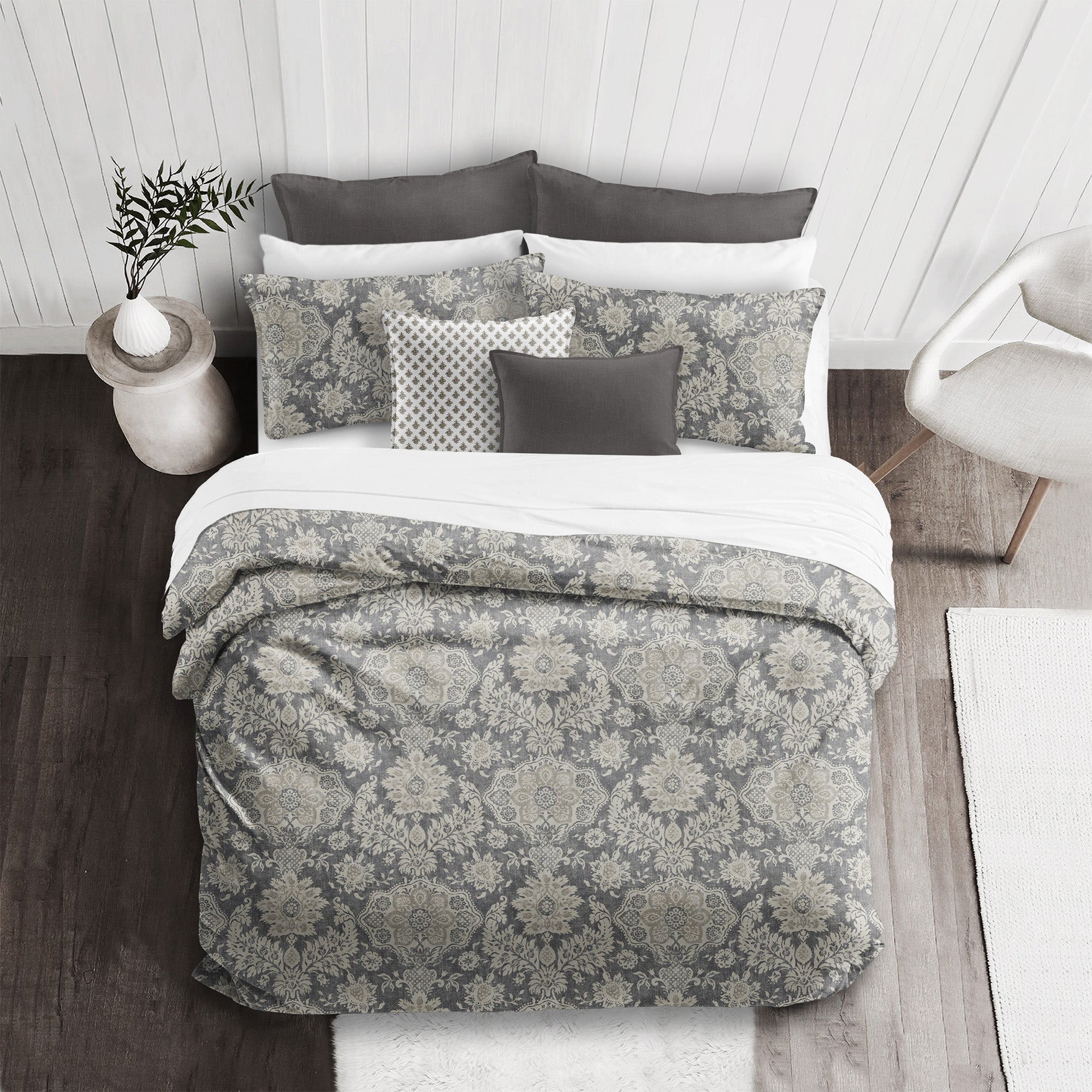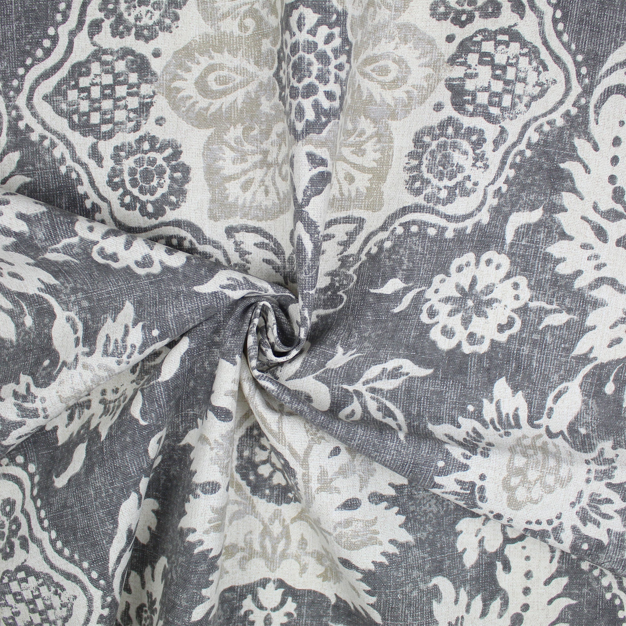 Osha is a classic design with a modern color combination. A bold distressed flourish pattern in shades of taupe and cream is elevated against the gunmetal backdrop, creating a fresh take on traditional style.