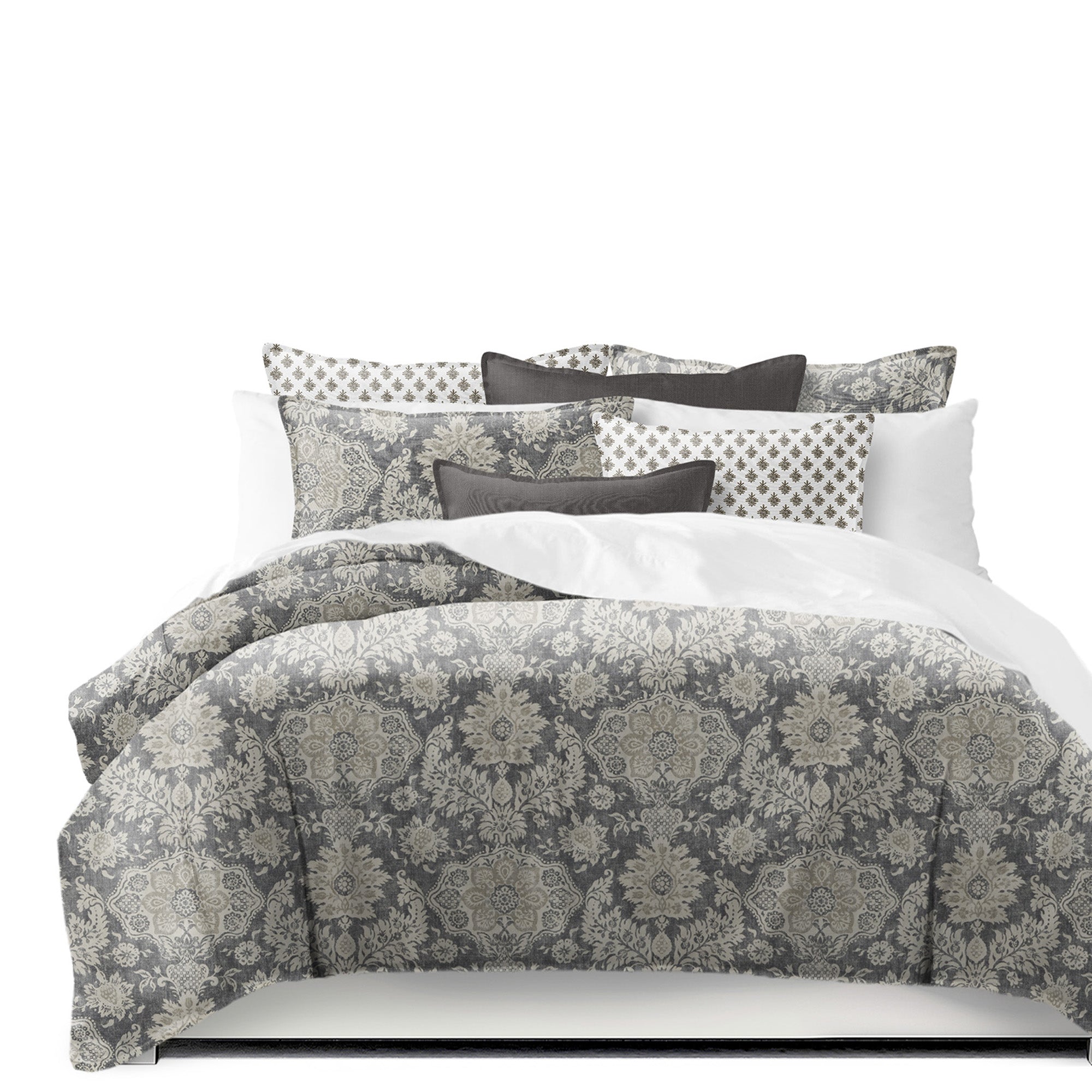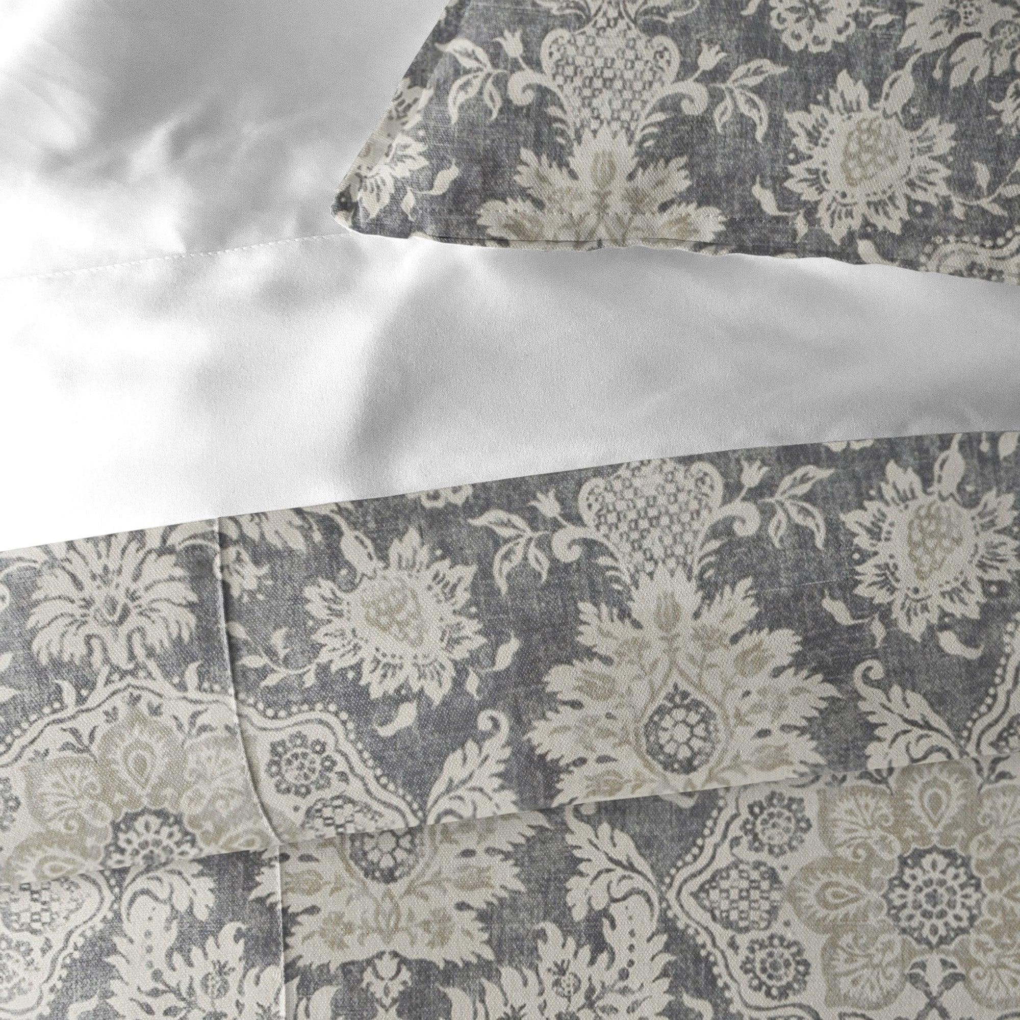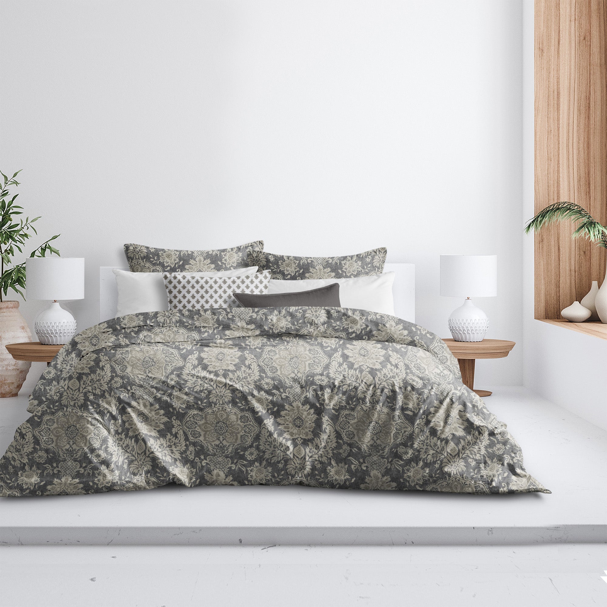 Osha is a classic design with a modern color combination. A bold distressed flourish pattern in shades of taupe and cream is elevated against the gunmetal backdrop, creating a fresh take on traditional style.