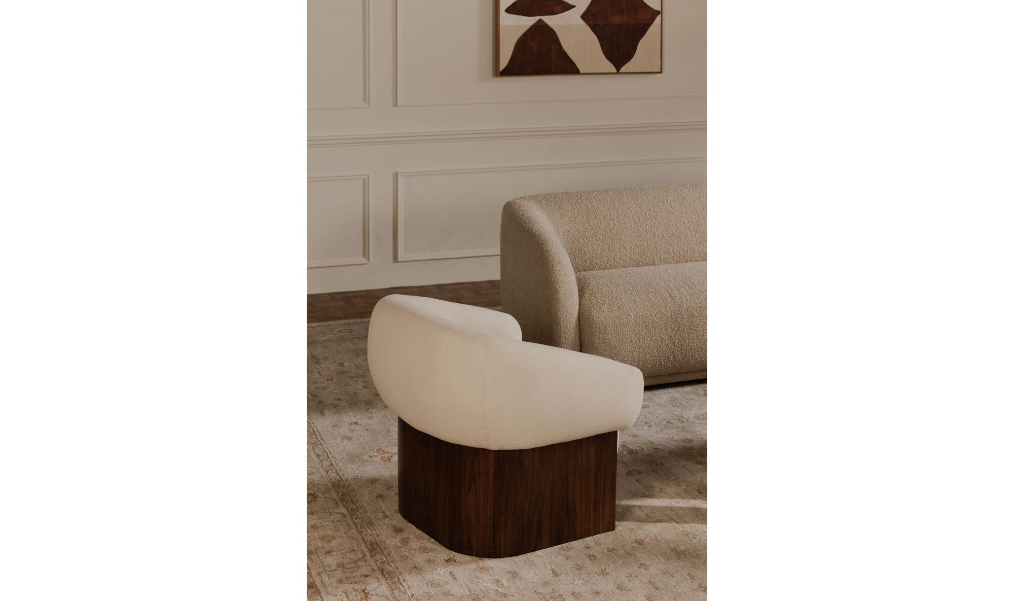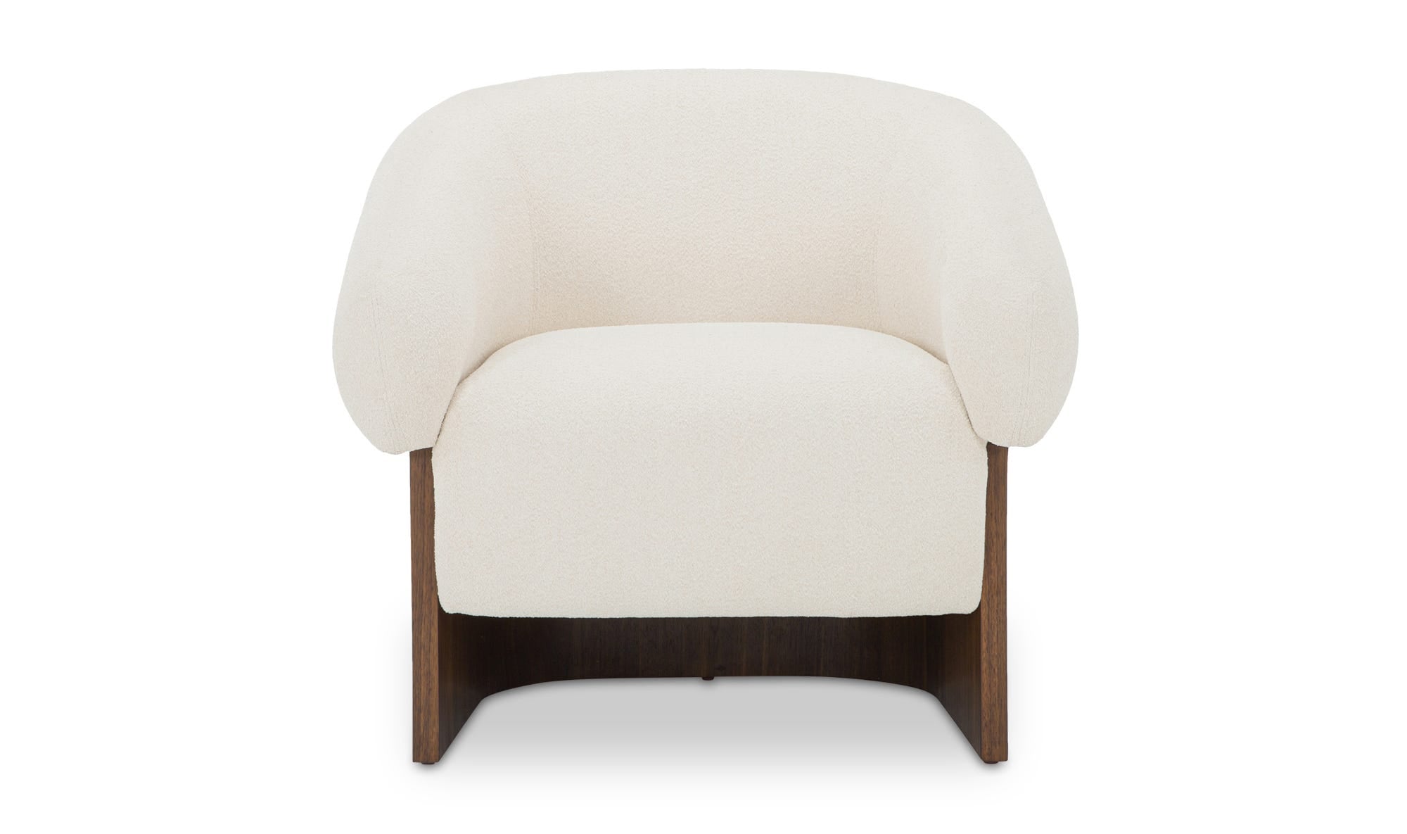The Otto accent chair merges the robust grace of a walnut veneer over solid rubber wood base with the delicate comfort of a plush, curved back and upholstered in a flecked micro bouclé of 100% recycled GRS-certified polyester that is OEKO Tex 100. With its nuanced texture, this piece floats atop a wooden foundation that brings lightness into any space.
