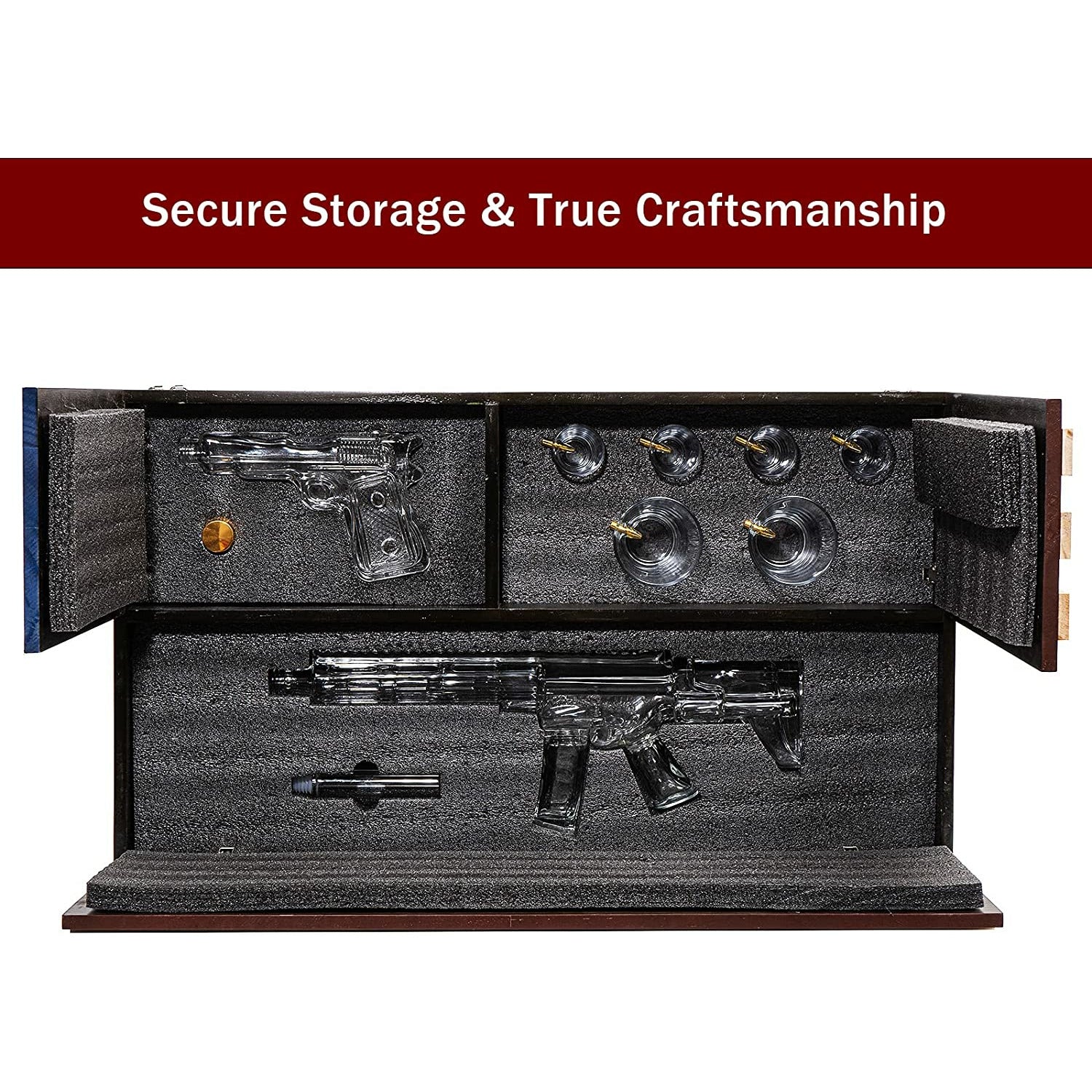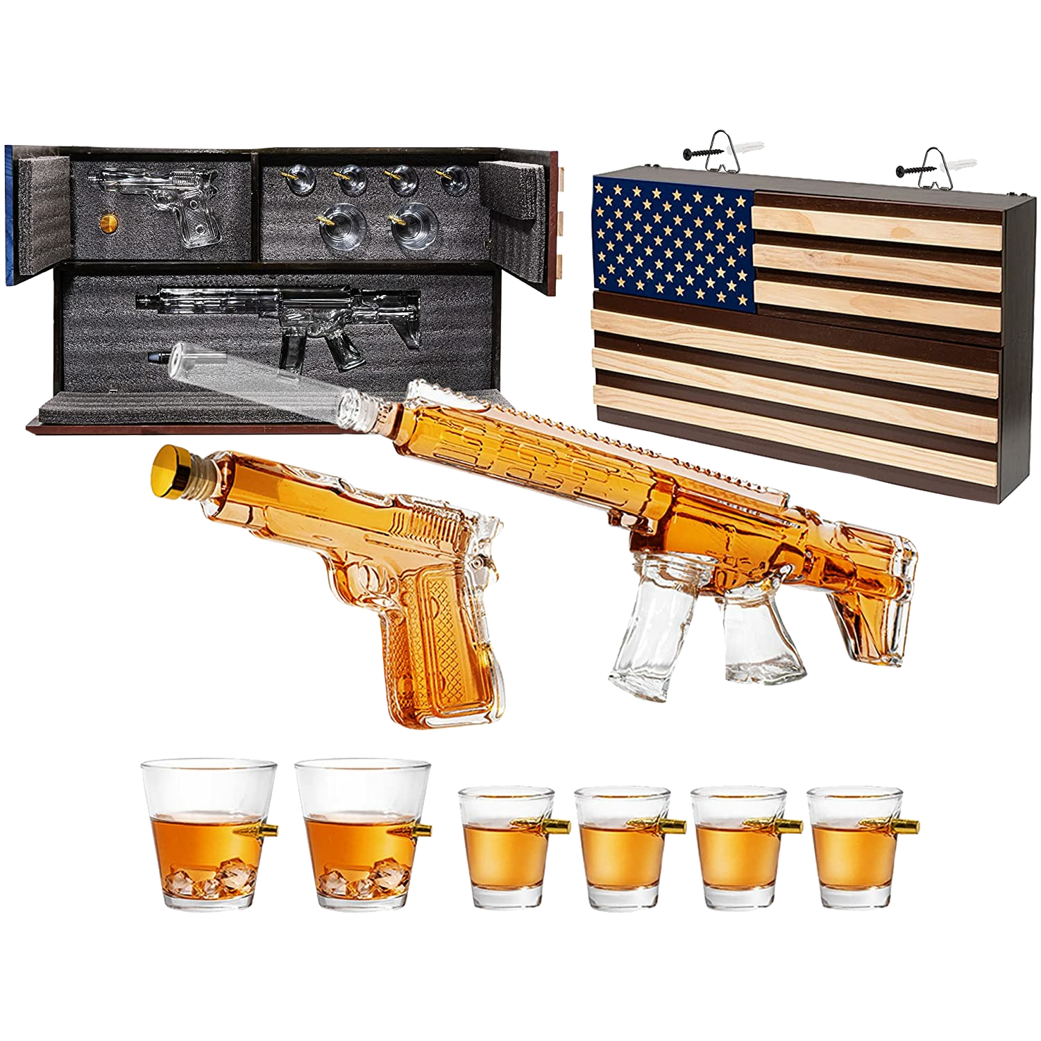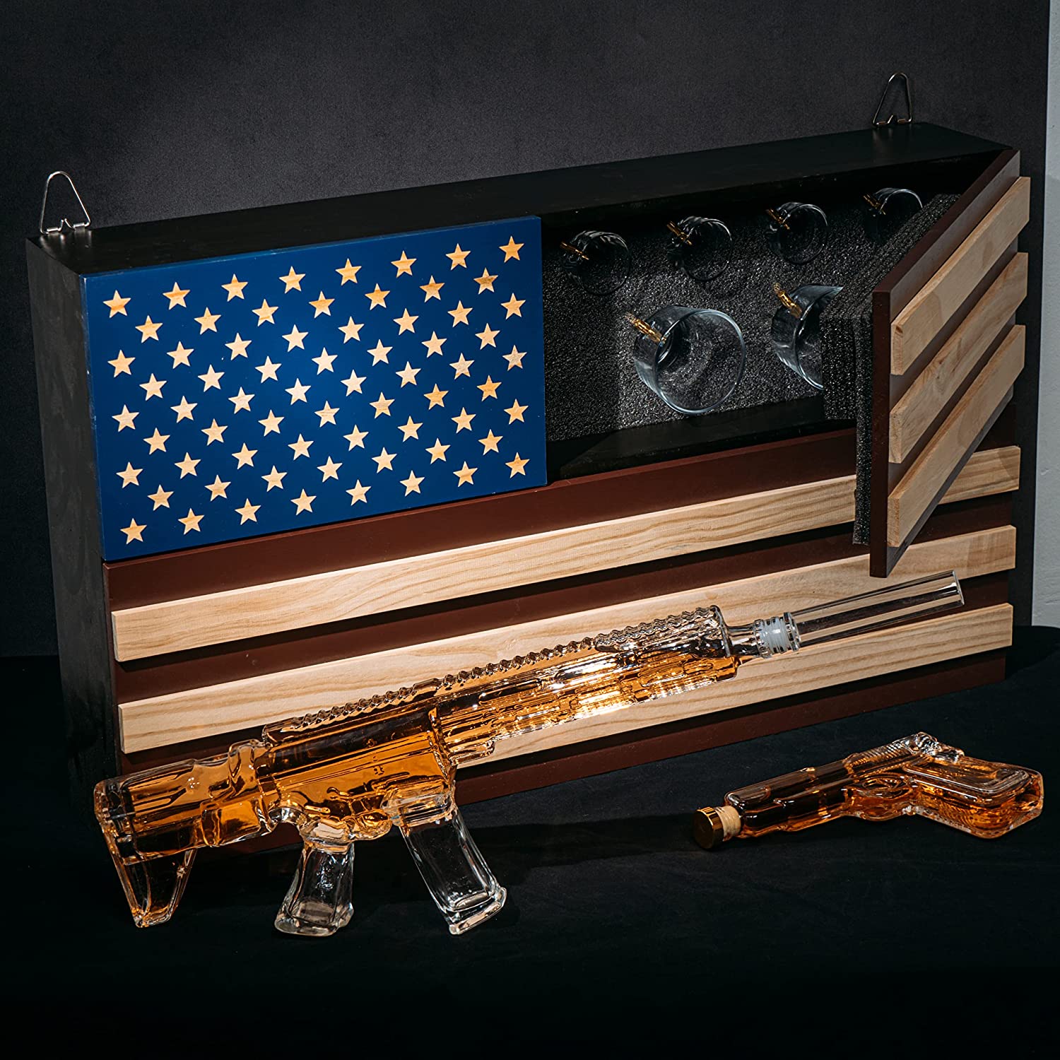 AR15 Whiskey Gun Decanter Flag Set - 1000ml Rifle & Pistol Set - Hanging Storage American Flag Gift Box & Bullet Glasses & Shot Glass, Great Gift for Army, Navy, Marines, Veterans & Gun Enthusiasts