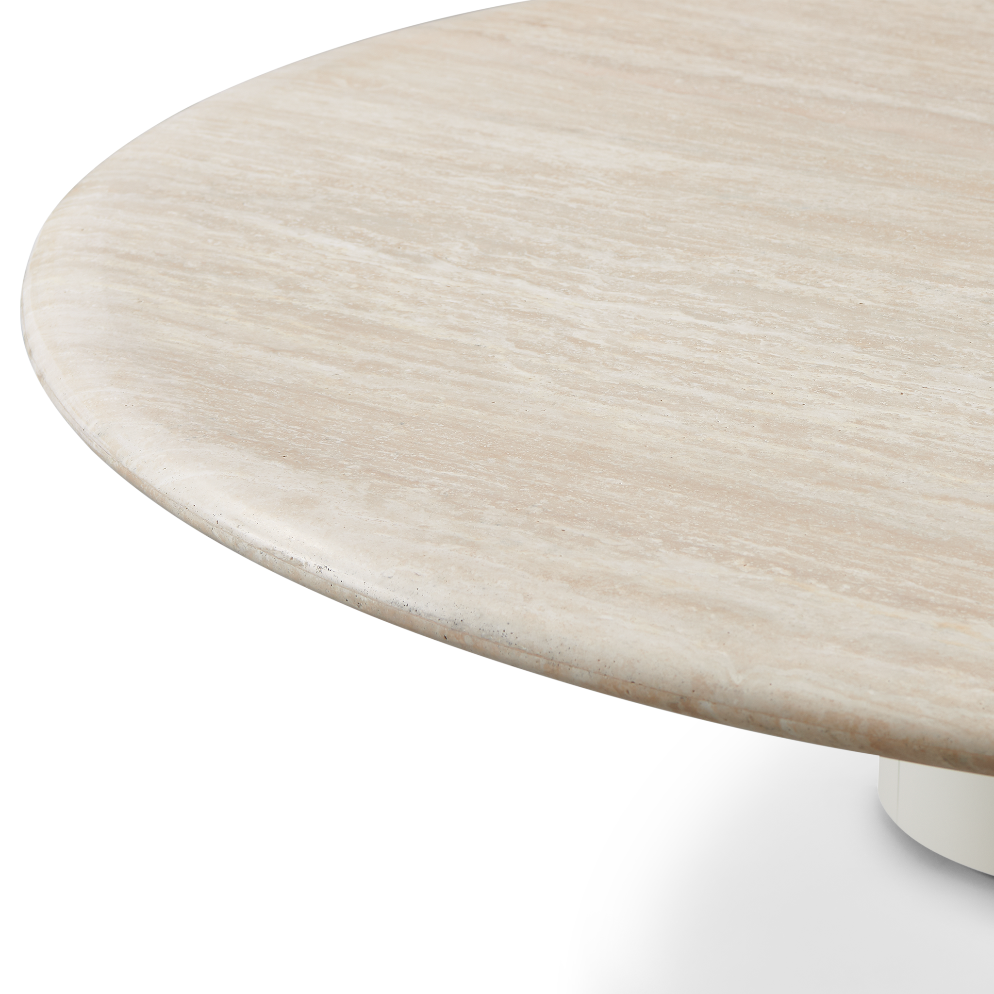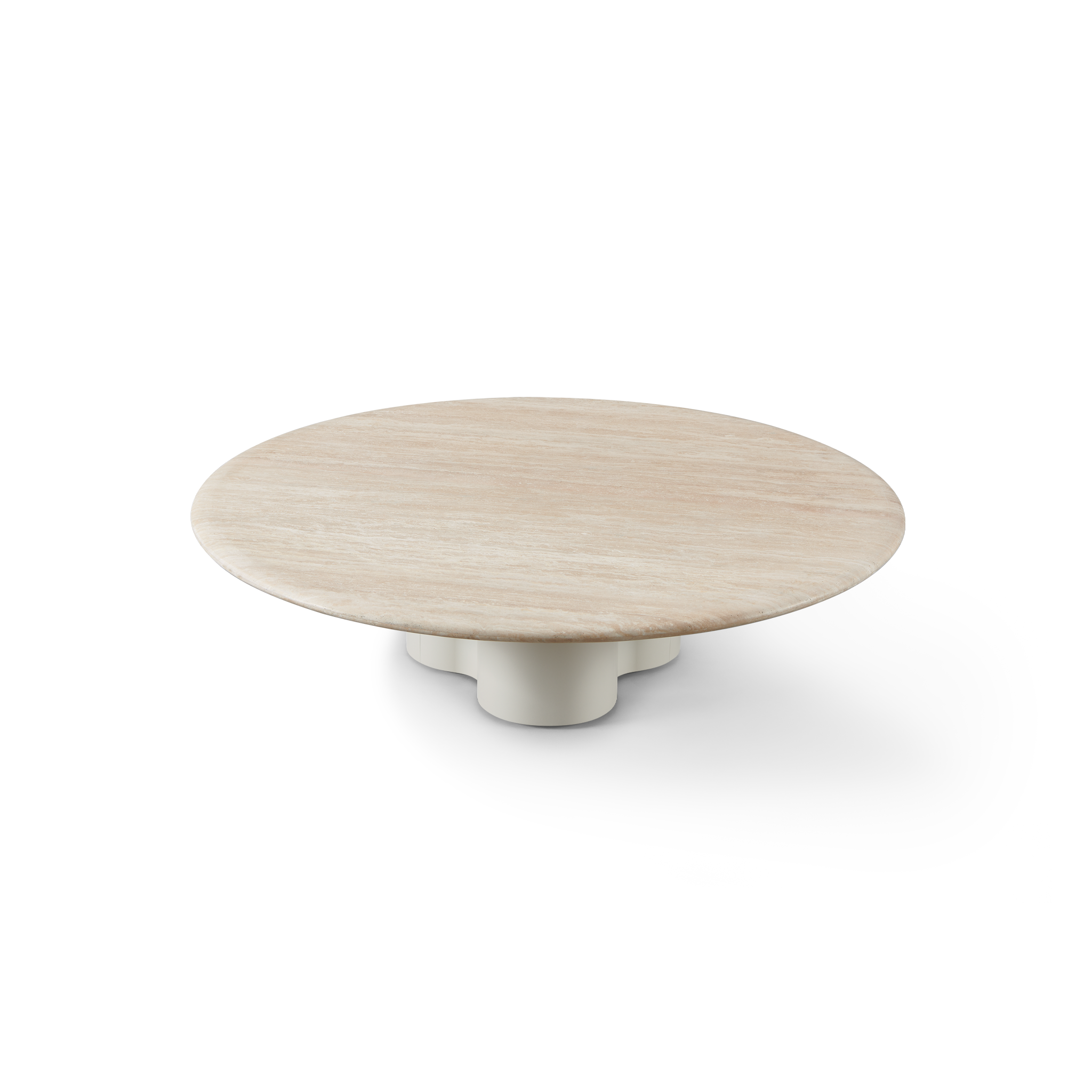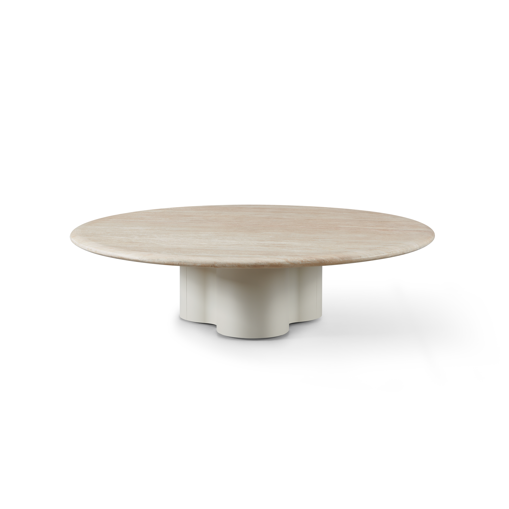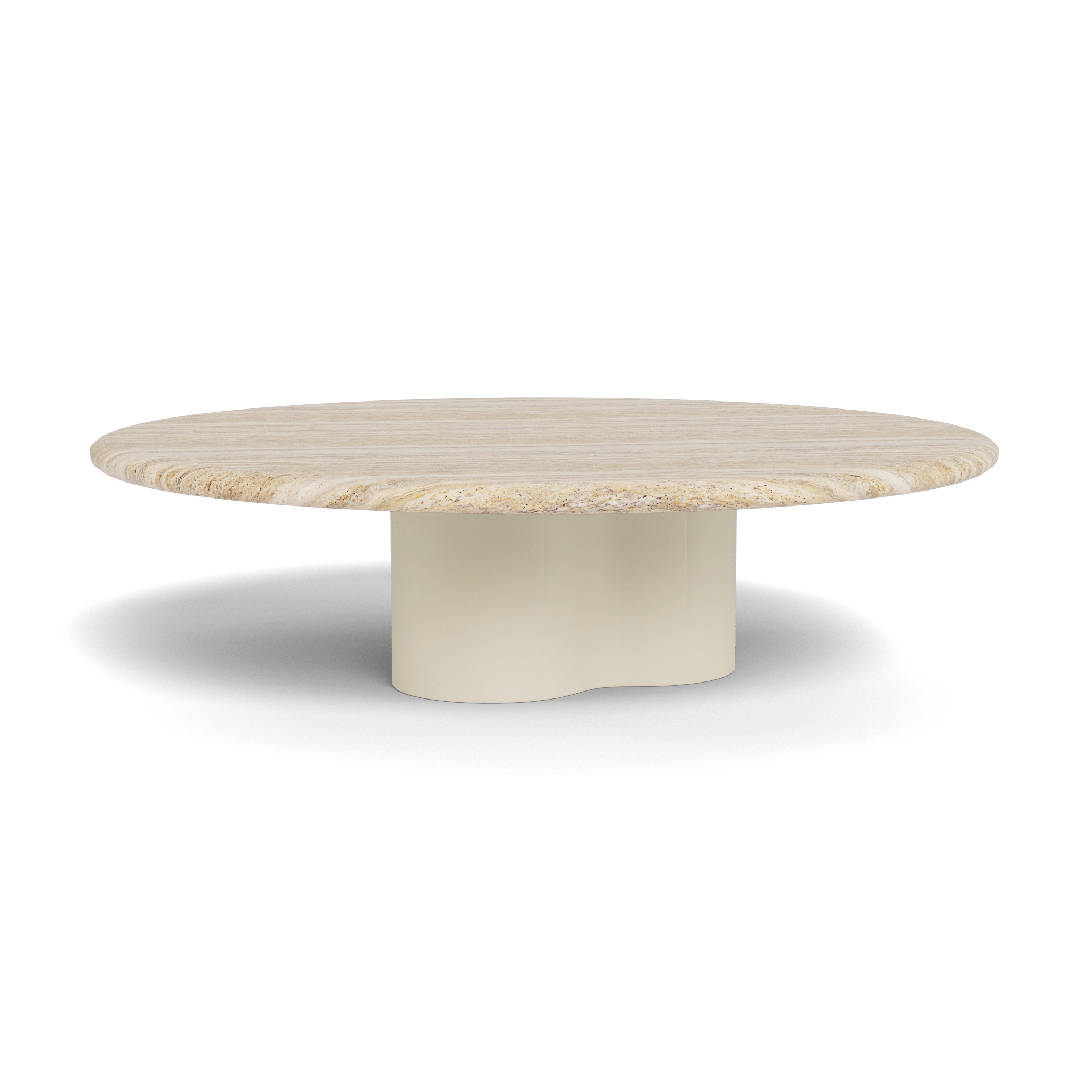 A contemporary and classic study in soft curves, our Porto collection creates a natural interplay between shadow and light with sculptural forms in the base. The mixed–material Porto Round Coffee Table 48" anchors your outdoor seating set — featuring a softly curved powder coated aluminum base in Aluminum Bone suspending an organic travertine stone top in Natural with a gentle, sloping bullnose edge. The compact circular shape of the table top pairs nicely with a variety of configurations and vignettes. The contrasting aluminum base introduces texture and a subtle sheen against the coolness of the travertine. This unique outdoor coffee table elevates a variety of spaces. Also available in an all–stone base and top.