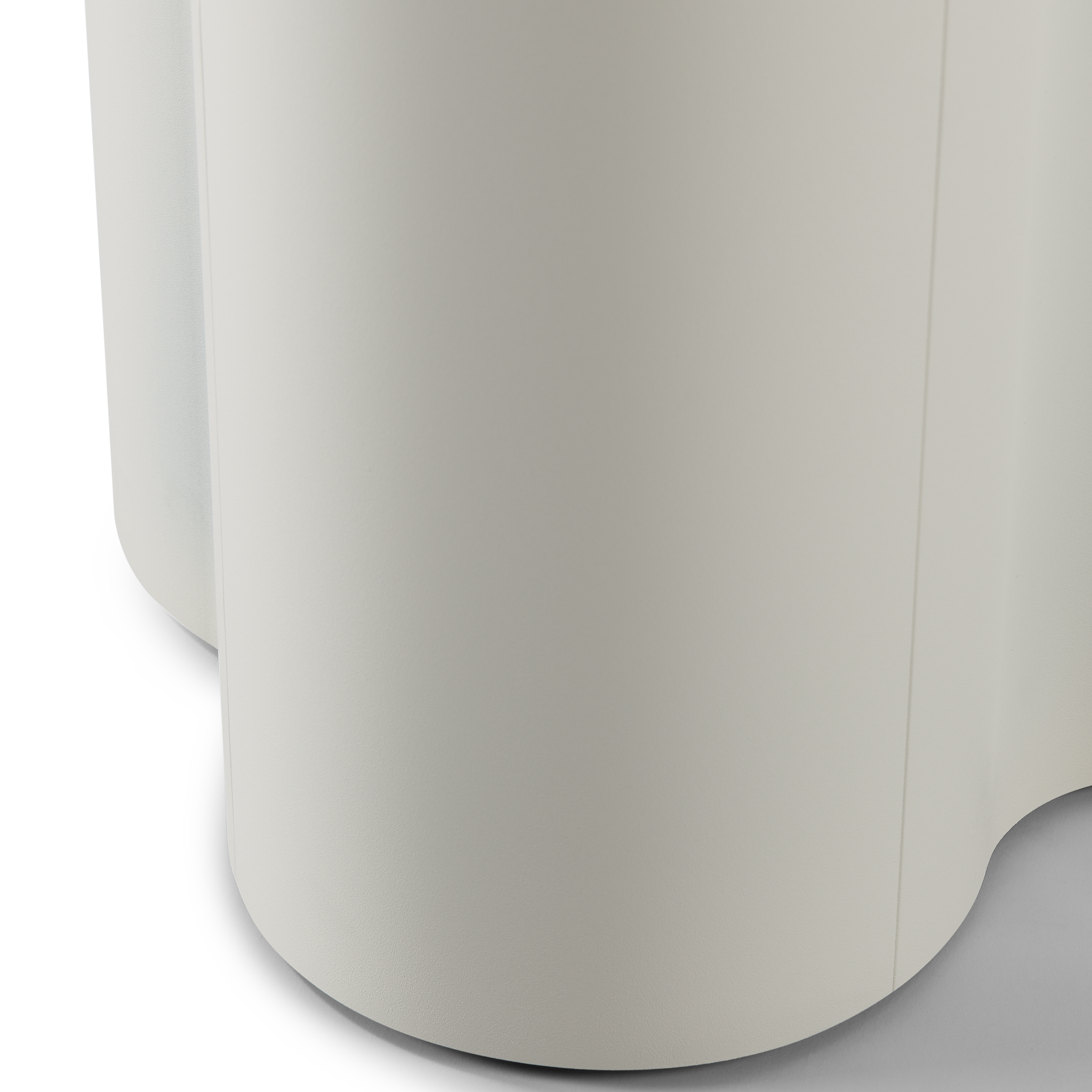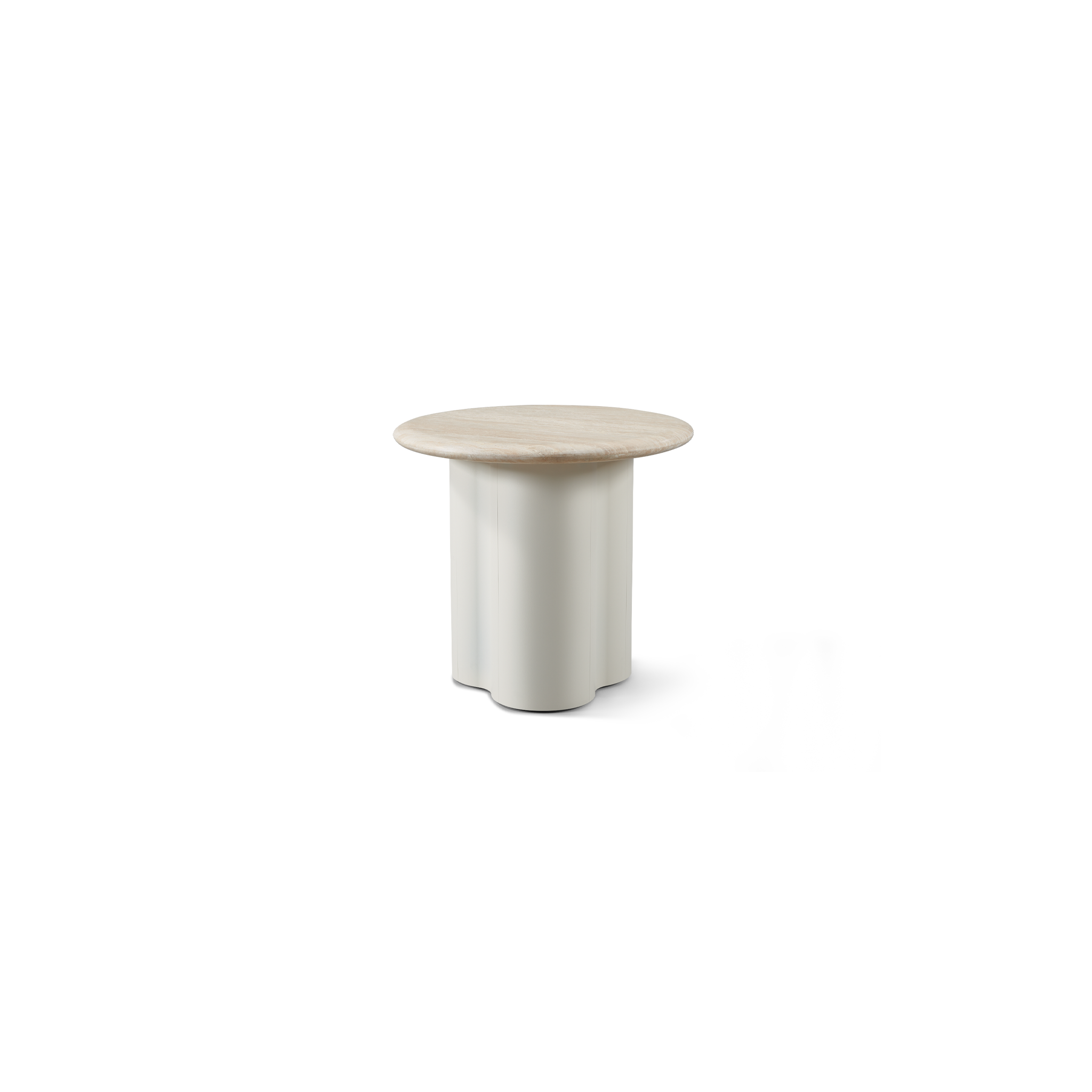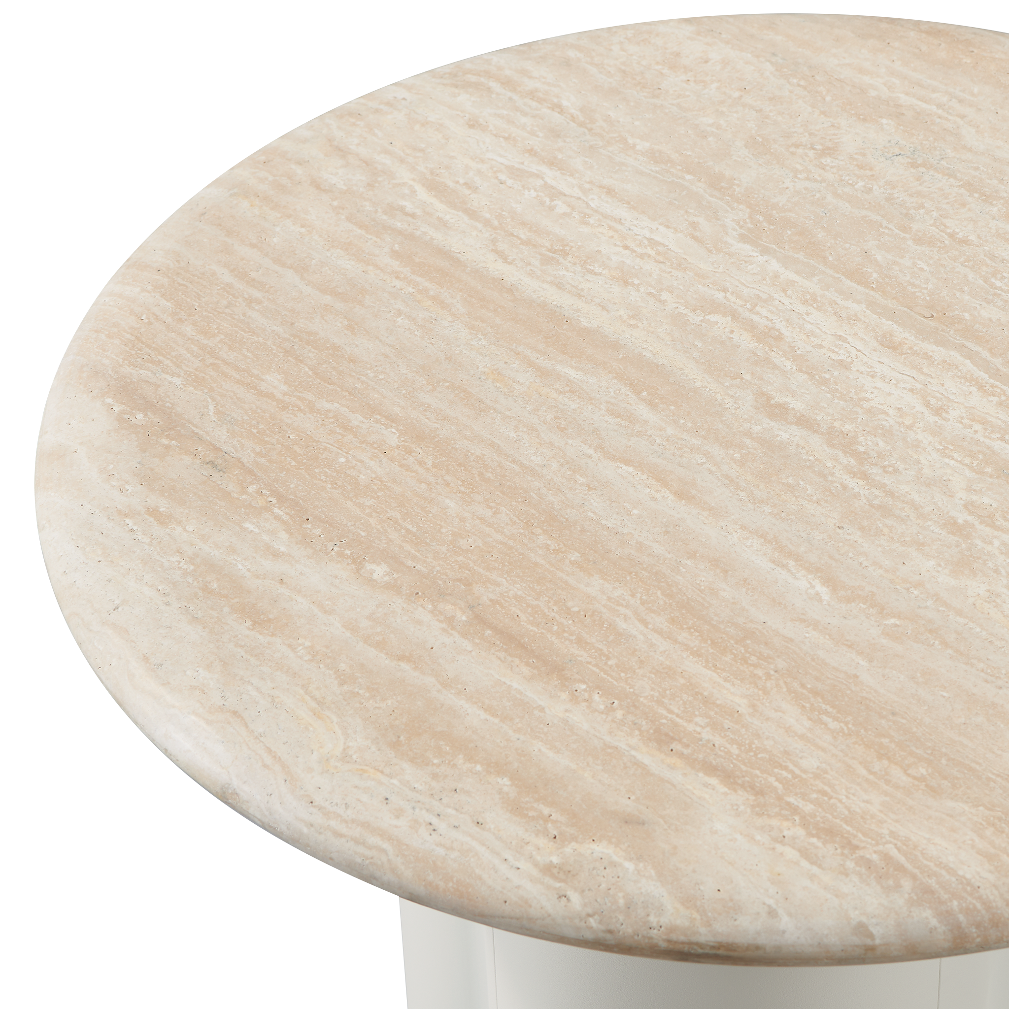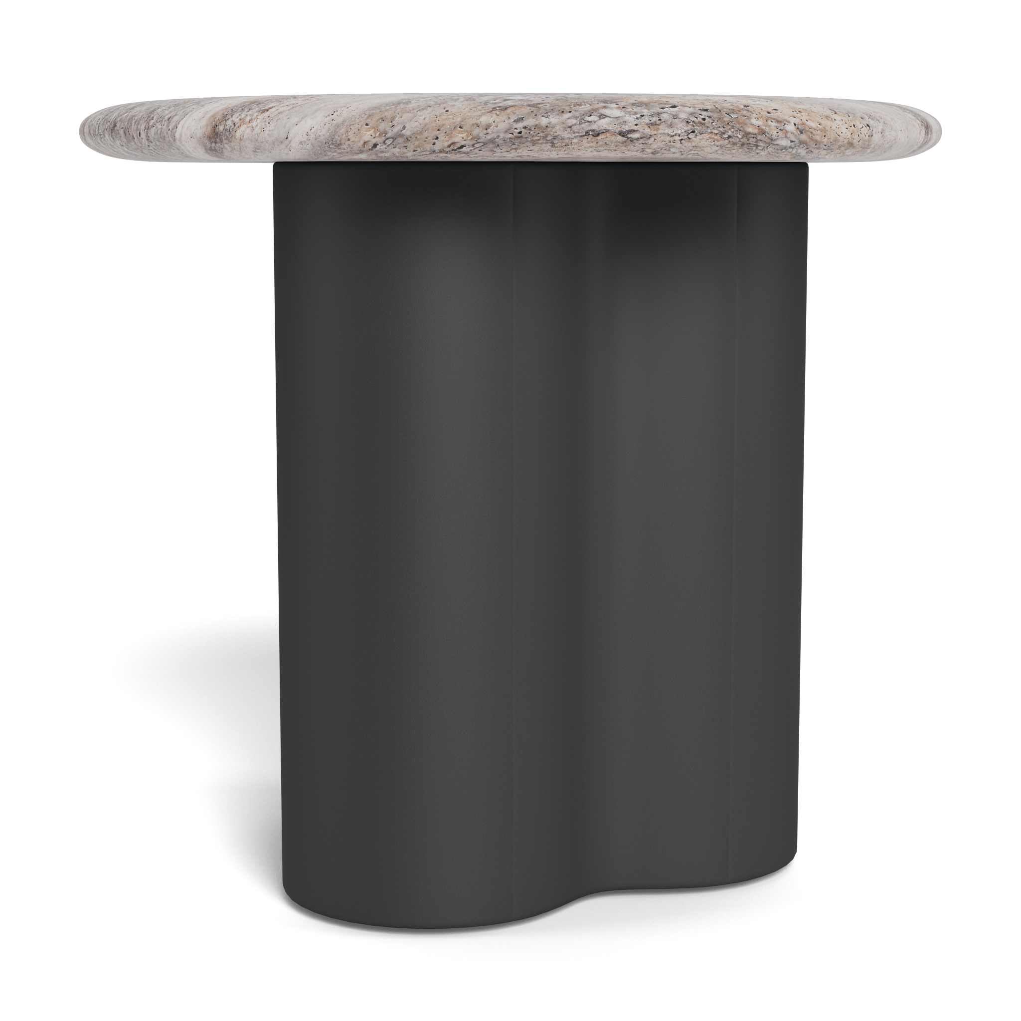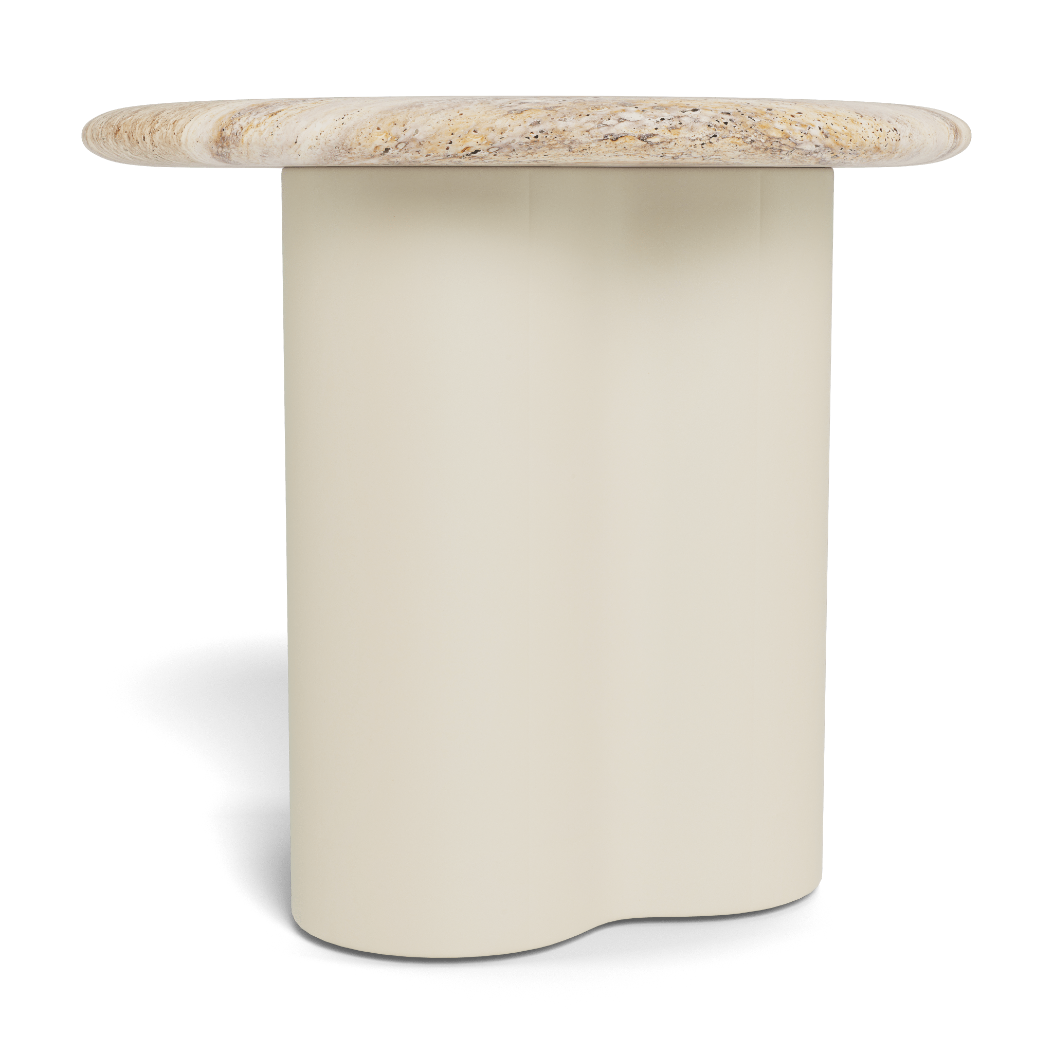 A contemporary and classic study in soft curves, our Porto collection creates a natural interplay between shadow and light with sculptural forms in the base. The mixed–material Porto Round Side Table 22" complements your outdoor seating set — featuring a softly curved powder coated aluminum base in Aluminum Bone suspending an organic travertine stone top in Natural with a gentle, sloping bullnose edge. The contrasting aluminum base introduces texture and a subtle sheen against the coolness of the travertine. A classic round side table, this piece is built for outdoor living by the pool or in nature and pairs nicely with a variety of furniture. Also available in an all–stone base and top.
