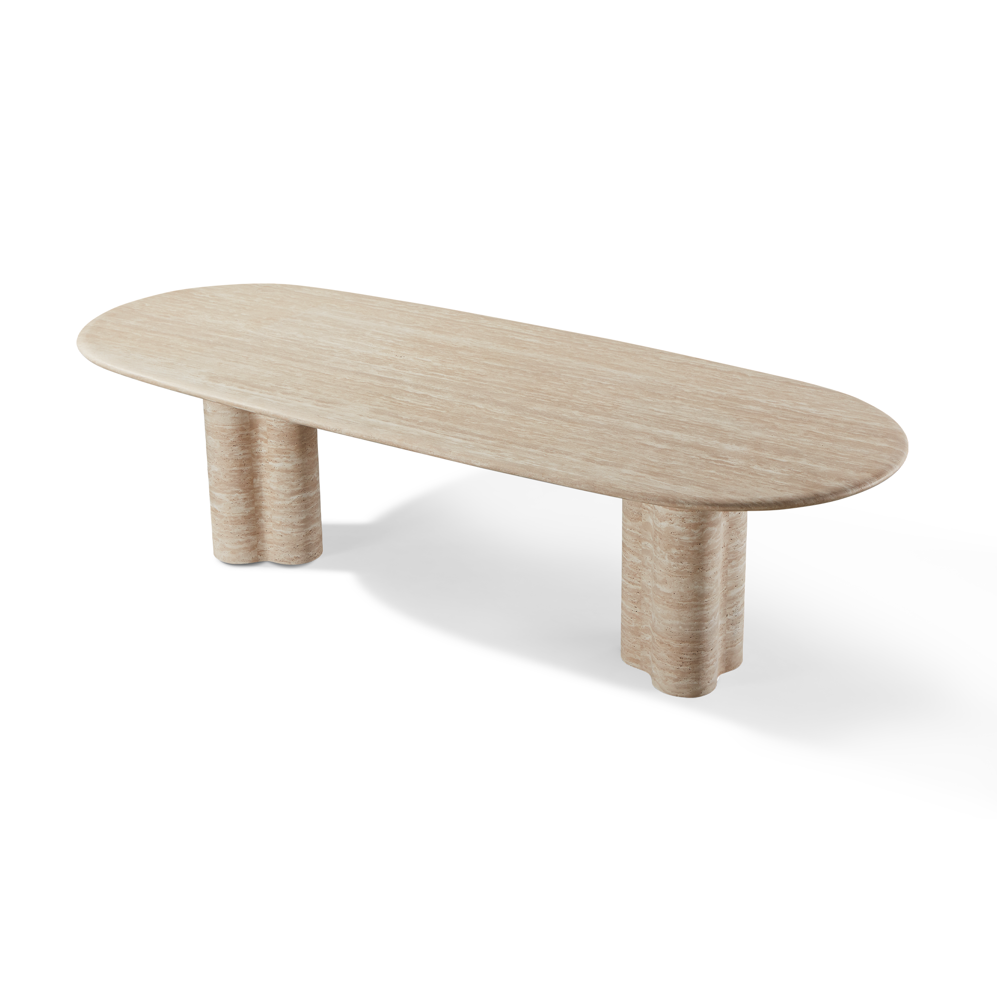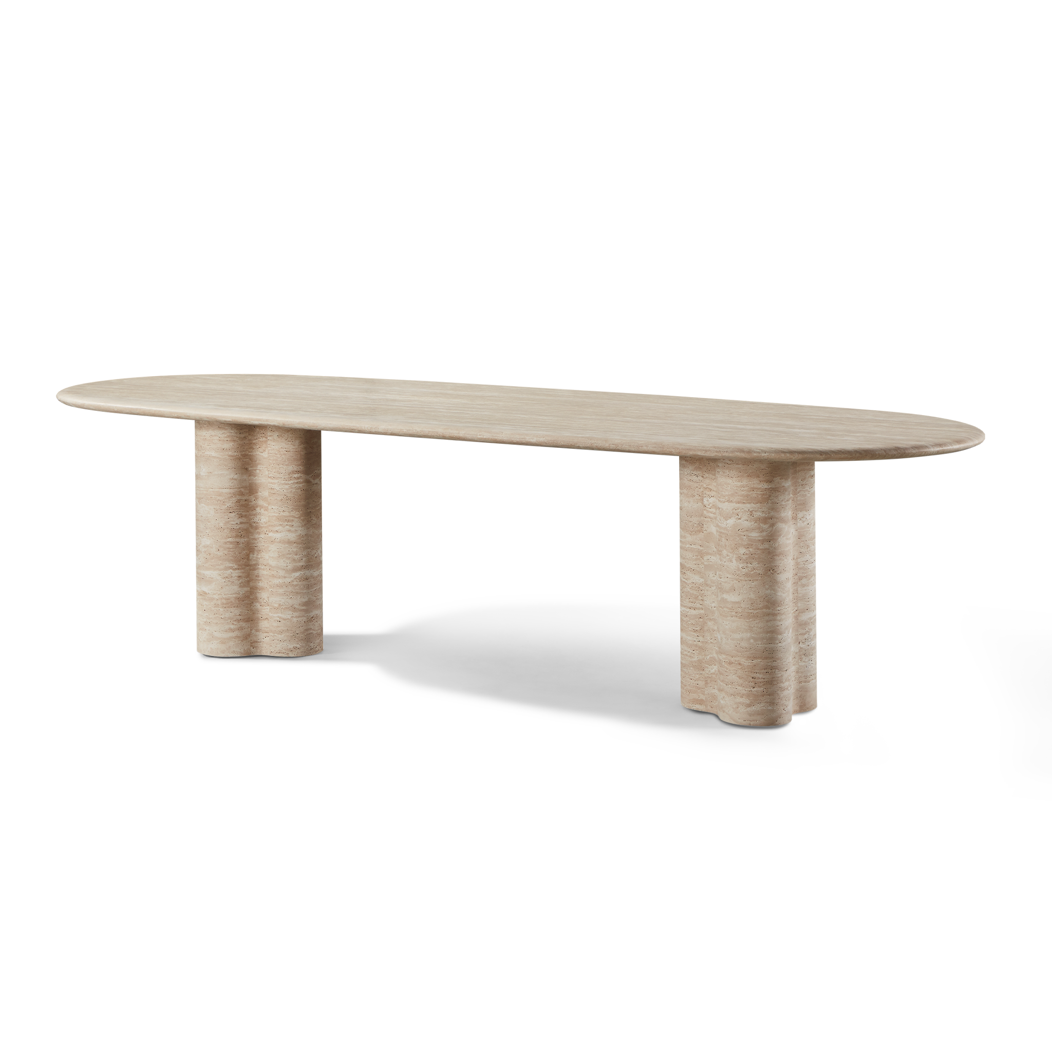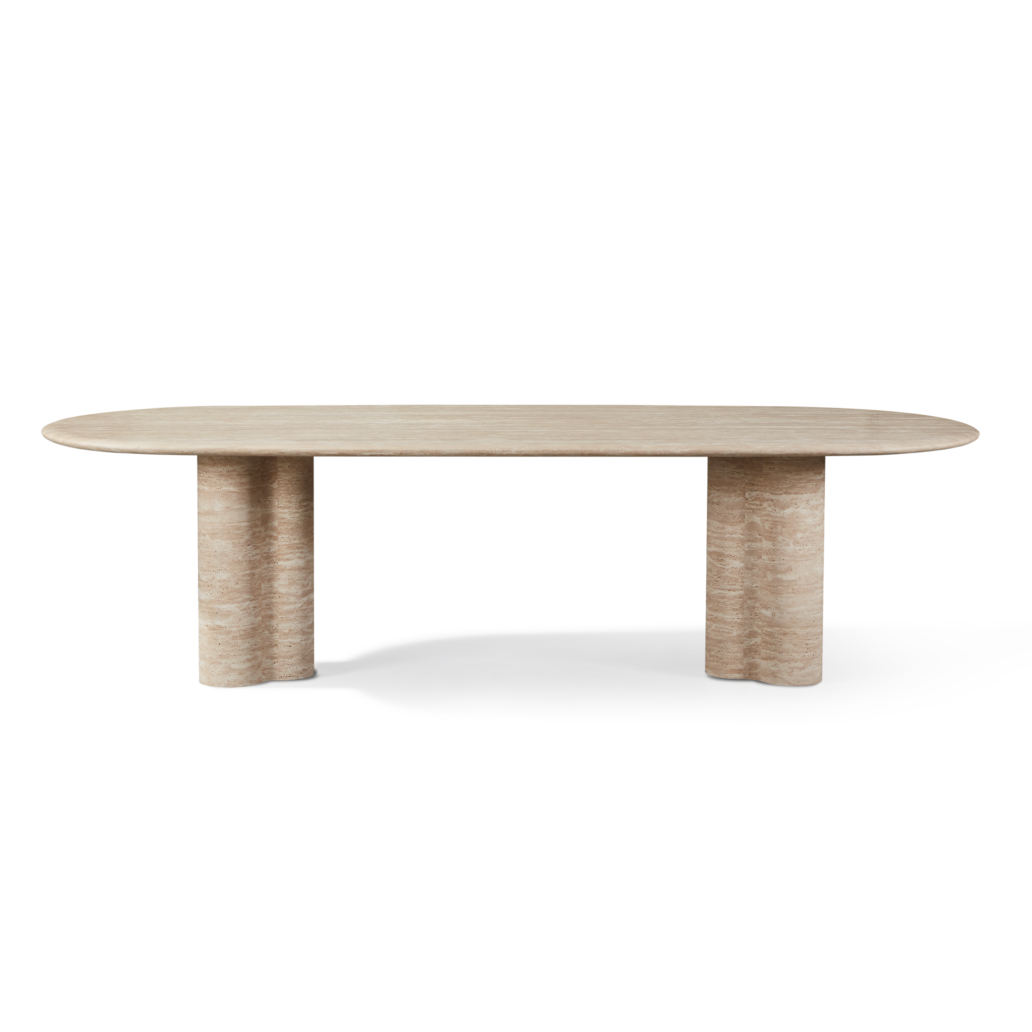 A contemporary and classic study in soft curves, our Porto collection creates a natural interplay between shadow and light with sculptural forms in the base. The Porto Pill Dining Table 108" anchors your outdoor dining set — featuring a pair of robust travertine bases suspending an organic travertine stone top all in Natural with a gentle, sloping bullnose edge. The unique long pill shape of the table top curves around the edges for an unexpected contemporary touch. This unique outdoor dining table is a showpiece that highlights the natural combination of fine materials and expert craftsmanship. Also available in an aluminum base. Pair it with any dining chair to complete your outdoor dining set.