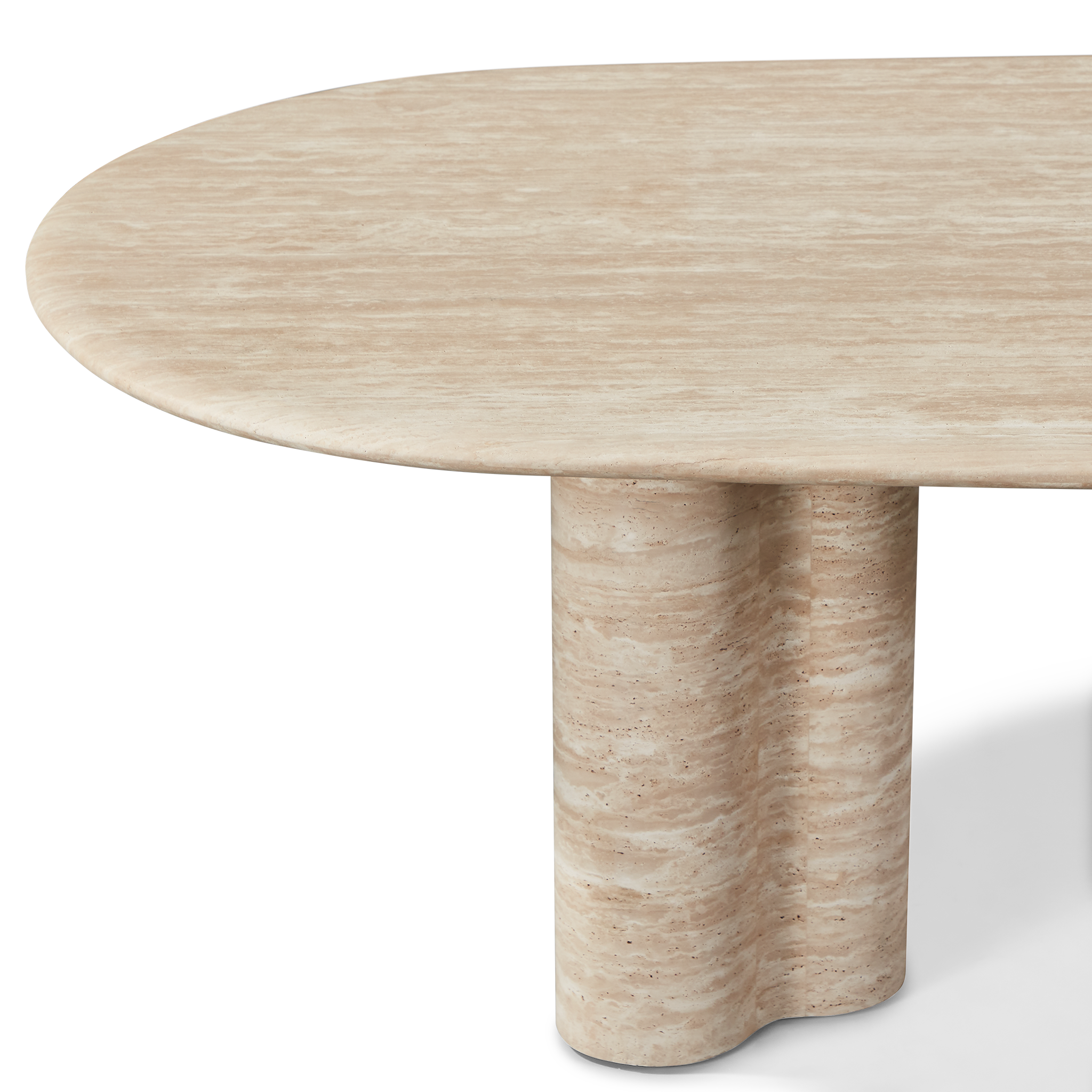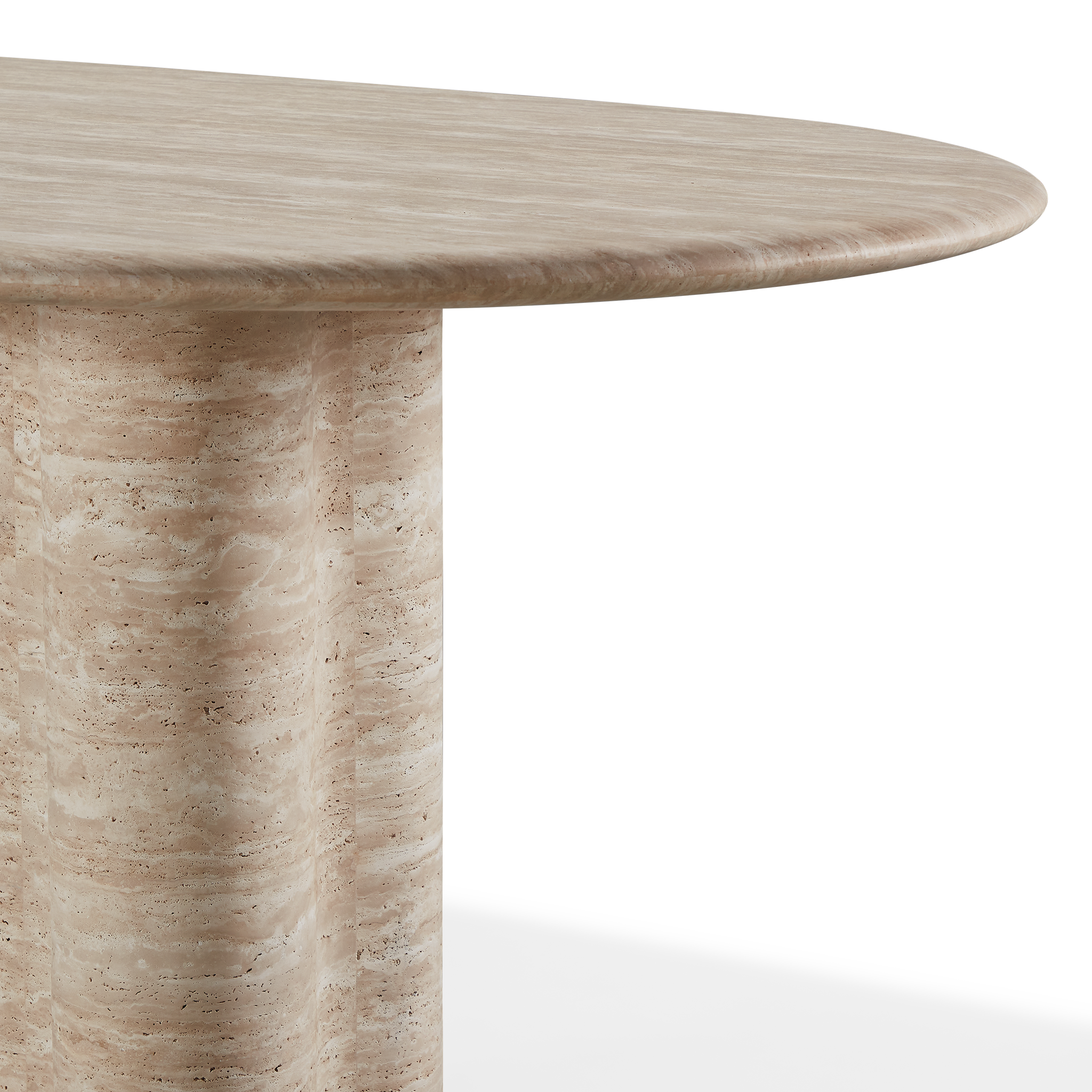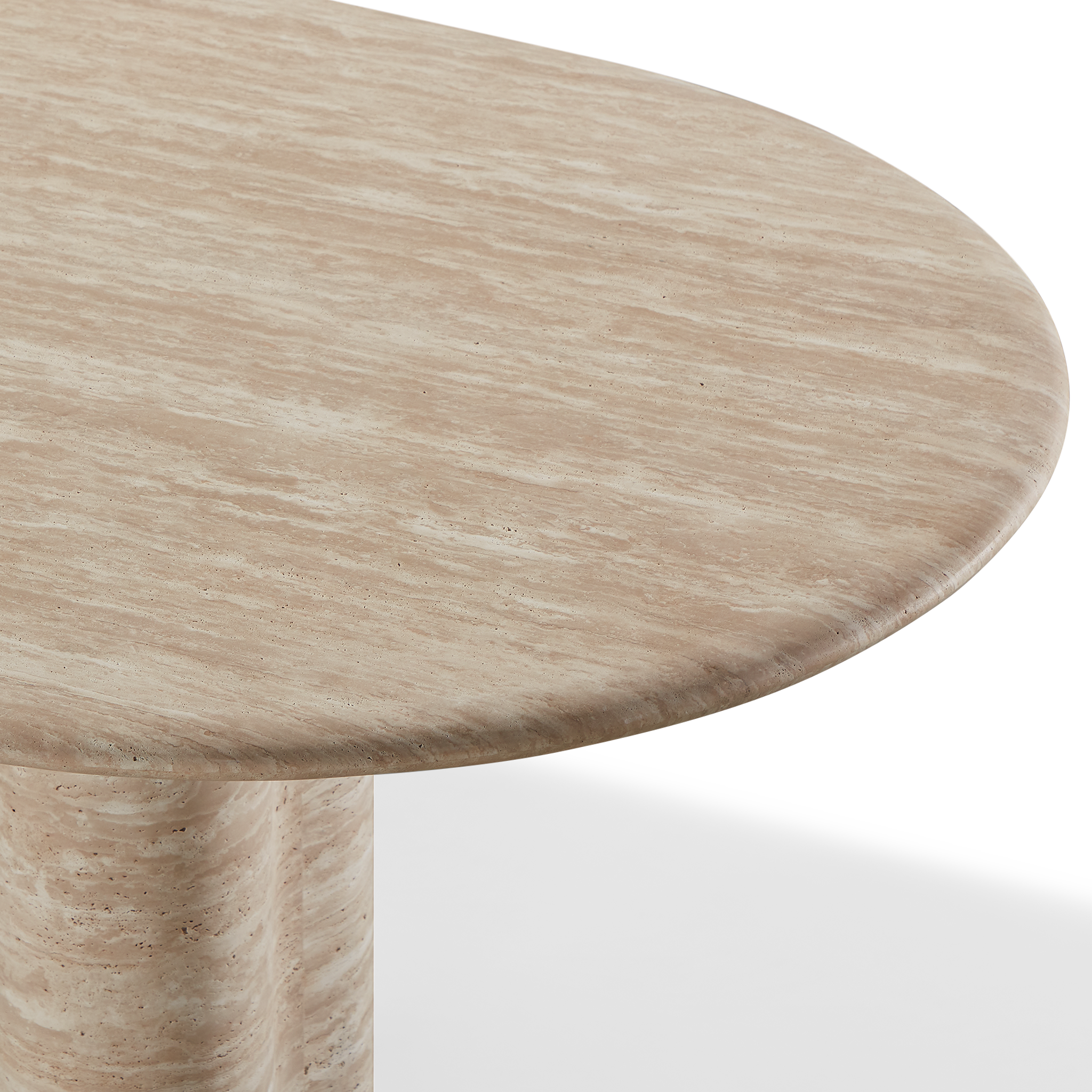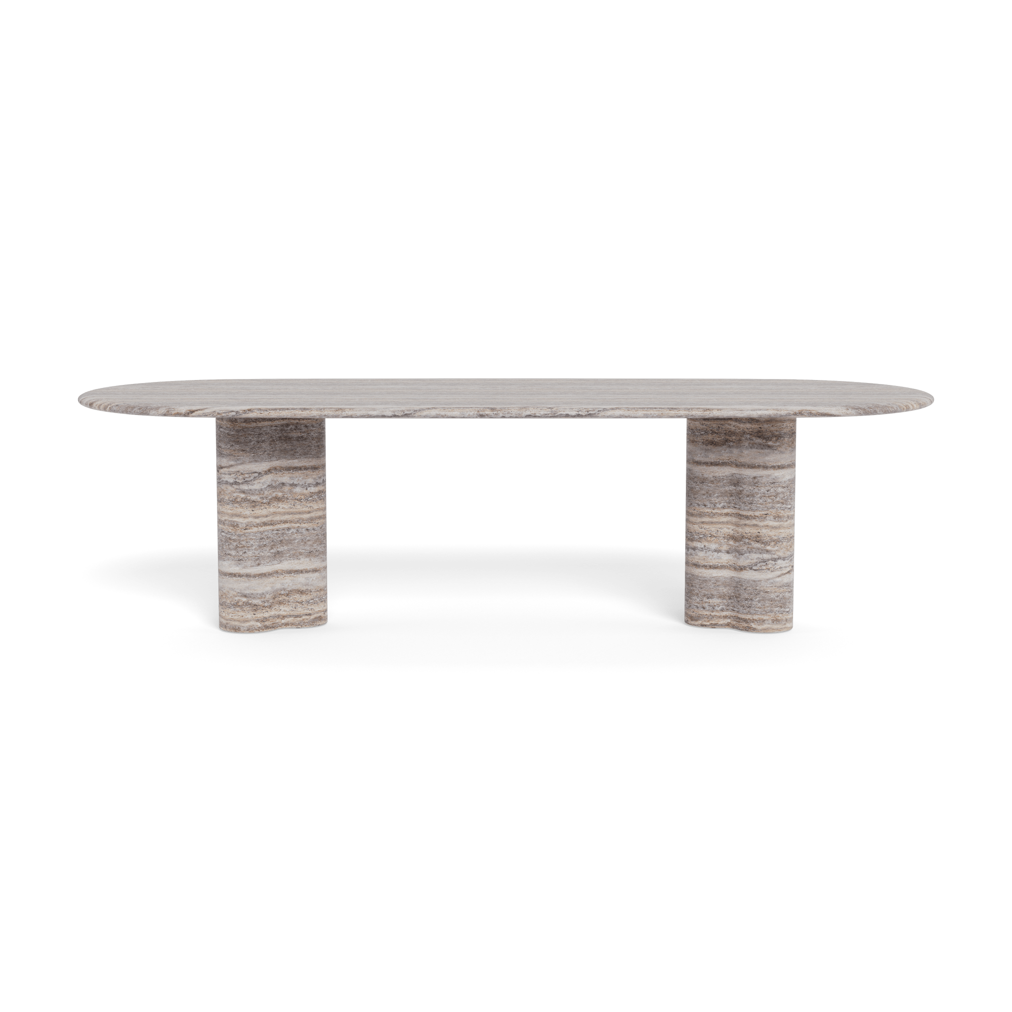 A contemporary and classic study in soft curves, our Porto collection creates a natural interplay between shadow and light with sculptural forms in the base. The Porto Pill Dining Table 108" anchors your outdoor dining set — featuring a pair of robust travertine bases suspending an organic travertine stone top all in Natural with a gentle, sloping bullnose edge. The unique long pill shape of the table top curves around the edges for an unexpected contemporary touch. This unique outdoor dining table is a showpiece that highlights the natural combination of fine materials and expert craftsmanship. Also available in an aluminum base. Pair it with any dining chair to complete your outdoor dining set.