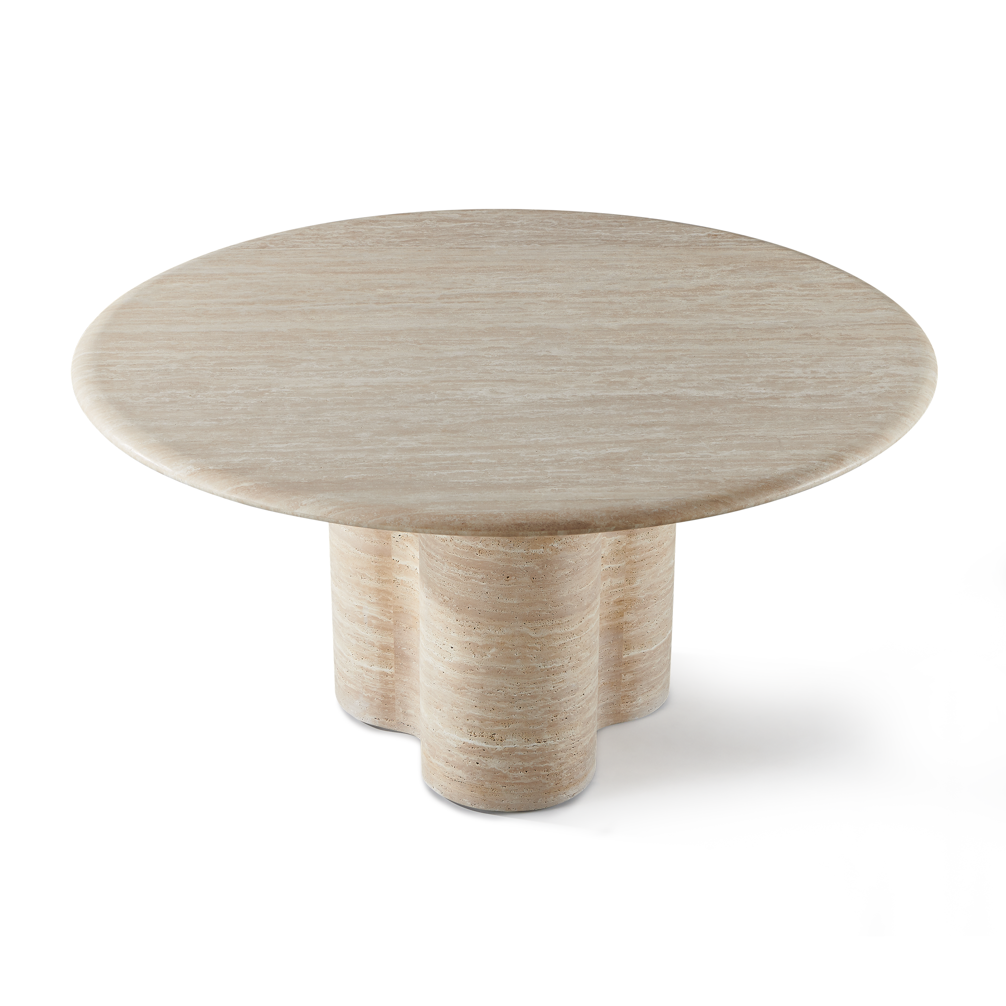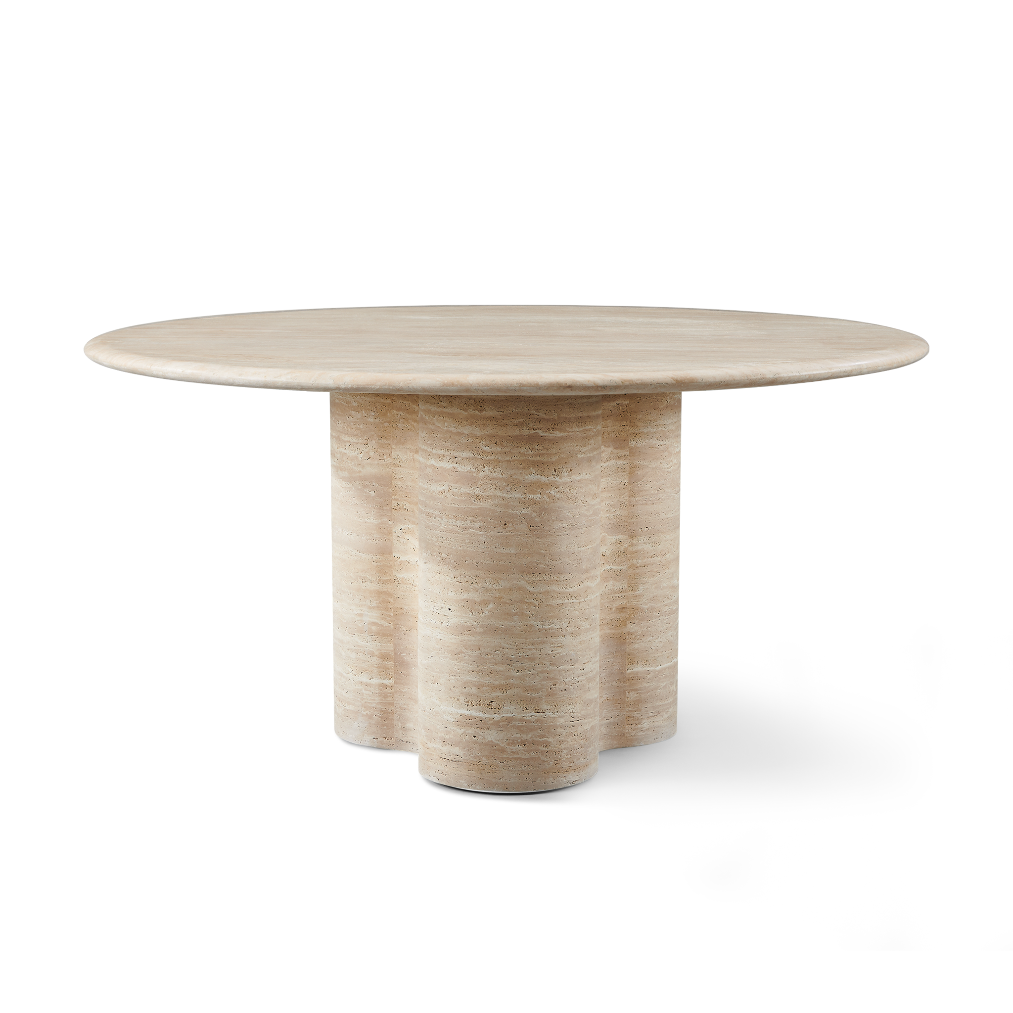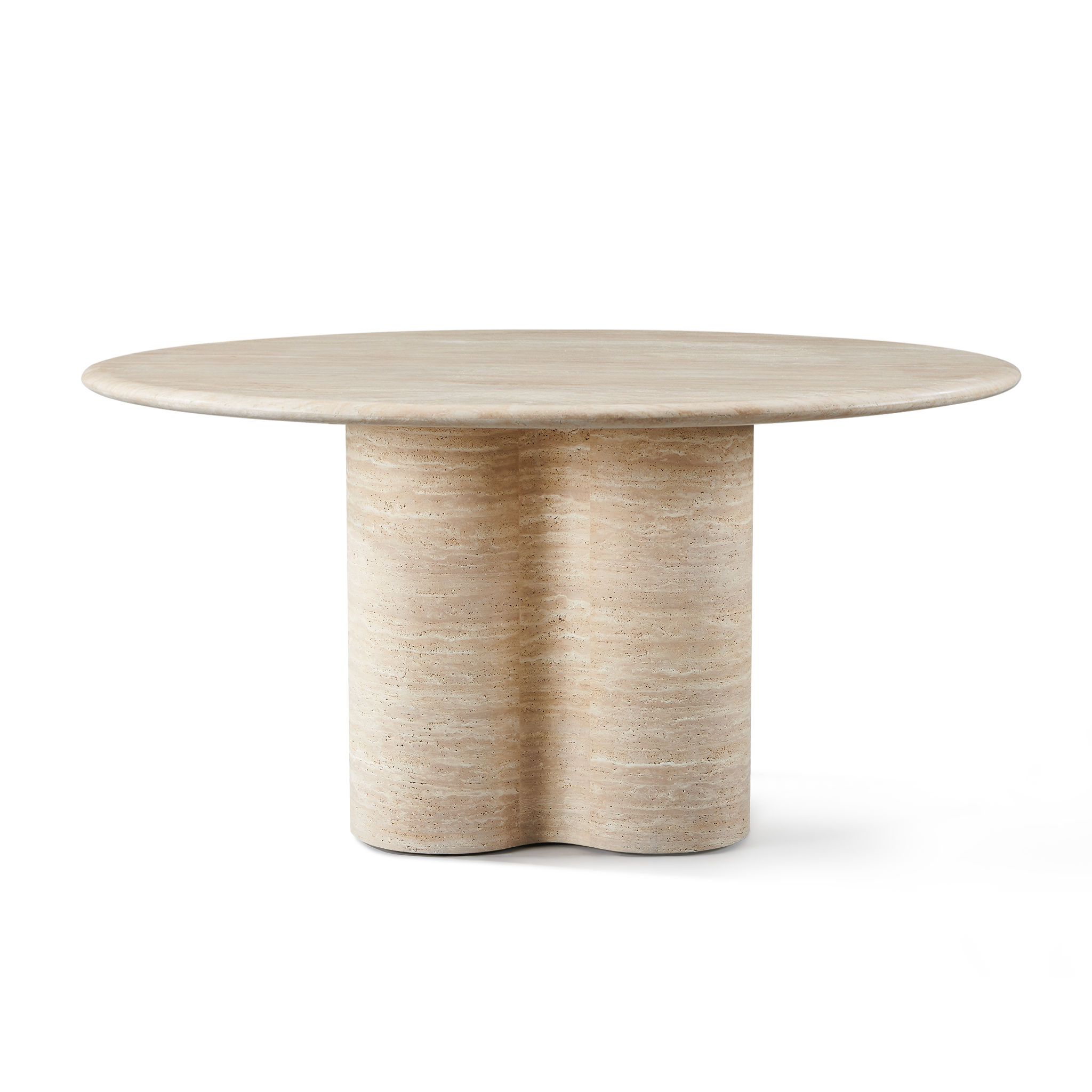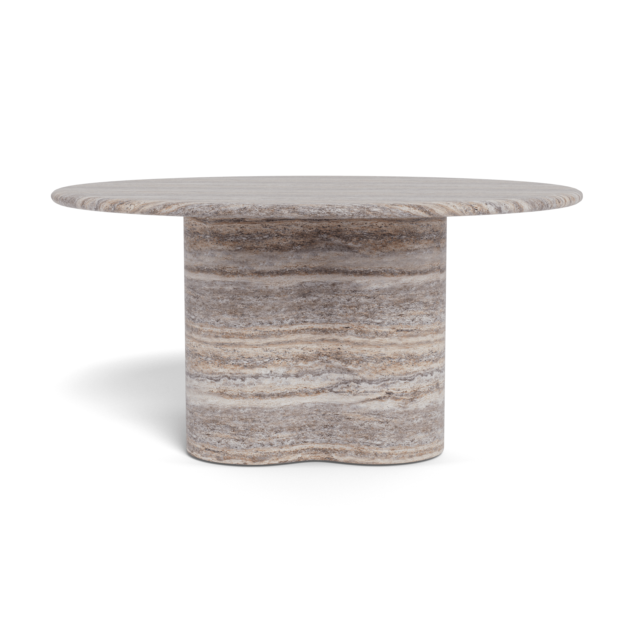 A contemporary and classic study in soft curves, our Porto collection creates a natural interplay between shadow and light with sculptural forms in the base. The mixed–material Porto Round Dining Table 60" anchors your outdoor dining set — featuring a robust travertine base suspending a travertine stone top all in Natural with a gentle, sloping bullnose edge. With seating for up to six, this unique outdoor dining table is a showpiece that highlights the natural combination of fine materials and expert craftsmanship. Also available in an aluminum base. Pair it with any dining chair to complete your outdoor dining set.
