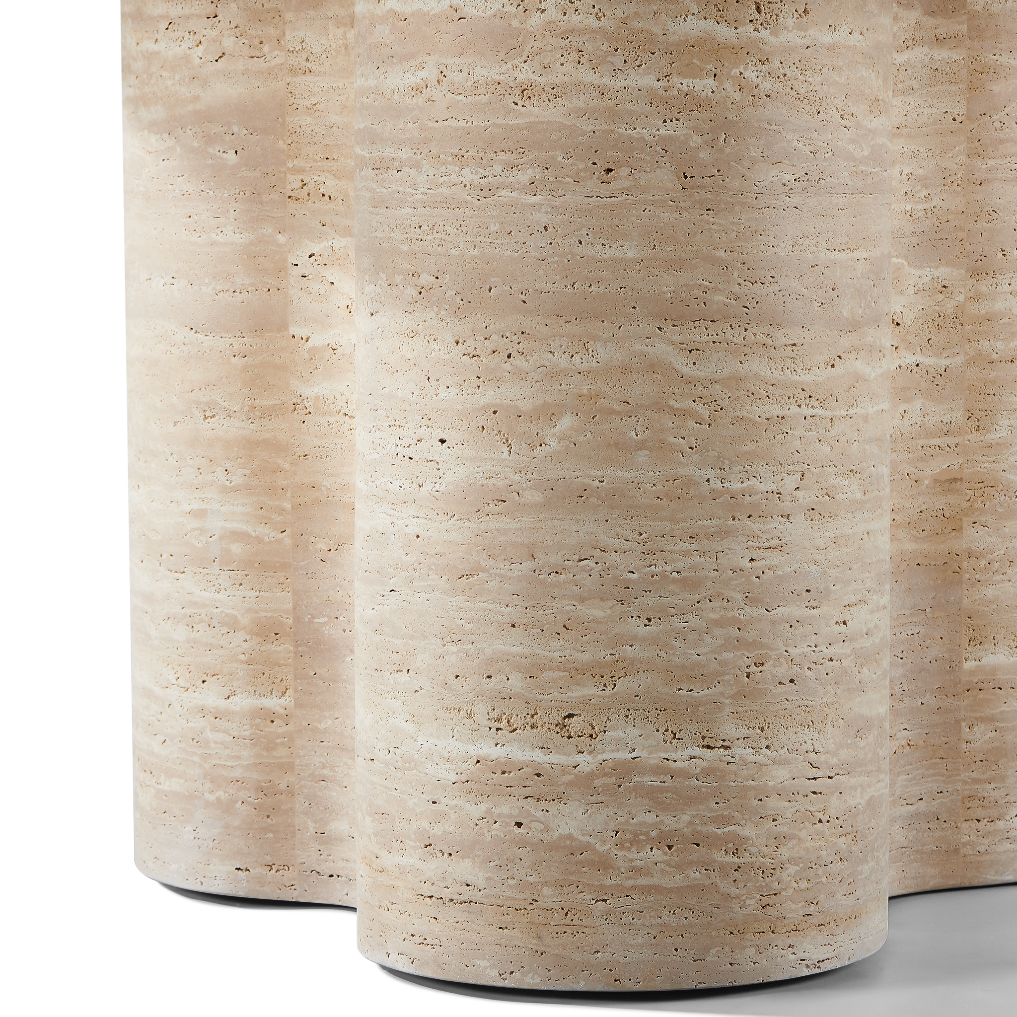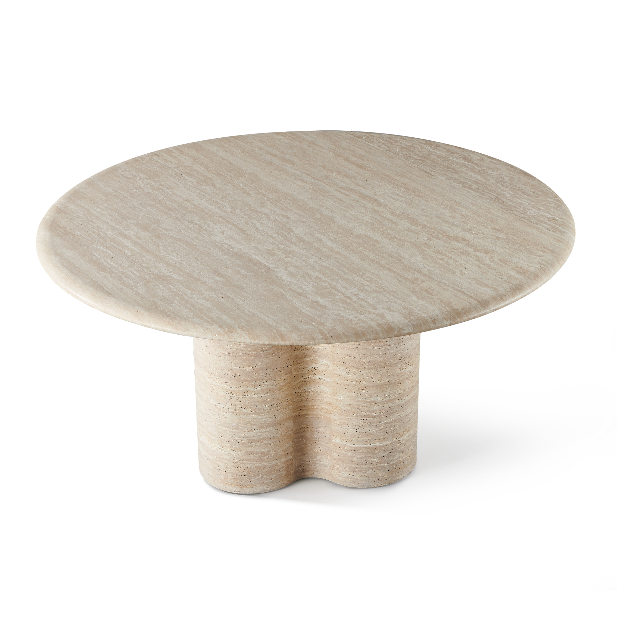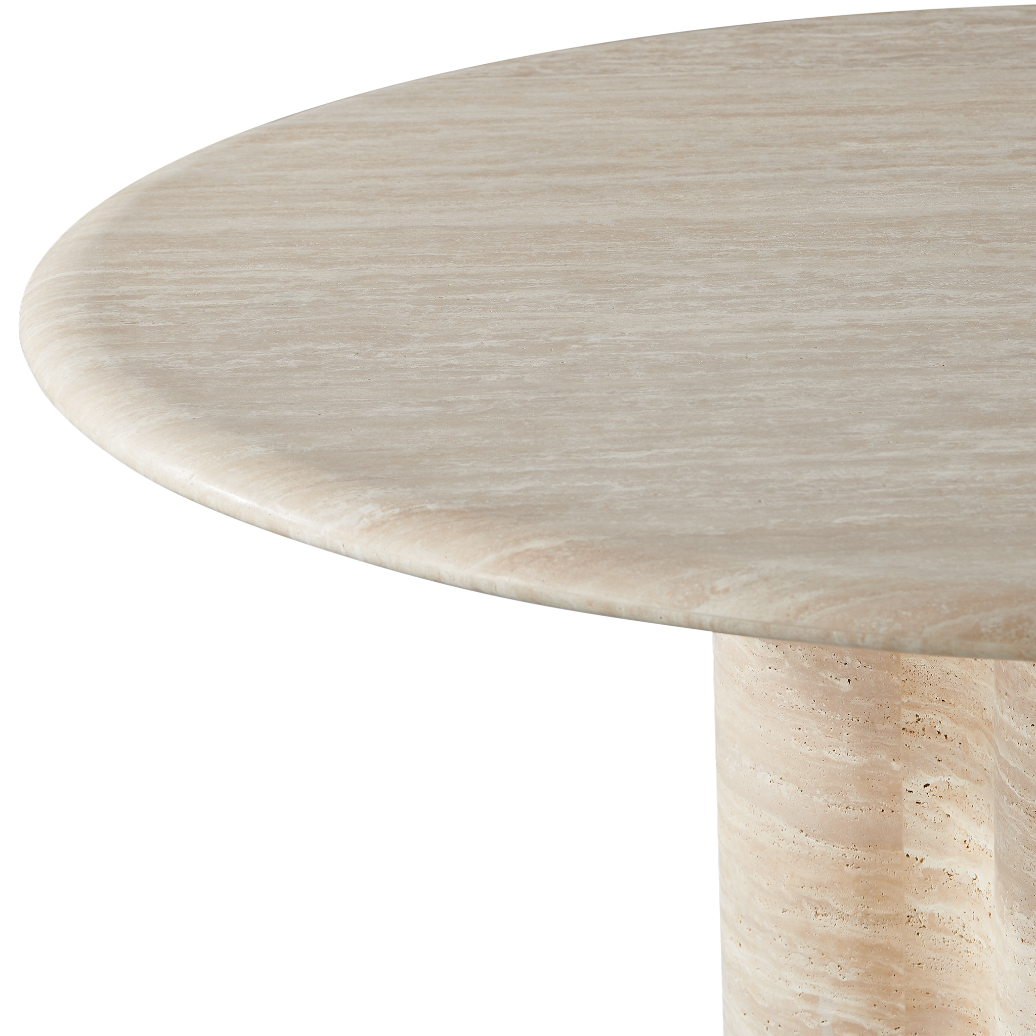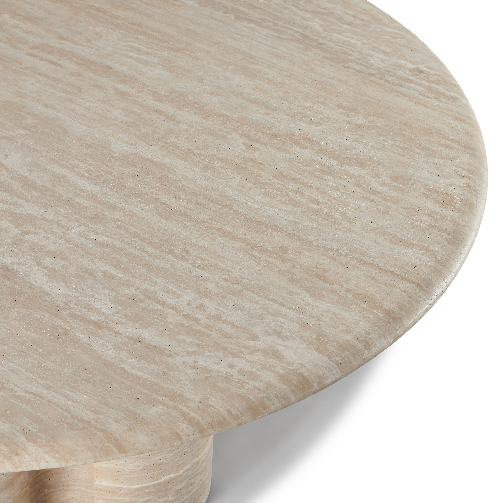 A contemporary and classic study in soft curves, our Porto collection creates a natural interplay between shadow and light with sculptural forms in the base. The mixed–material Porto Round Dining Table 60" anchors your outdoor dining set — featuring a robust travertine base suspending a travertine stone top all in Natural with a gentle, sloping bullnose edge. With seating for up to six, this unique outdoor dining table is a showpiece that highlights the natural combination of fine materials and expert craftsmanship. Also available in an aluminum base. Pair it with any dining chair to complete your outdoor dining set.