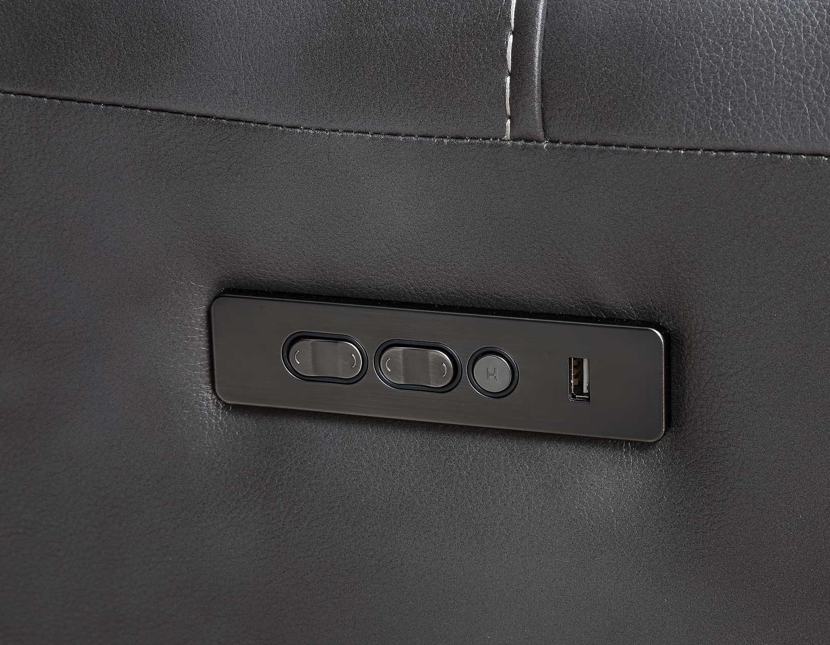Plush wide seating area with outside arm controls including a USB charger and home button