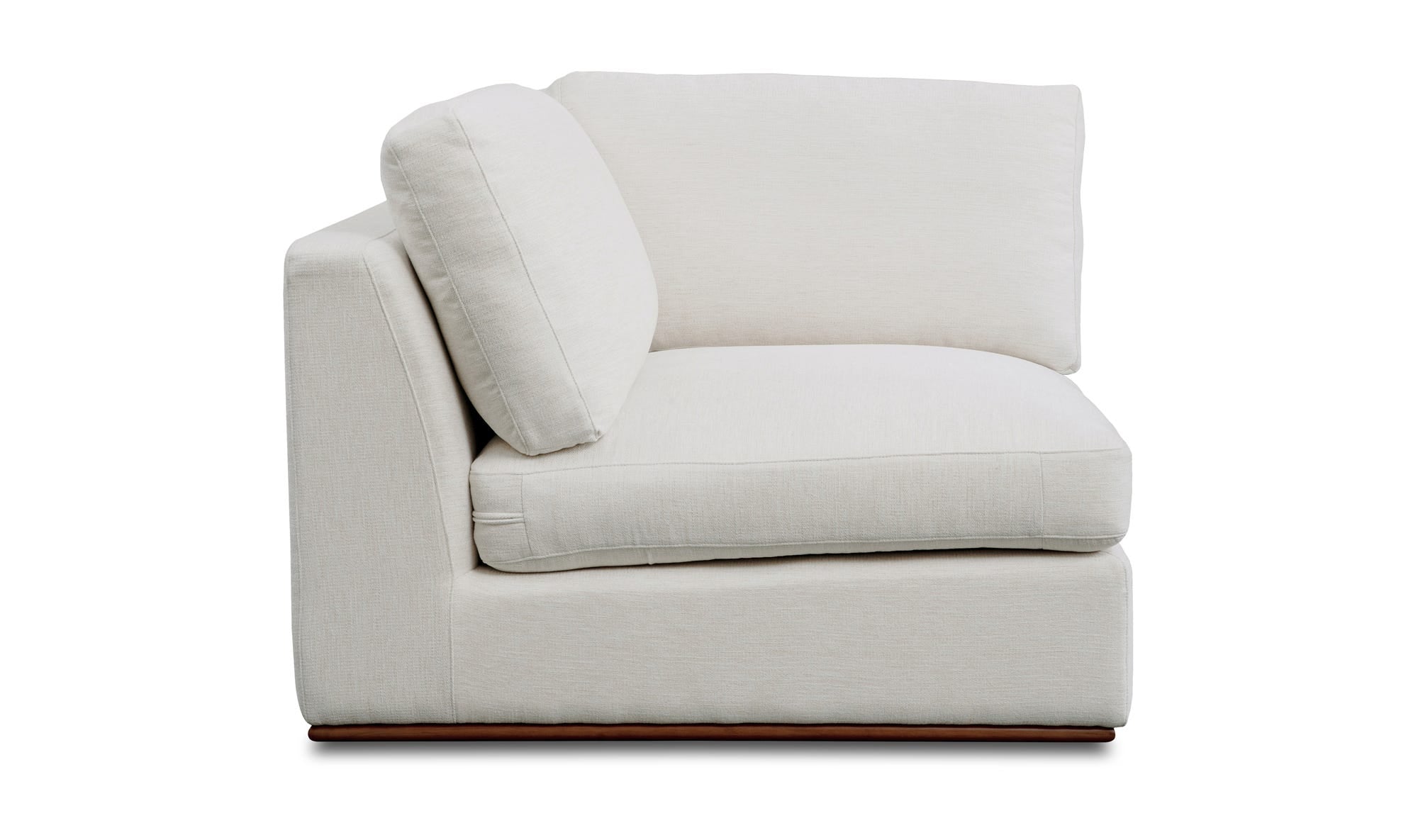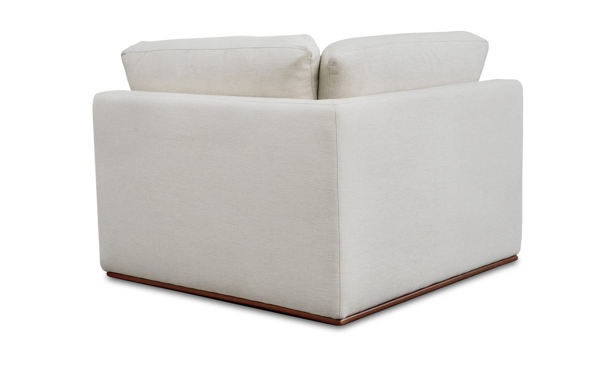 The Rue chair features a generous 70% feather-fill topper within its seat for an added layer of coziness. Its elegant silhouette is highlighted by a rubber wood base, creating a sleek floating appearance, all supported by subtle wooden legs. Designed with extreme comfort in mind, this modular chair embodies easy, neutral styling.