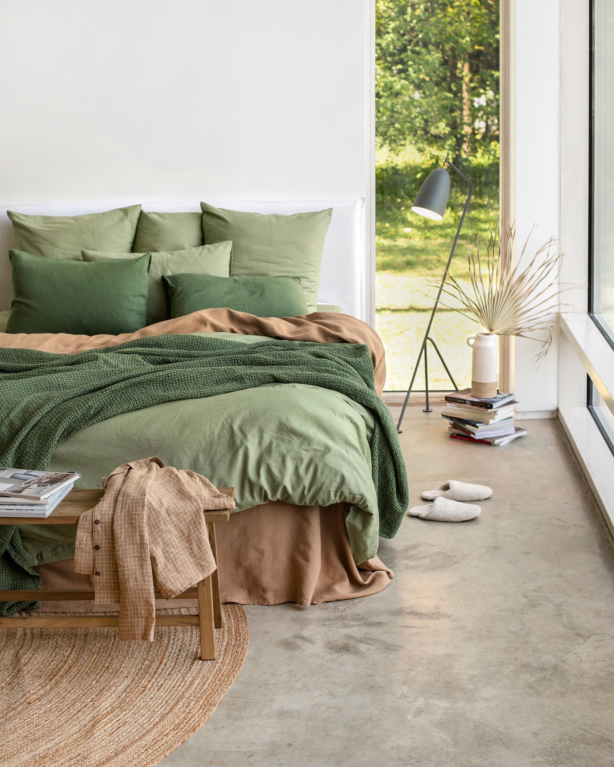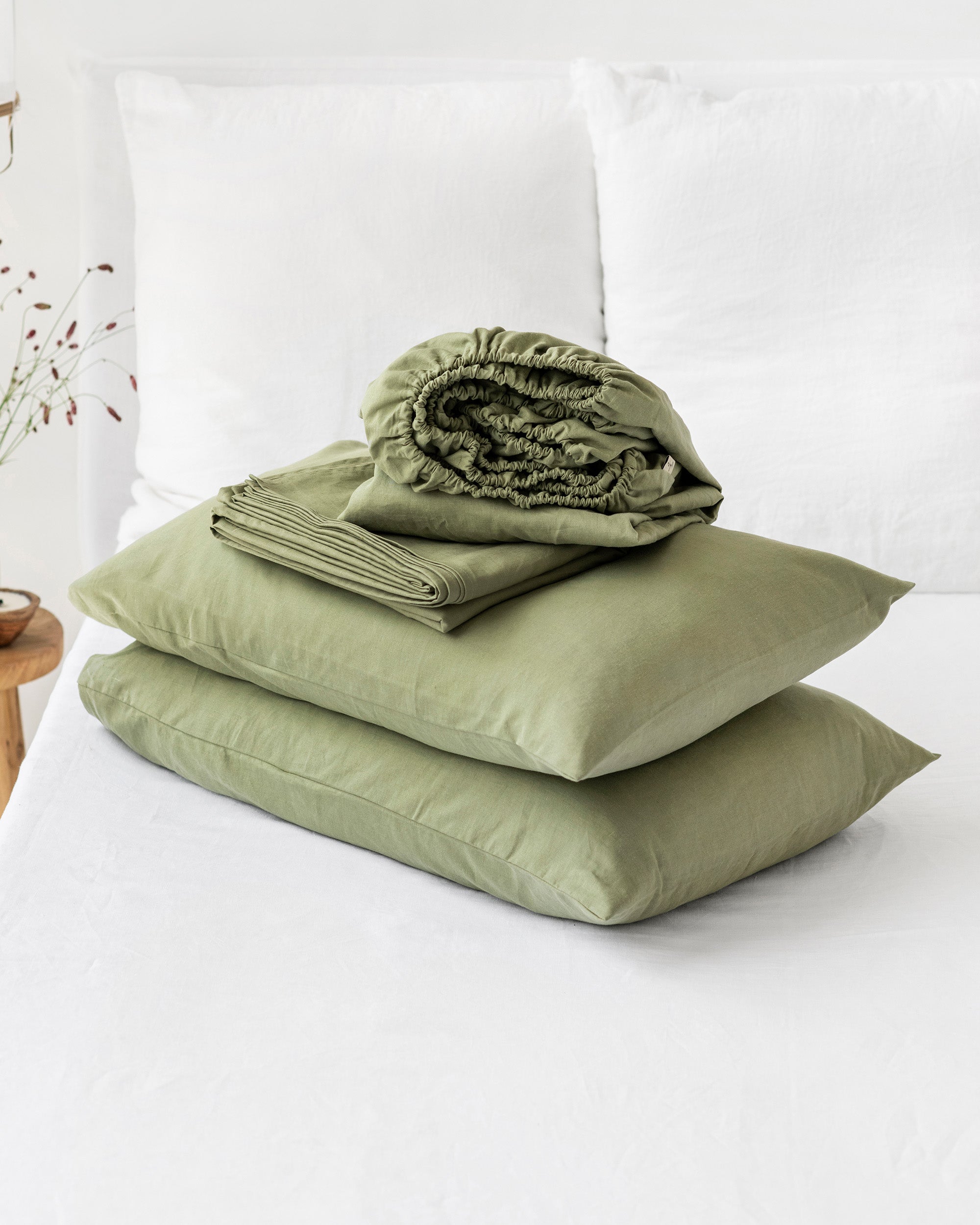 Dress your bed in pure comfort with our new Sage Linen-Cotton Blend Sheet Set. Complete with fitted and flat sheets, plus your choice of two pillowcases. Experience the dreamy nights you've always craved.