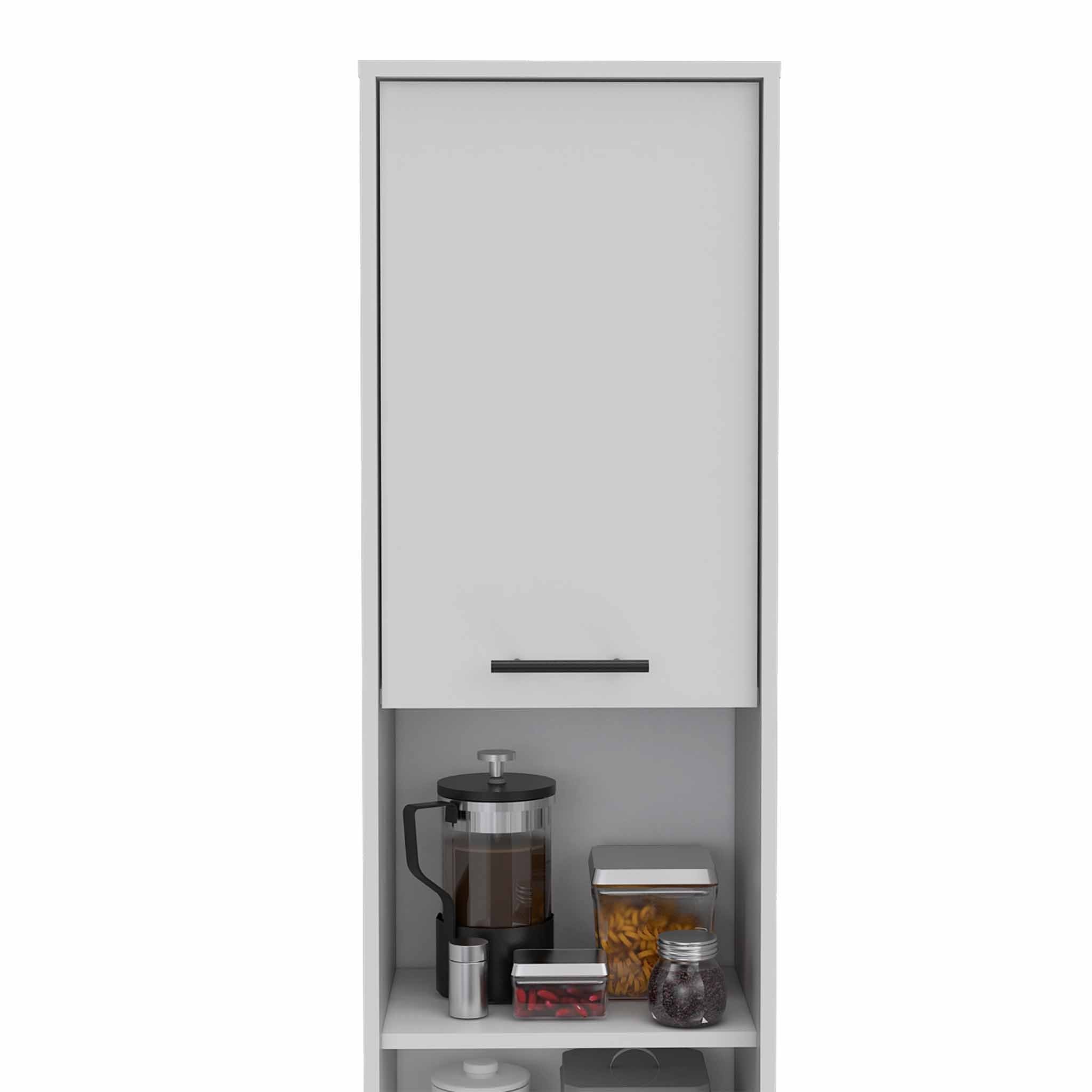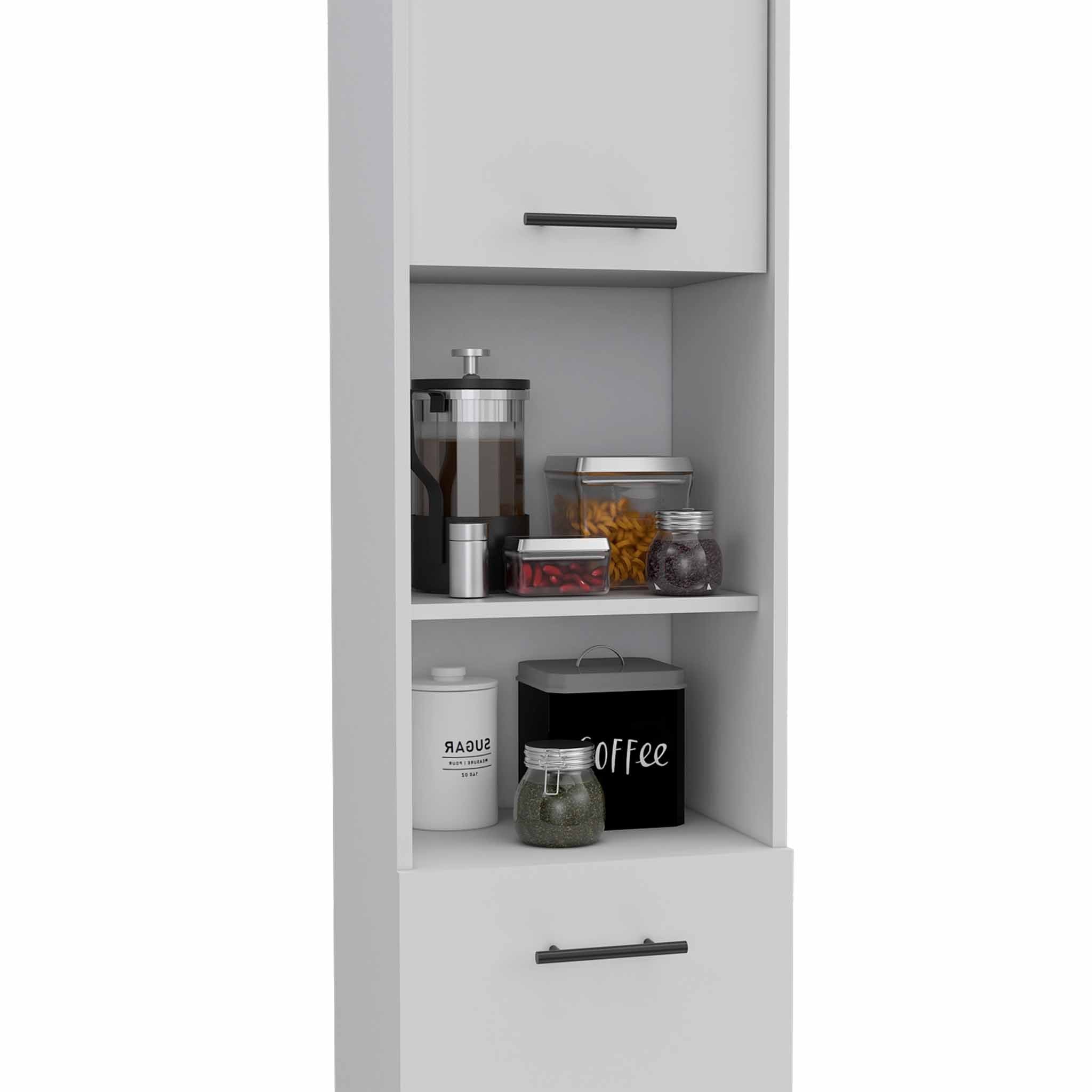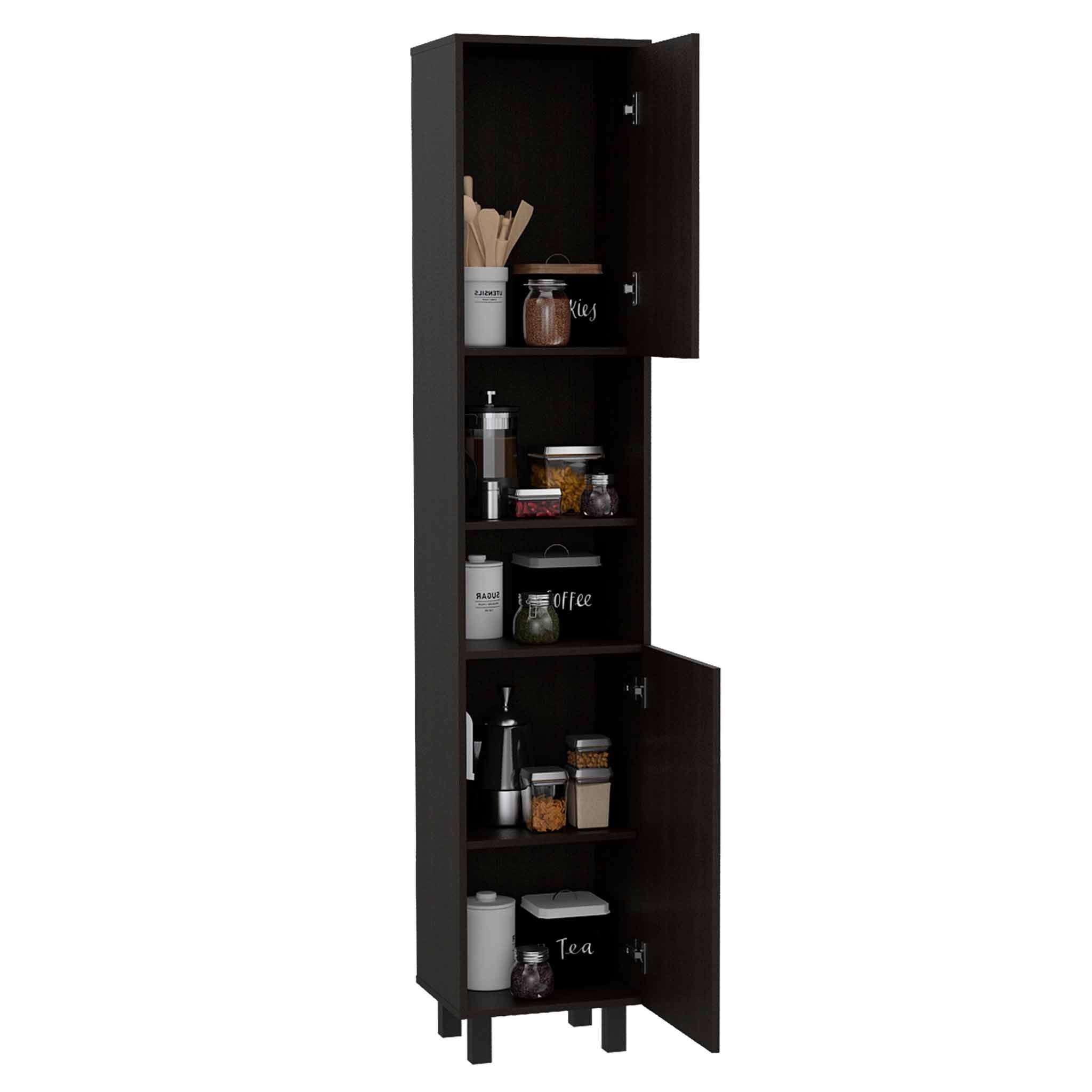 Hobart Pantry with Three Internal Shelves is a kitchen organization station that adds a valuable counter and cabinet space. This kitchen pantry features two cabinets and two open shelves. Its 15.7-inch width makes it ideal for getting that extra storage needed in small places, the two cabinets are 26 inches high, located at the top and bottom of the cabinet for your convenience; each cabinet has two shelves for your items, and they come with aluminum handles and hinges for a more durable and more comfortable assembly. Includes a kit to install the product to your wall and adjustable legs for more stability is provided with the product for your safety. Designed with elegant Black, White manufactured wood.