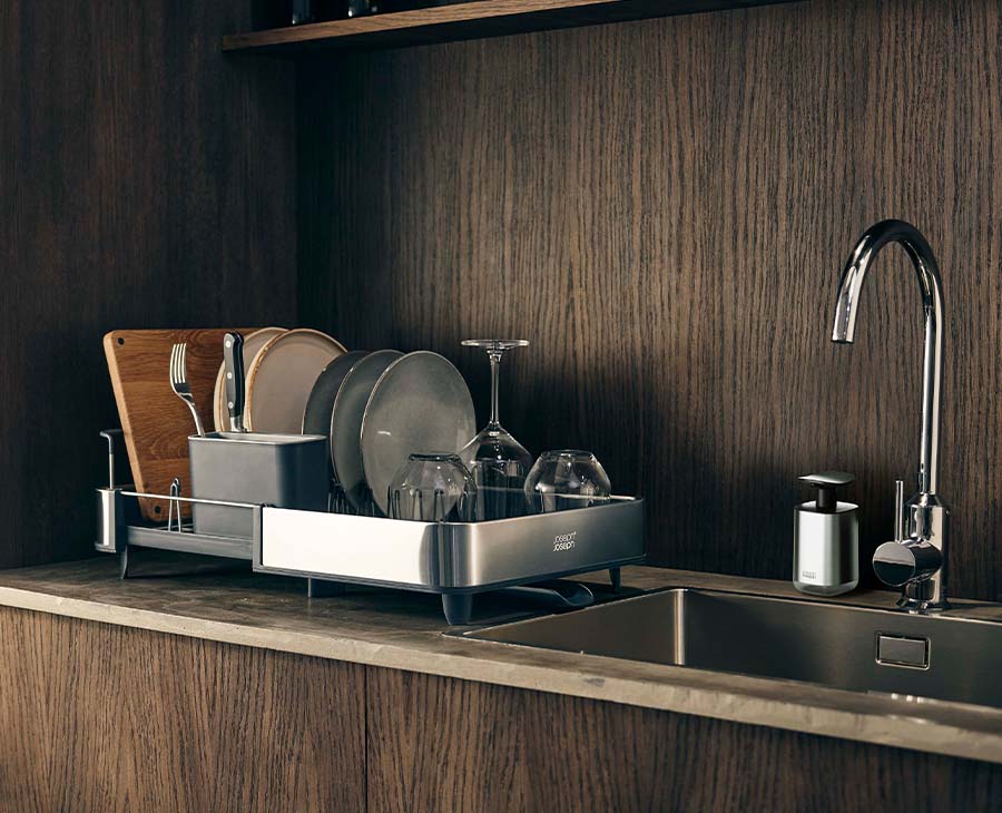 Our two-piece stainless-steel organisation set has everything you need to transform the efficiency of your sink. It includes an innovative dish drainer that can be expanded to almost twice its size and an easy-pump soap dispenser to keep hands hygienic.