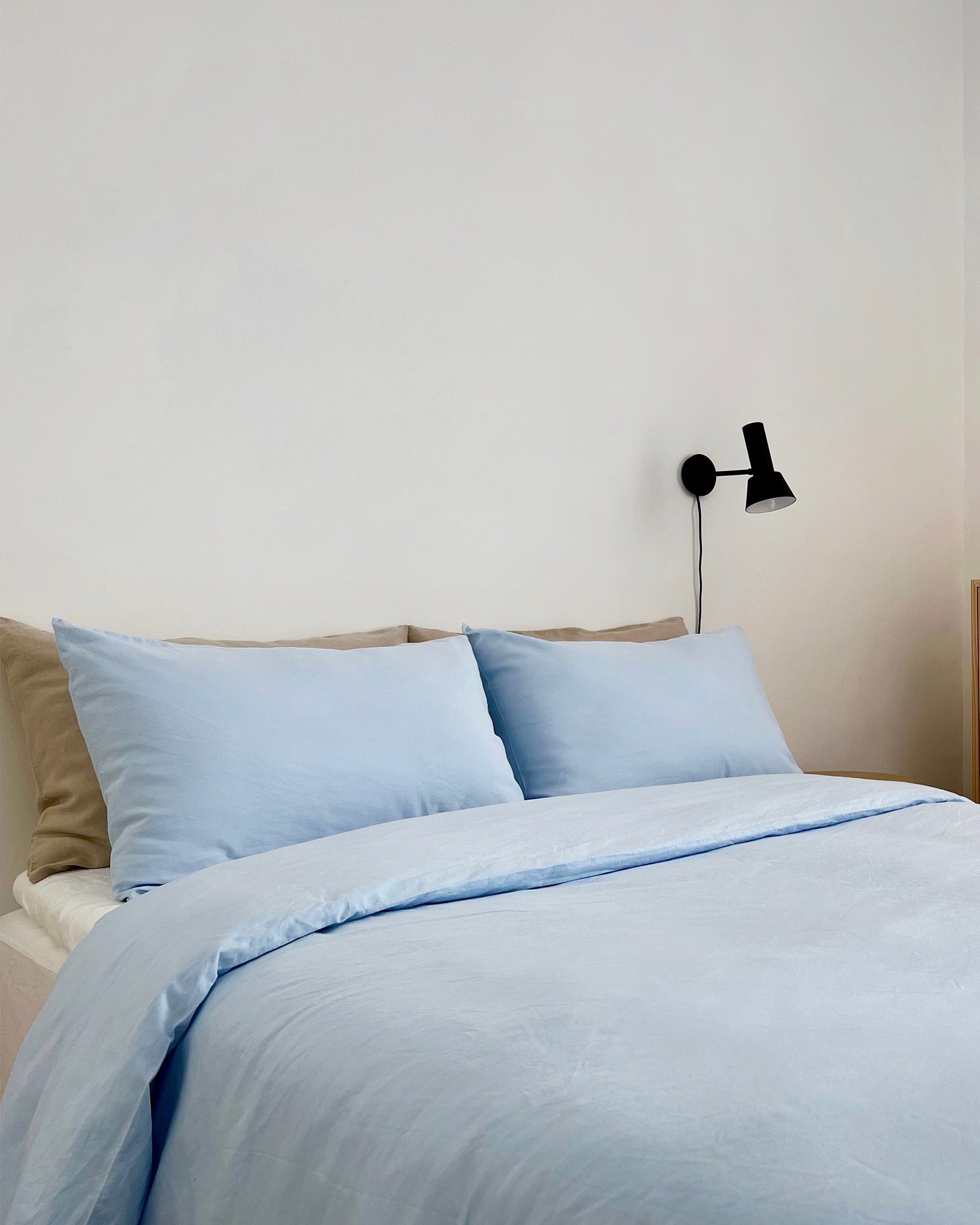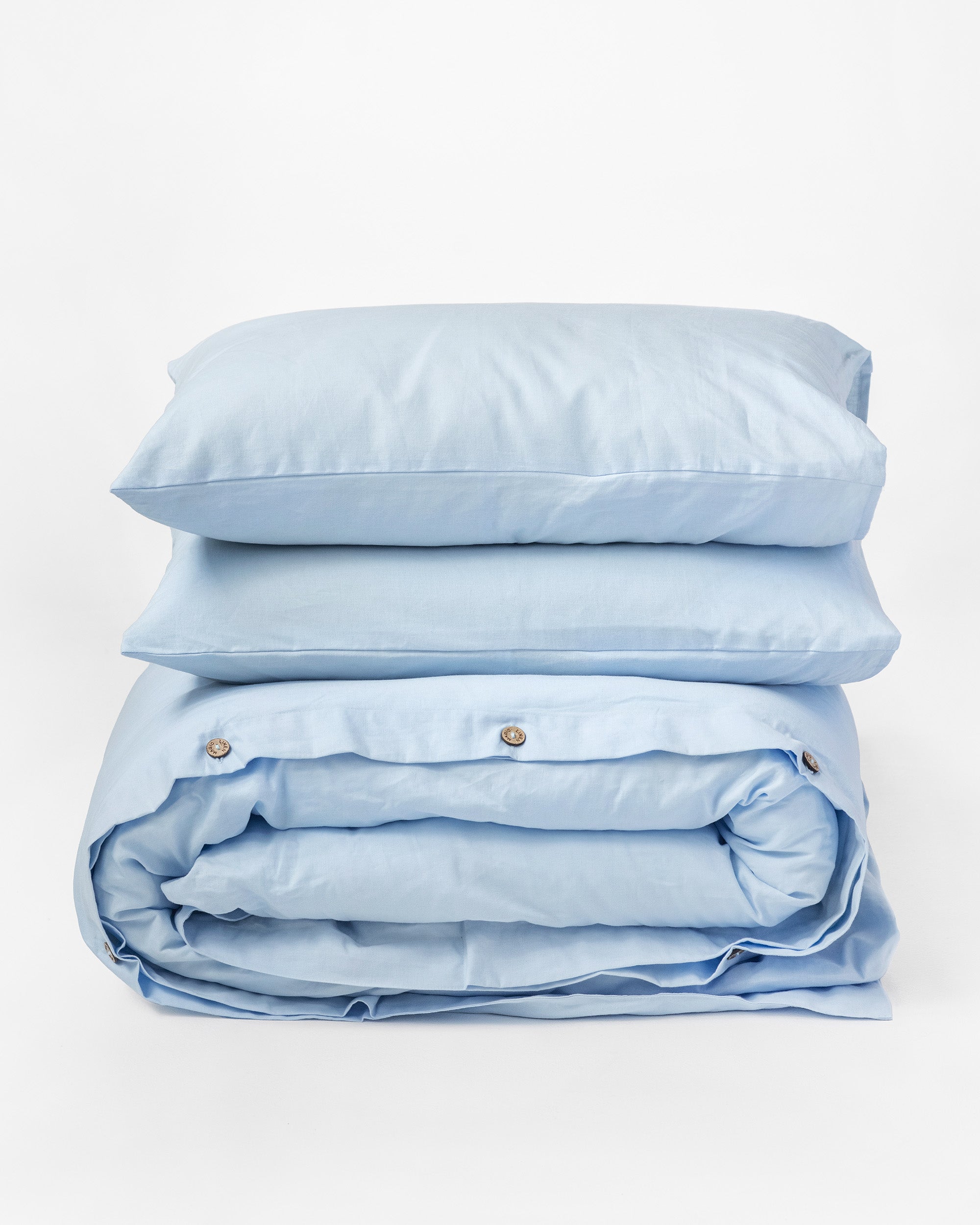 This Linen-Cotton Blend Duvet Cover Set in serene sky blue includes a duvet cover and two regular-style pillowcases, all crafted from wide fabric without additional seams for extra softness and fewer wrinkles compared to plain linen. Select from standard, queen, or king pillowcases to complete your bedding ensemble.
