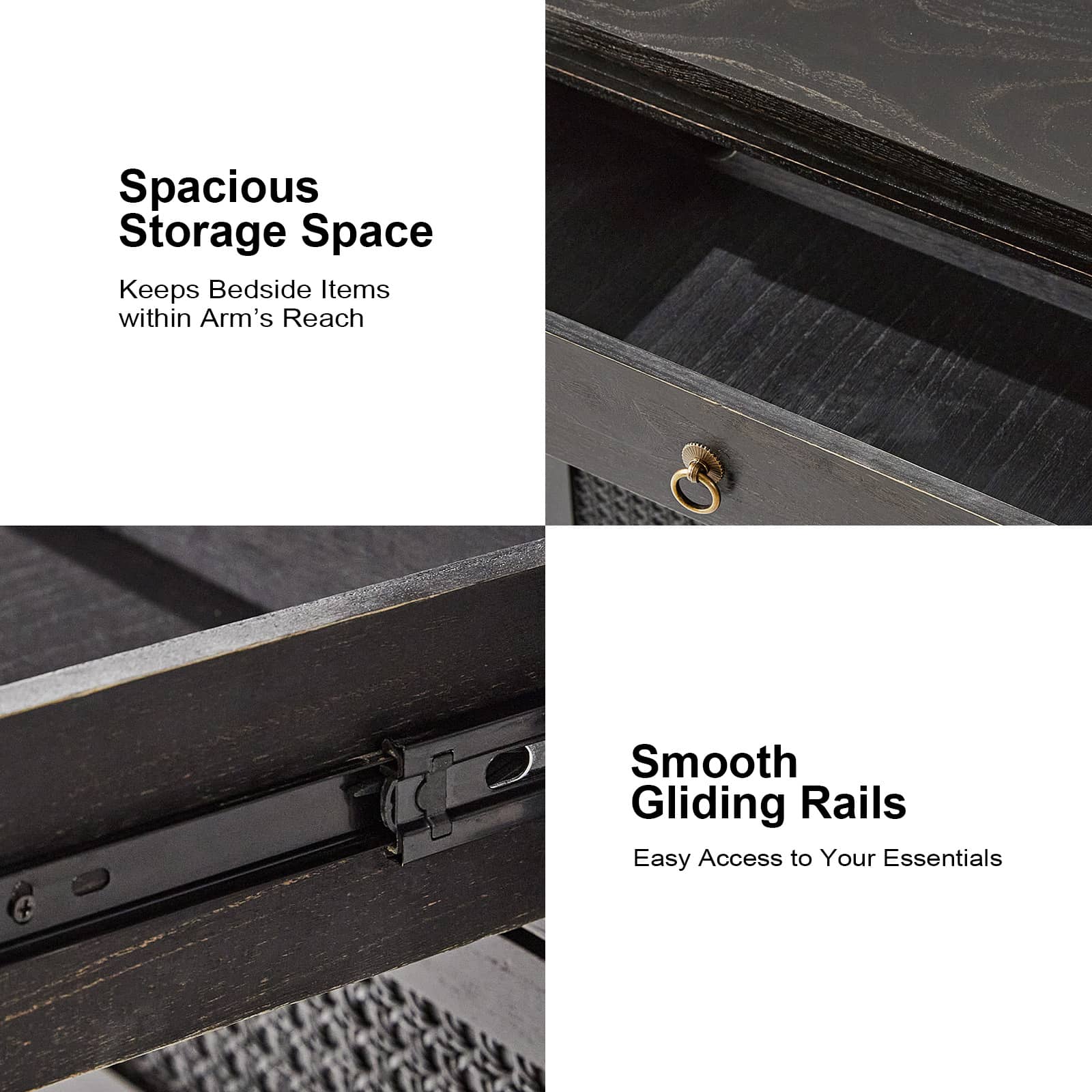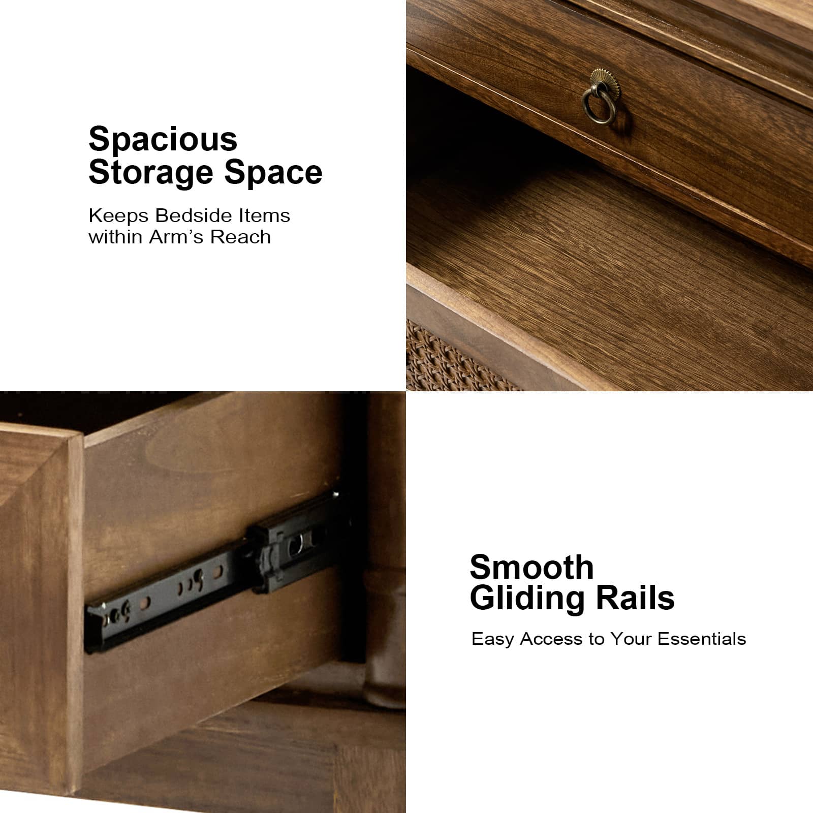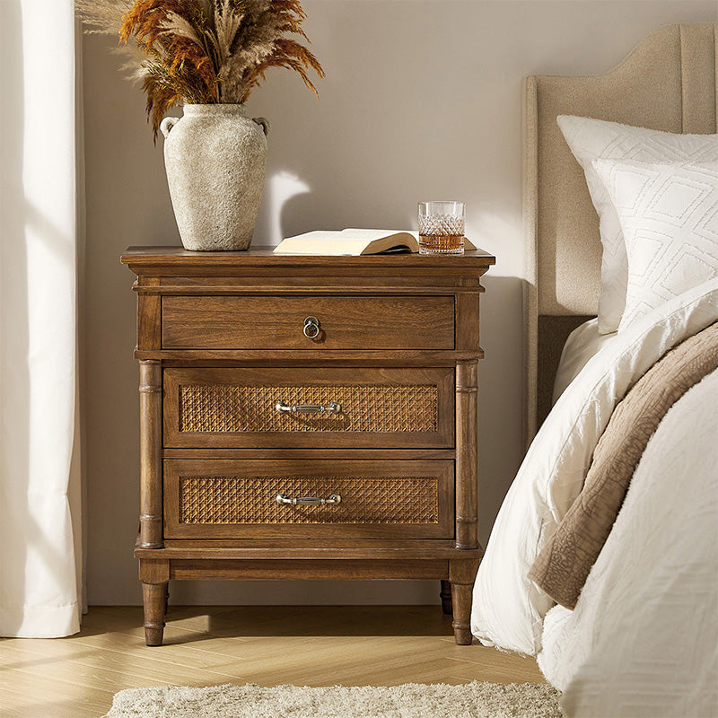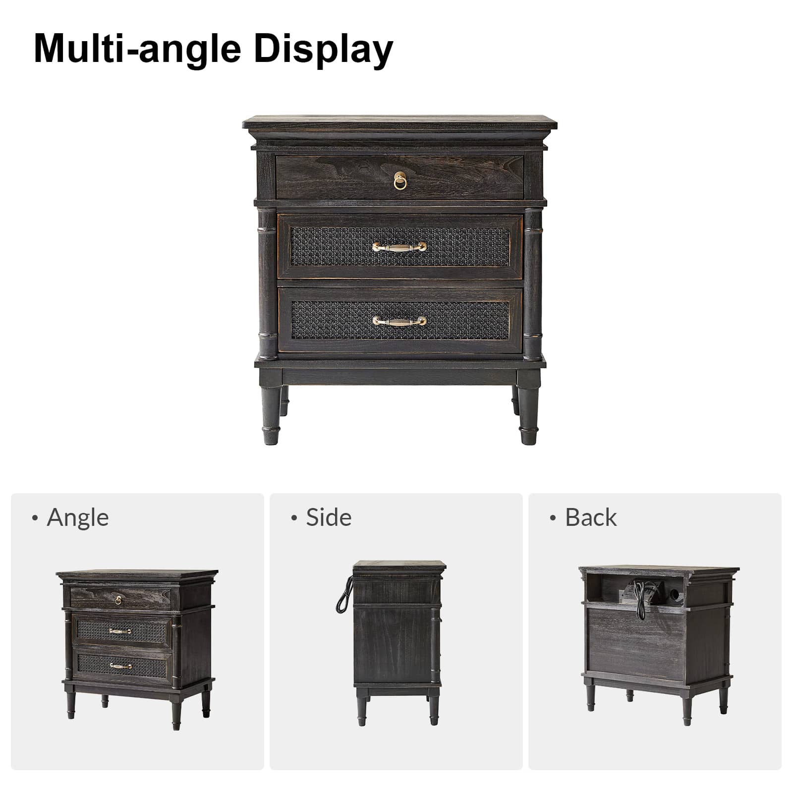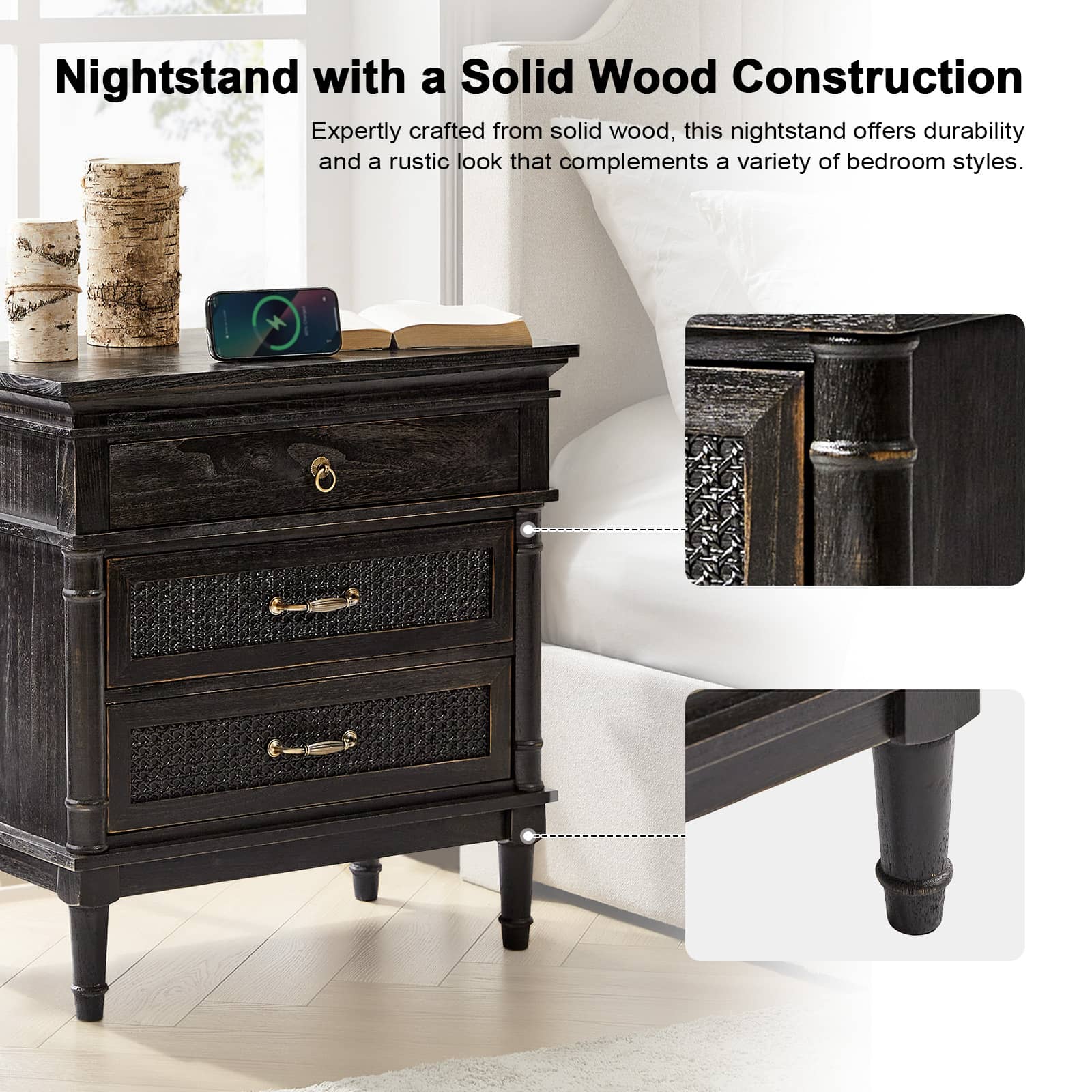 Discover the charm of classic design with this elegant solid wood nightstand. Crafted from high-quality, durable solid wood, it ensures lasting beauty and sturdiness. The piece features beautifully woven rattan drawers, adding a touch of natural texture and sophistication to your bedroom decor. Equipped with smooth glide rails, the drawers open effortlessly for convenient access to your essentials. For modern convenience, the nightstand includes an integrated power outlet and USB charging port, so you can easily charge your devices while keeping them close at hand. Whether used as a bedside companion or a stylish accent piece, its unique design and practical features enhance both the aesthetics and utility of your space.