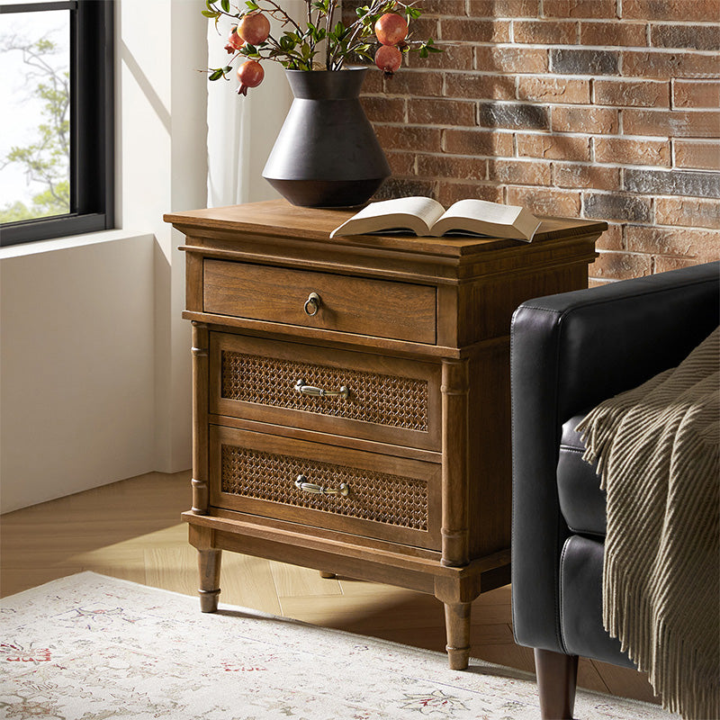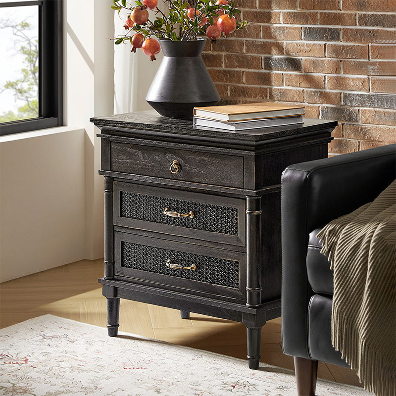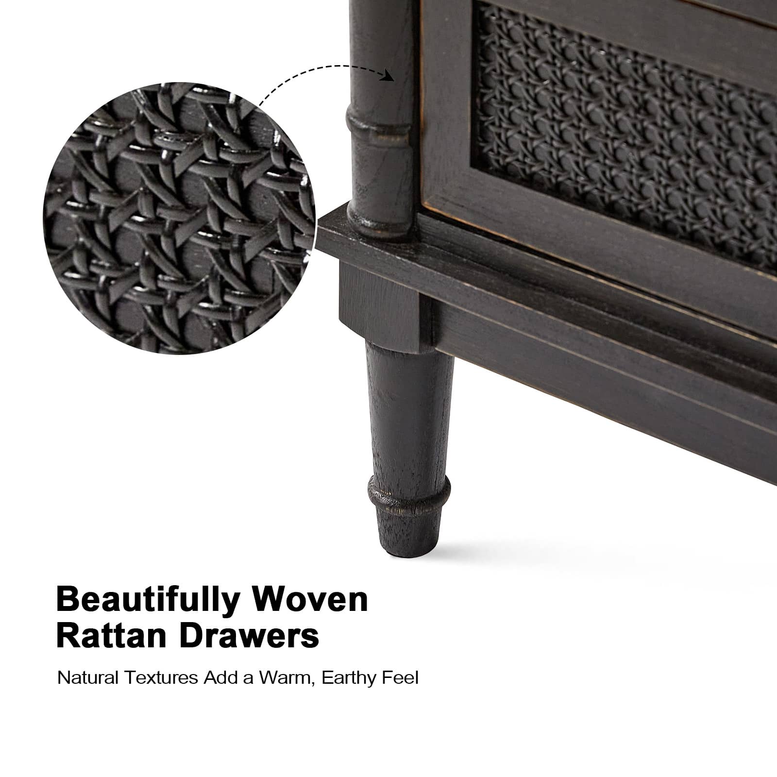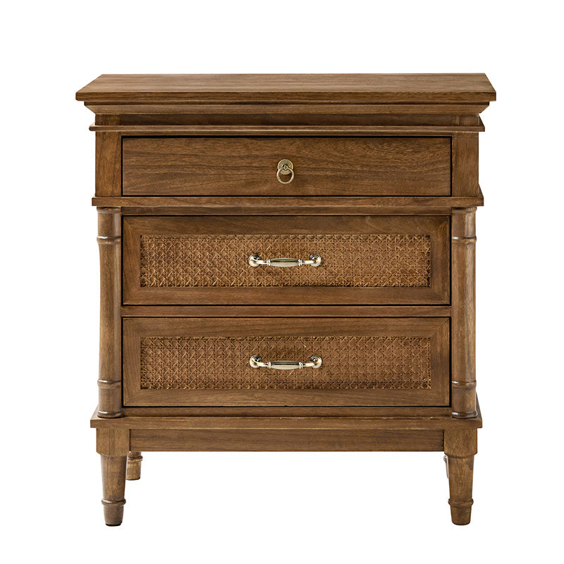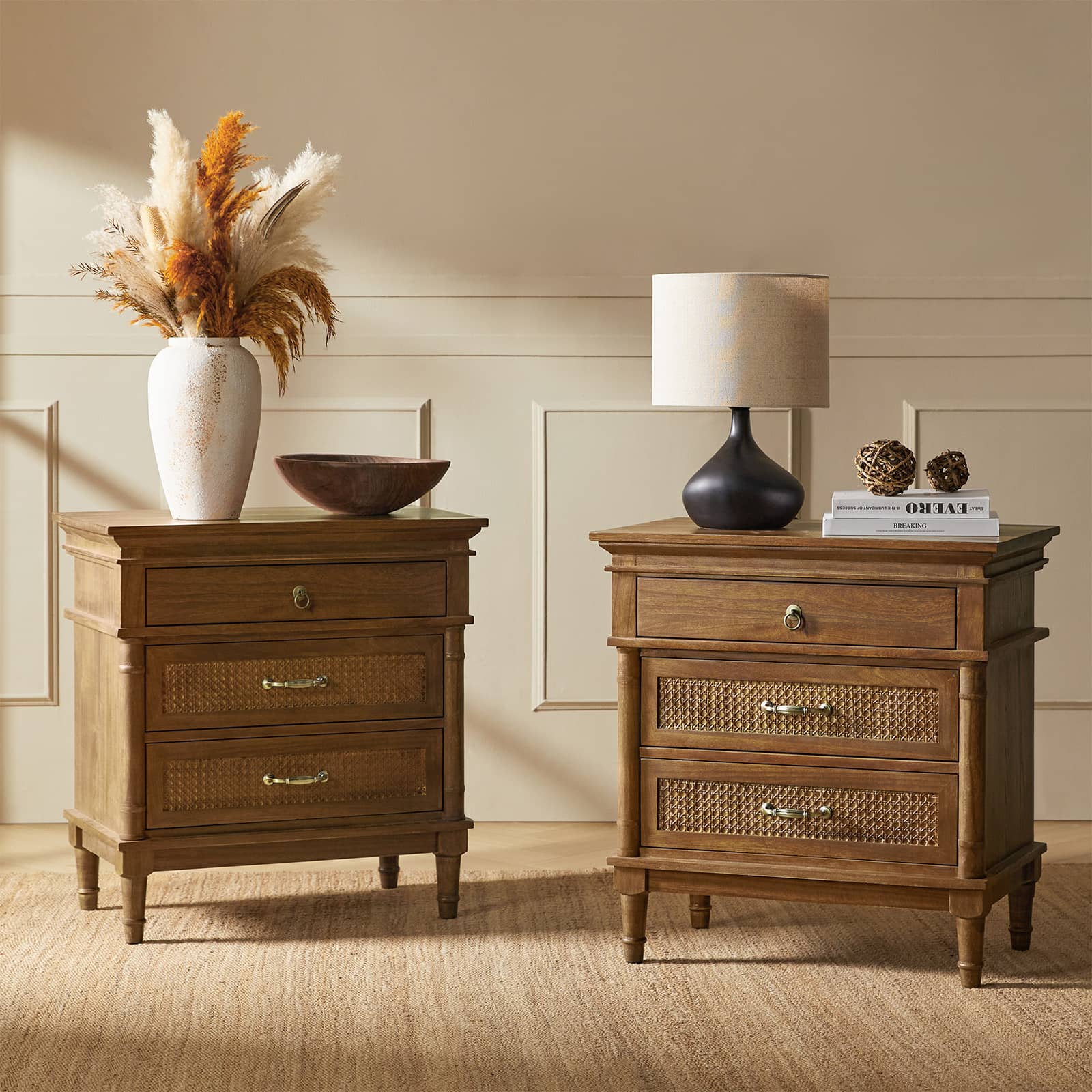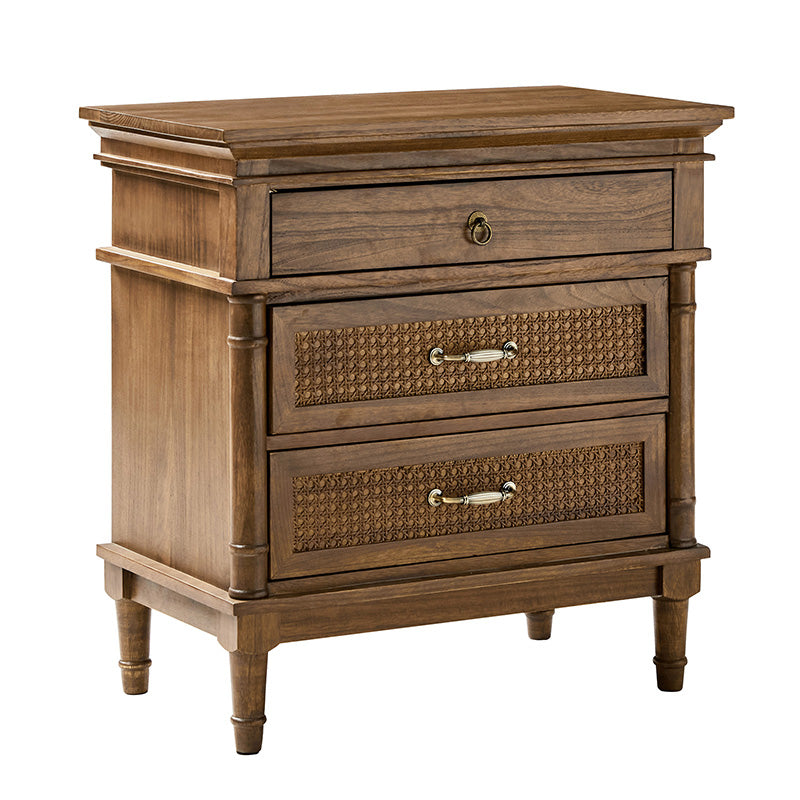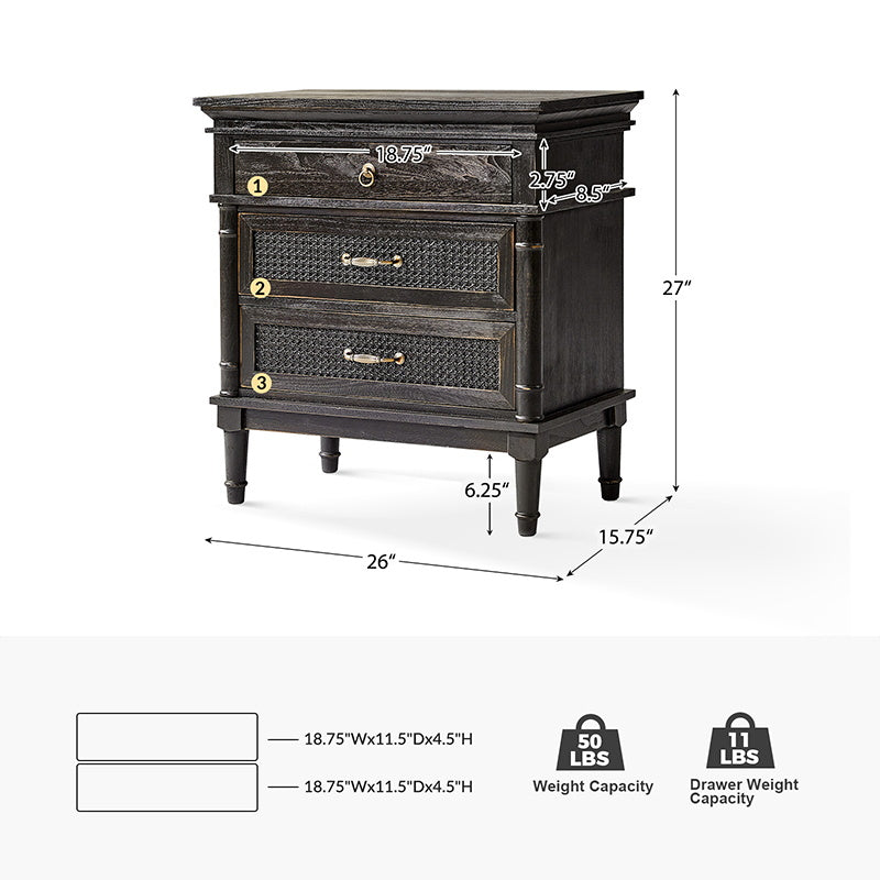 Discover the charm of classic design with this elegant solid wood nightstand. Crafted from high-quality, durable solid wood, it ensures lasting beauty and sturdiness. The piece features beautifully woven rattan drawers, adding a touch of natural texture and sophistication to your bedroom decor. Equipped with smooth glide rails, the drawers open effortlessly for convenient access to your essentials. For modern convenience, the nightstand includes an integrated power outlet and USB charging port, so you can easily charge your devices while keeping them close at hand. Whether used as a bedside companion or a stylish accent piece, its unique design and practical features enhance both the aesthetics and utility of your space.