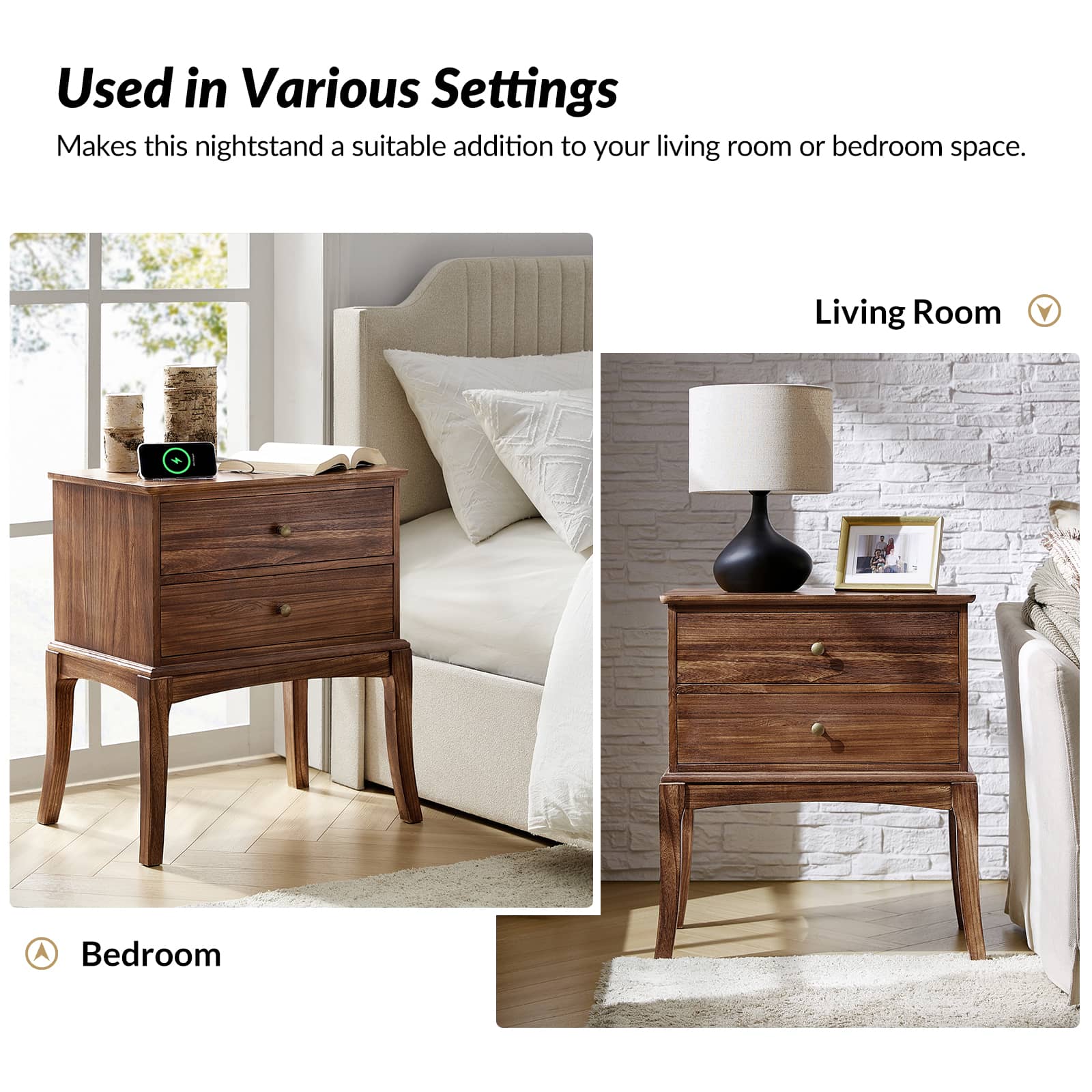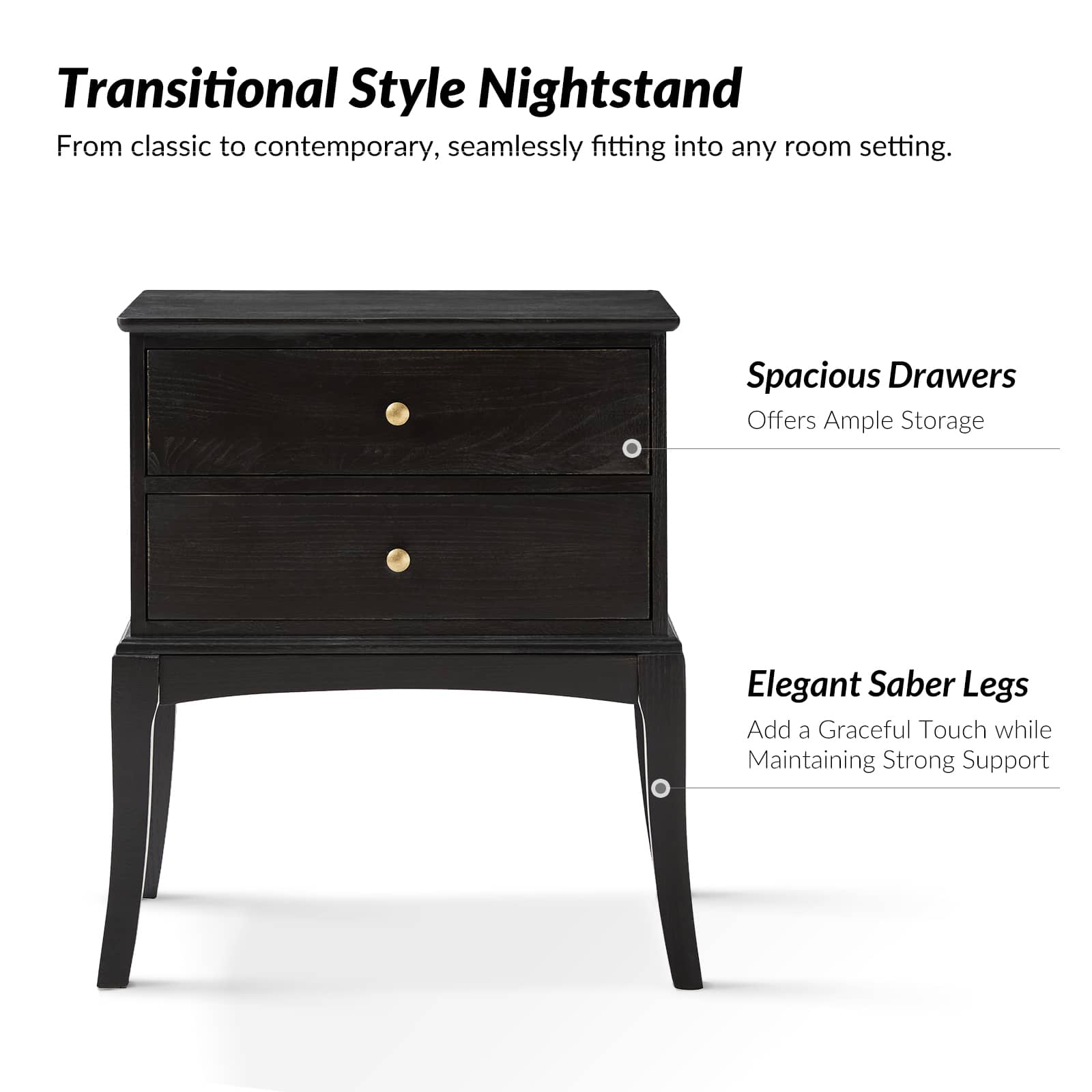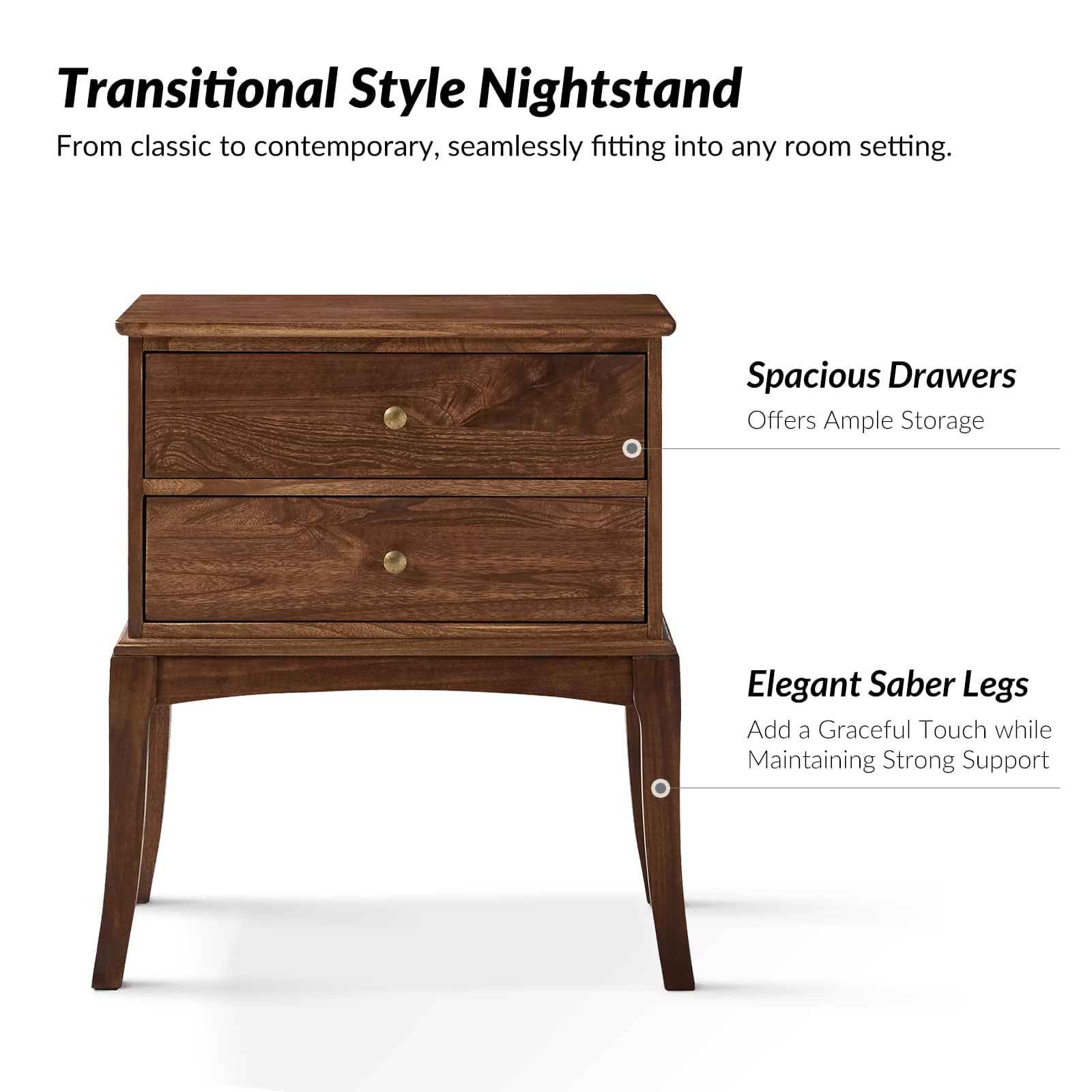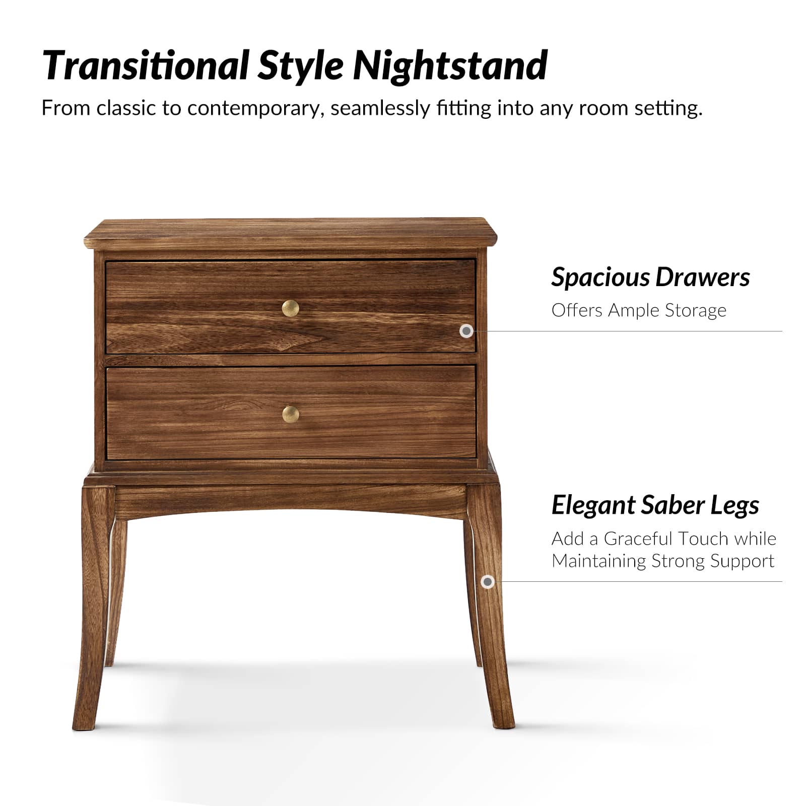 This transitional nightstand is crafted from solid Paulownia wood, offering durability and a timeless aesthetic. Its elegant design features a subtle saber leg base, adding a touch of sophistication and stability to the piece. The nightstand is equipped with two spacious drawers for convenient storage, ensuring that essentials are always within reach. A hidden outlet located behind the top drawer provides a discreet and practical solution for charging devices without cluttering the surface. The natural wood grain and sleek lines create a versatile look that complements both modern and traditional interiors, making this nightstand a suitable addition to your living room or bedroom space.