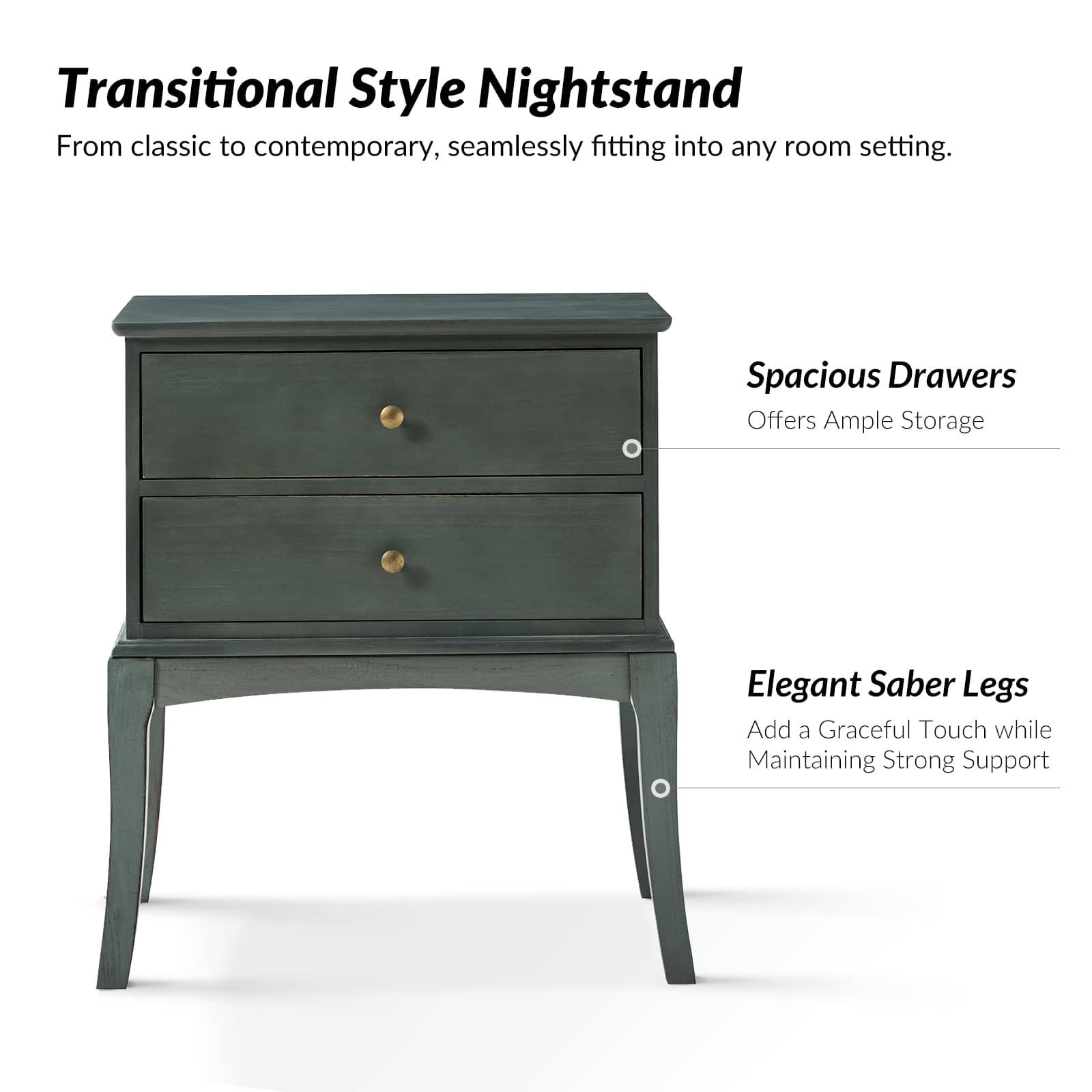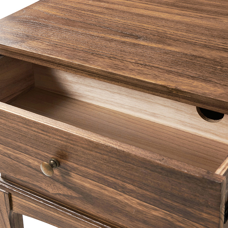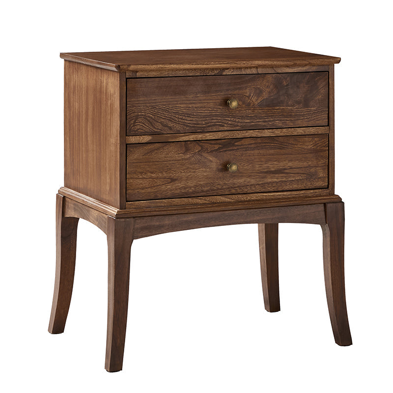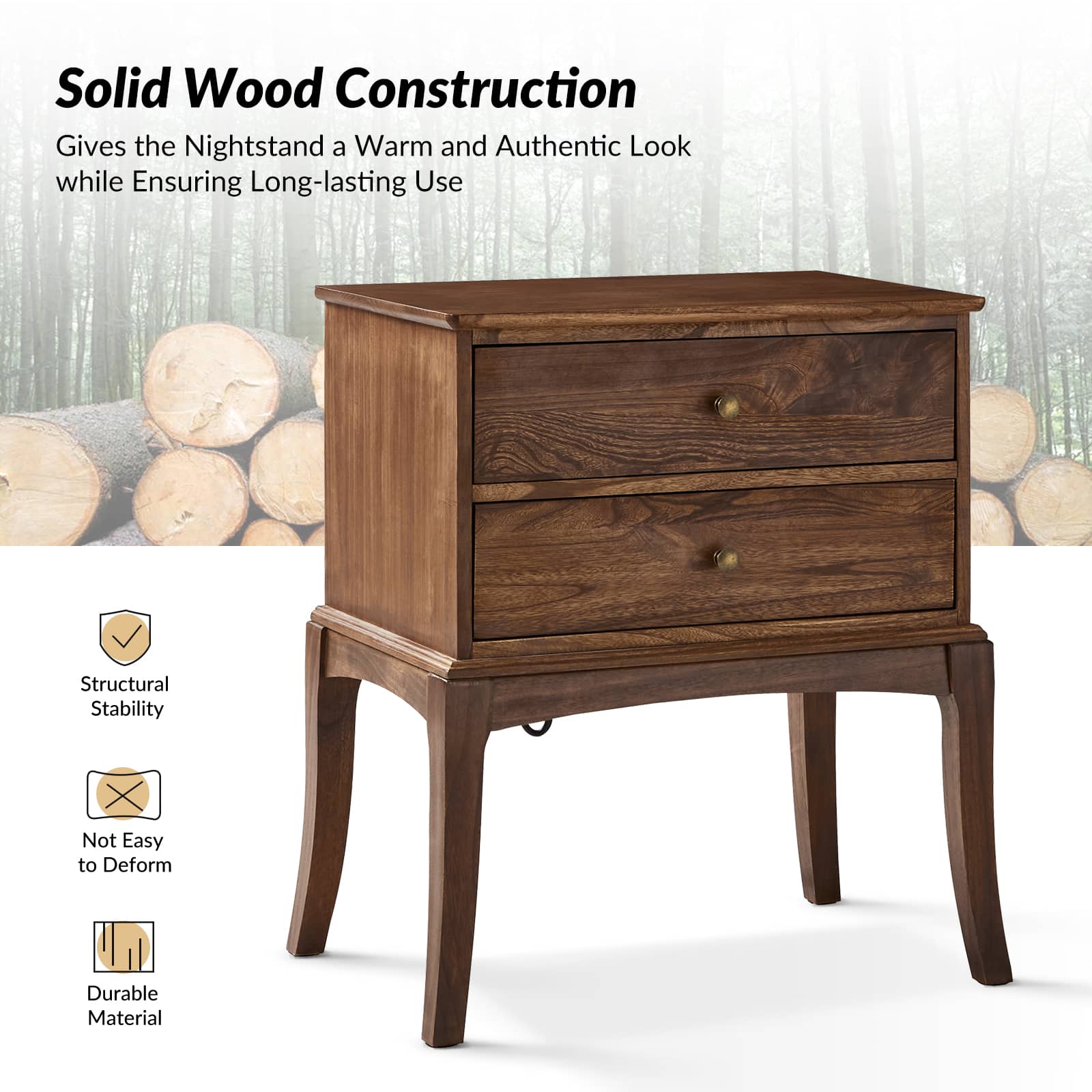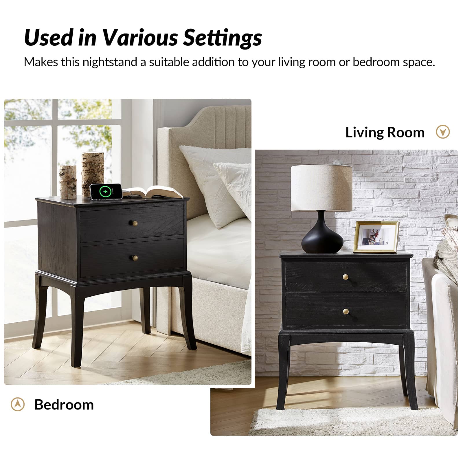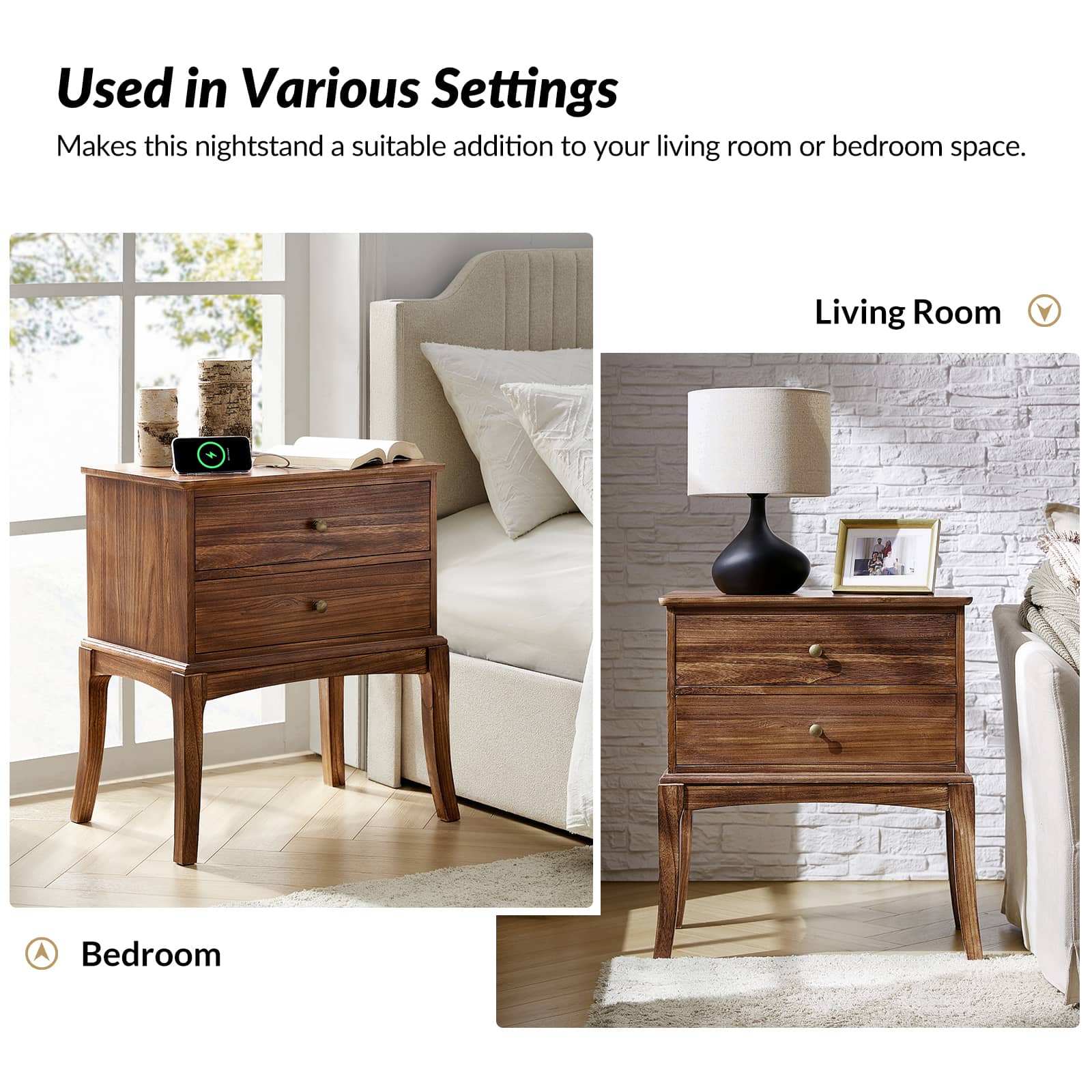 This transitional nightstand is crafted from solid Paulownia wood, offering durability and a timeless aesthetic. Its elegant design features a subtle saber leg base, adding a touch of sophistication and stability to the piece. The nightstand is equipped with two spacious drawers for convenient storage, ensuring that essentials are always within reach. A hidden outlet located behind the top drawer provides a discreet and practical solution for charging devices without cluttering the surface. The natural wood grain and sleek lines create a versatile look that complements both modern and traditional interiors, making this nightstand a suitable addition to your living room or bedroom space.