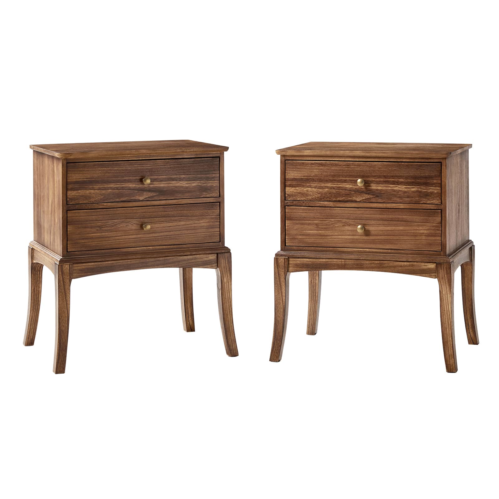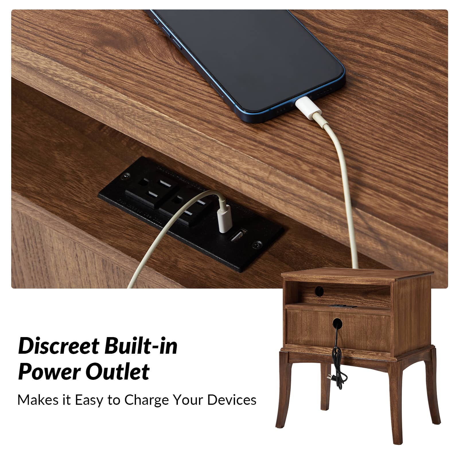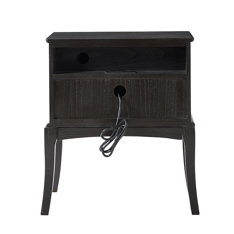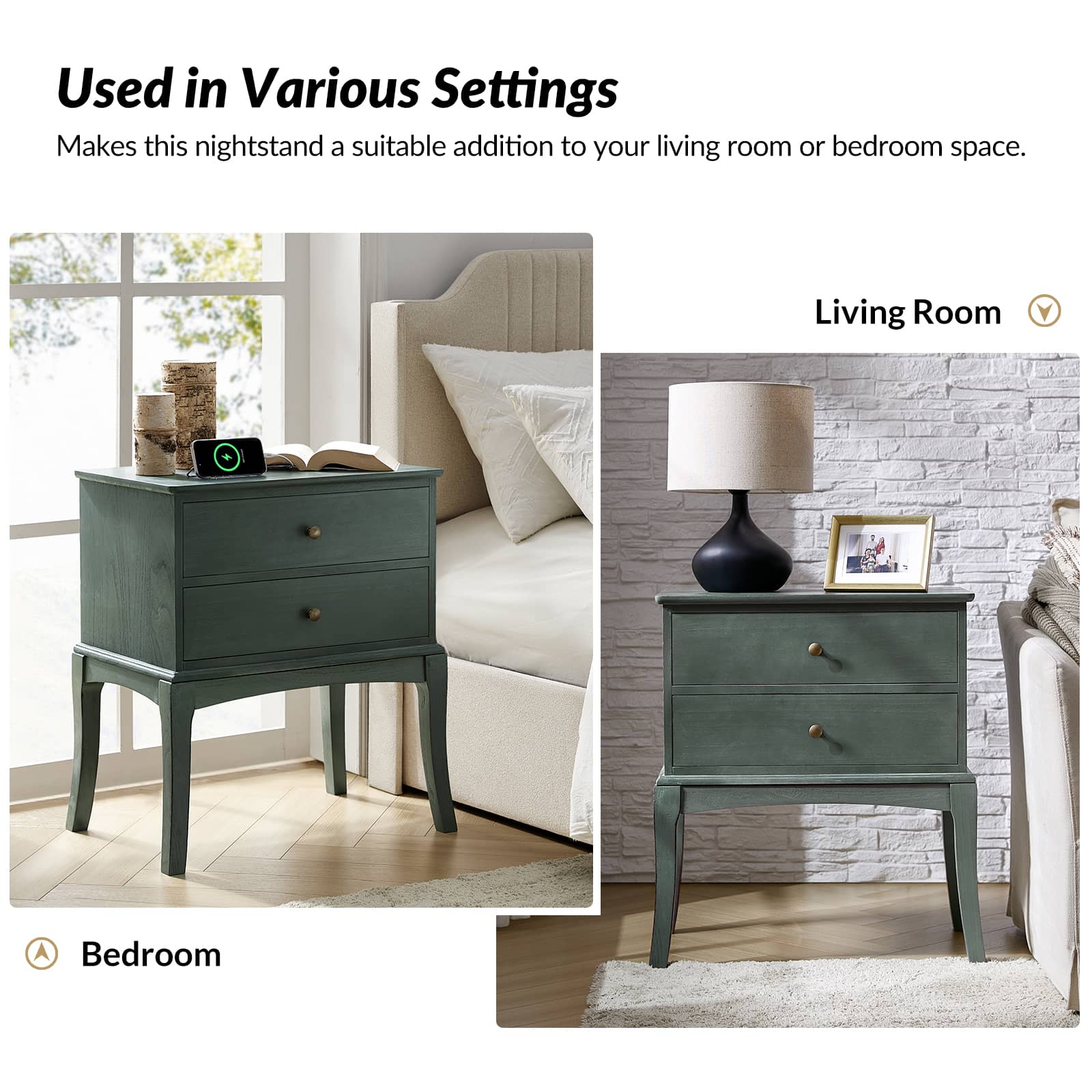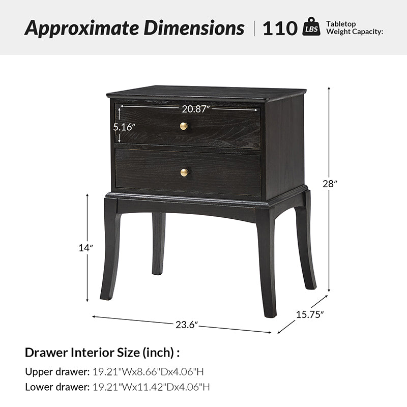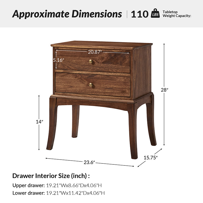 This transitional nightstand is crafted from solid Paulownia wood, offering durability and a timeless aesthetic. Its elegant design features a subtle saber leg base, adding a touch of sophistication and stability to the piece. The nightstand is equipped with two spacious drawers for convenient storage, ensuring that essentials are always within reach. A hidden outlet located behind the top drawer provides a discreet and practical solution for charging devices without cluttering the surface. The natural wood grain and sleek lines create a versatile look that complements both modern and traditional interiors, making this nightstand a suitable addition to your living room or bedroom space.