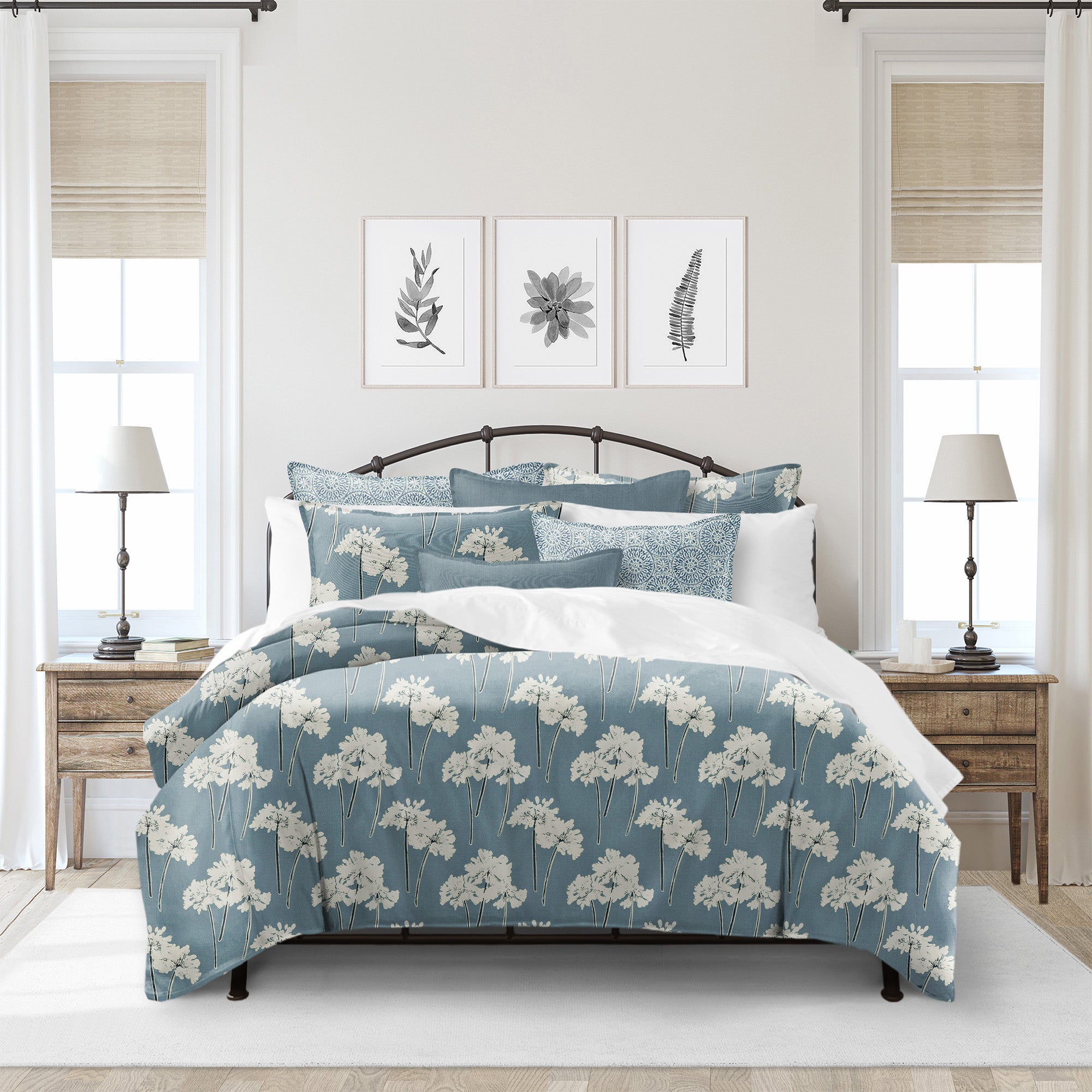 Summerfield is a floral silhouette motif set against a dreamy backdrop. A gentle blue is a perfect base for almost floating cream...
