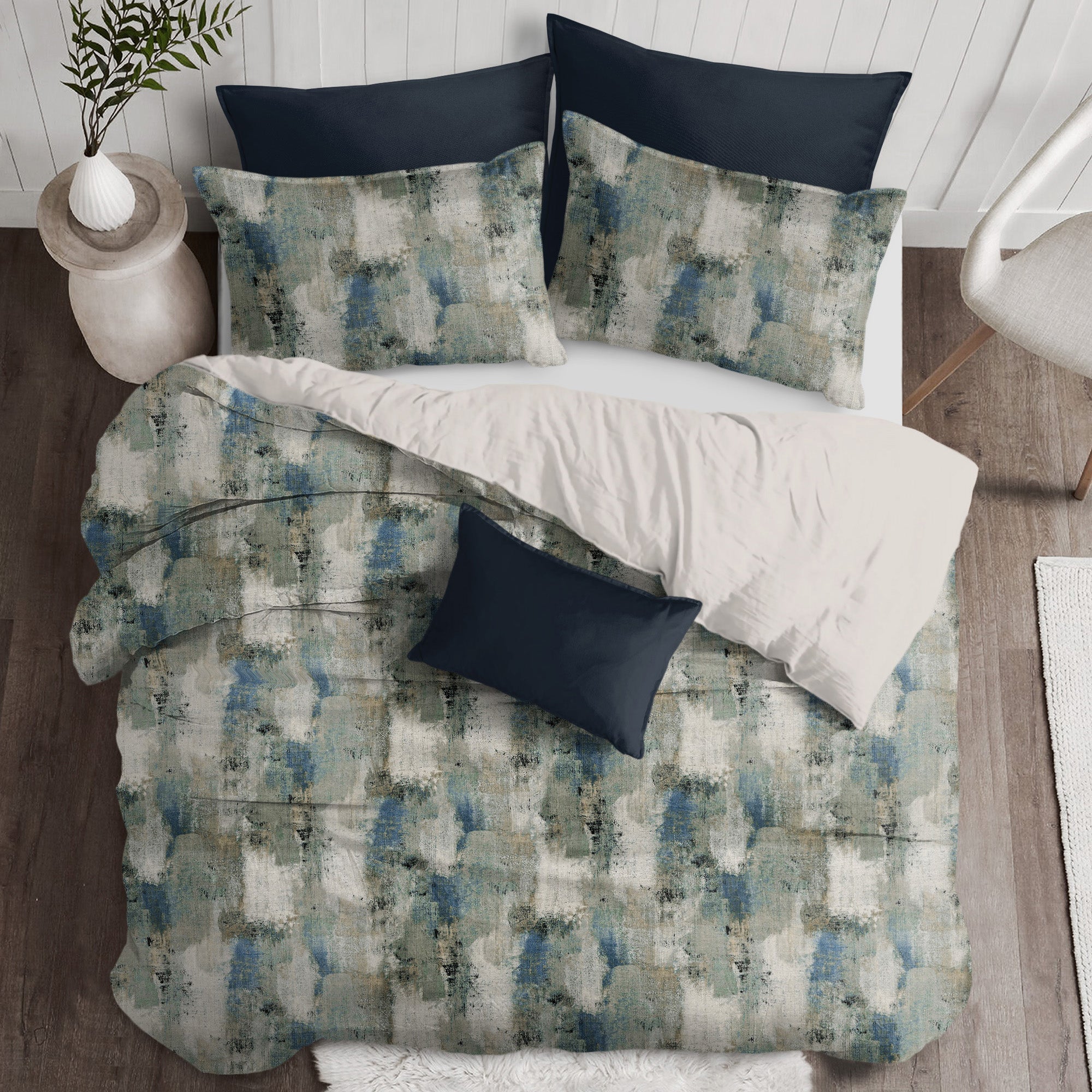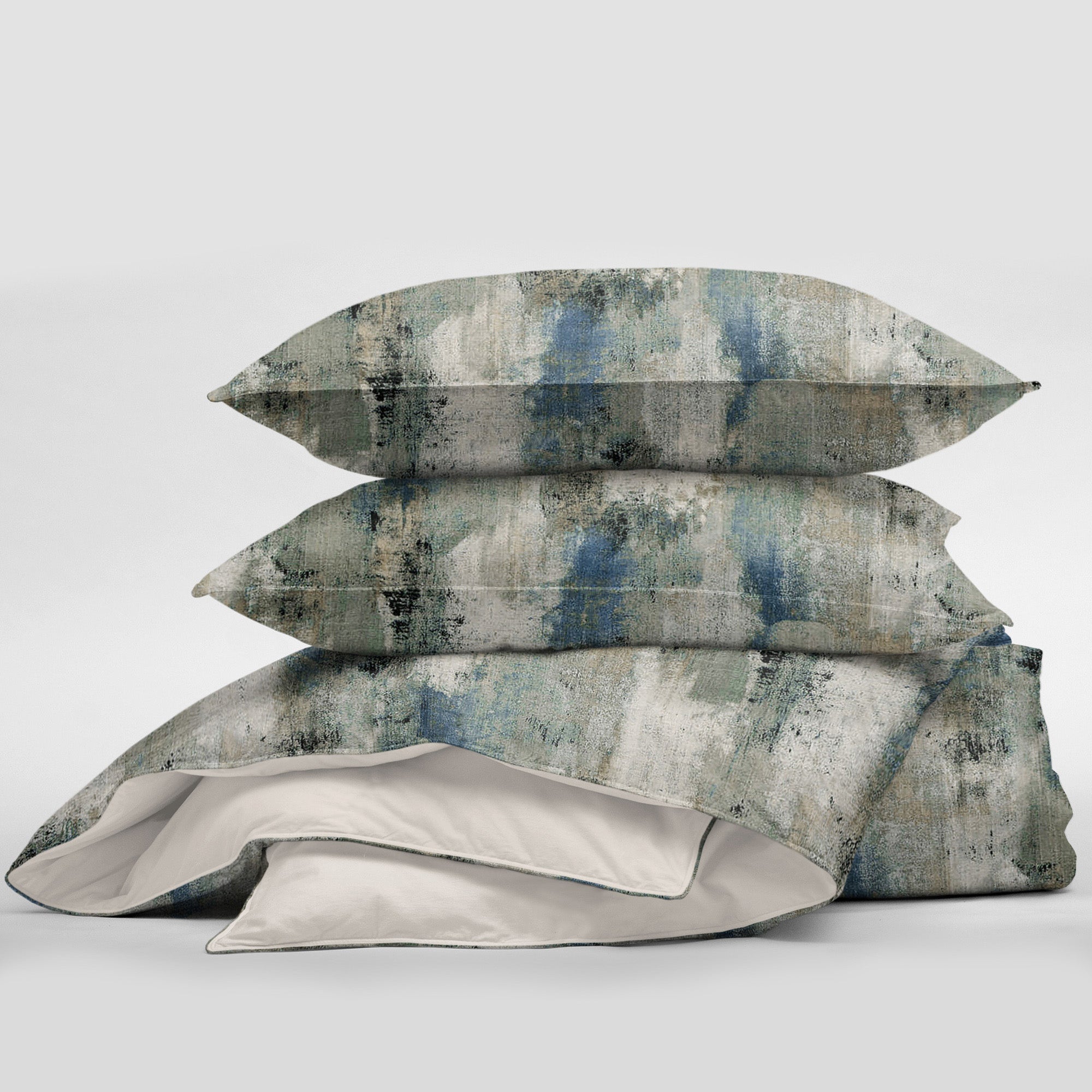Thiago Linen's broad abstract paint strokes are a fresh, bold take on contemporary art. Shades of dark denim, alabaster, and taupe intertwine and create a collage of color and texture. Featured on a woven linen blend backdrop, Thiago Linen is truly a modern classic.