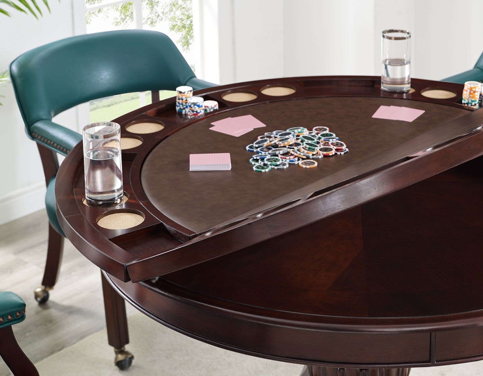 - Folding game top with drink and chip holders and a faux-leather playing surface shown in brown. Also available in black faux-leather.