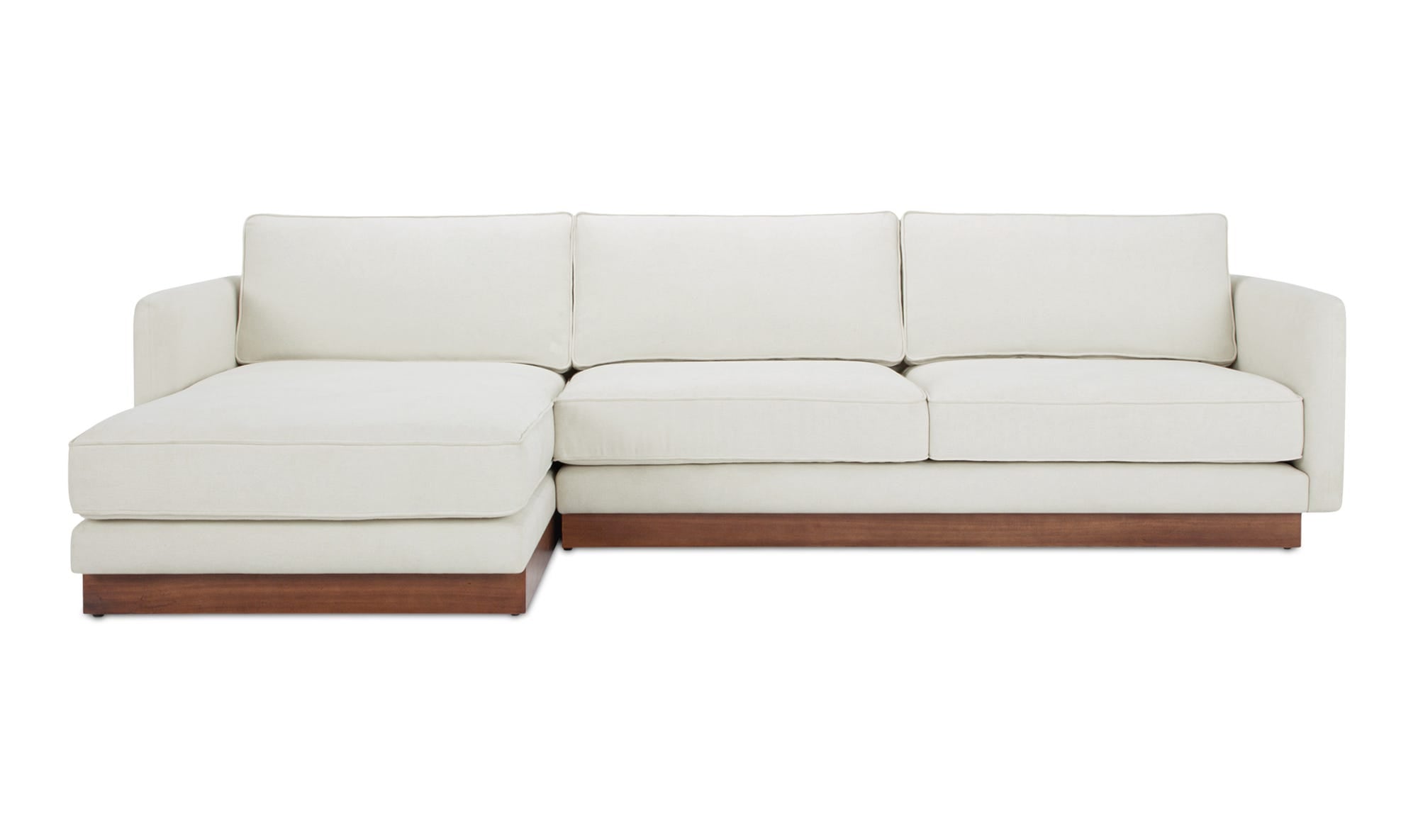The Vernon sectional blends mid-century design with modern functionality. It features a wooden plinth base for an elevated, lighter appearance. This sectional offers unmatched comfort with removable cushions. Upholstered in durable, OEKO-TEX and Green Guard-certified fabric, it is ideal for family living, combining everyday practicality with durability.