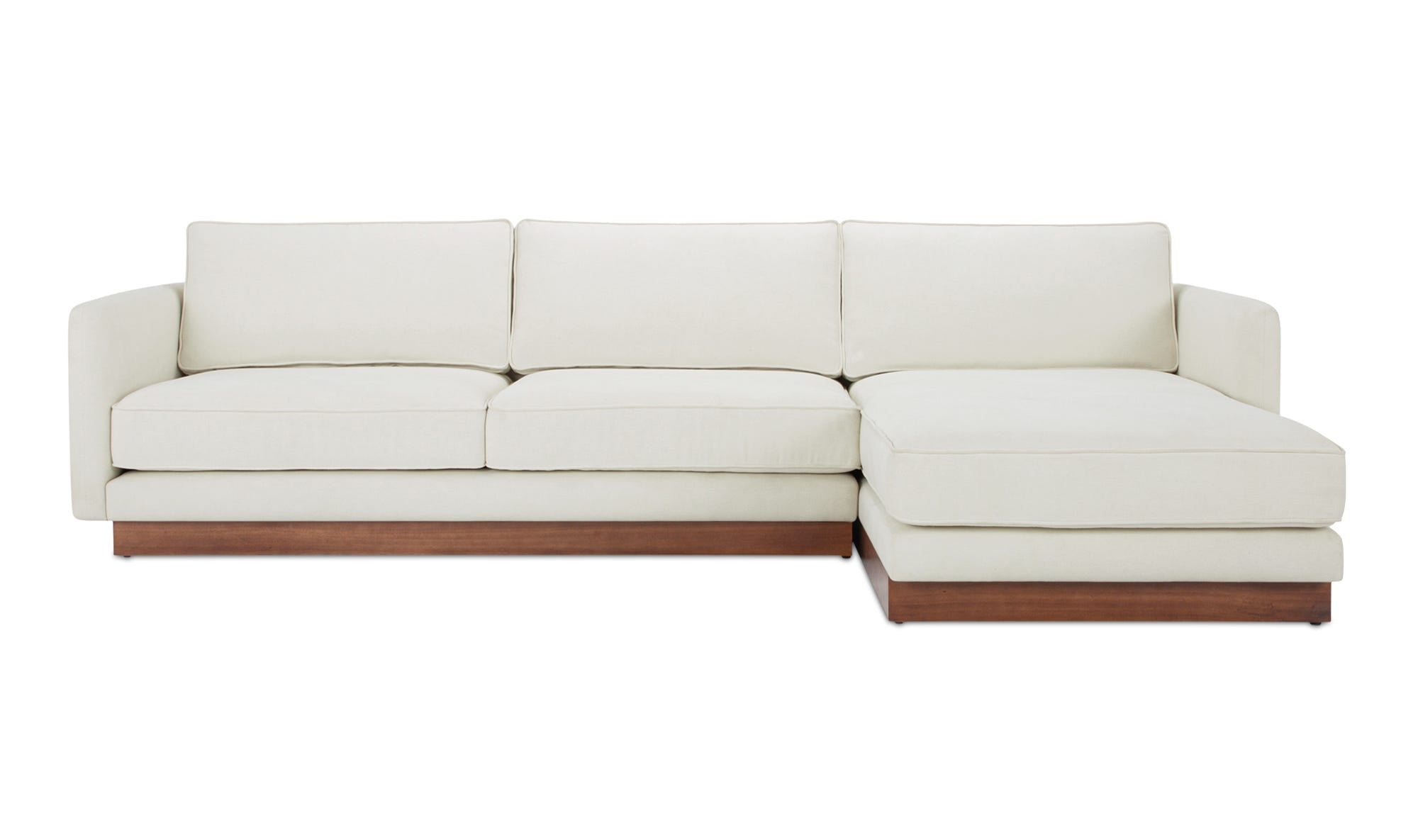 The Vernon sectional blends mid-century design with modern functionality. It features a wooden plinth base for an elevated, lighter appearance. This sectional offers unmatched comfort with removable cushions. Upholstered in durable, OEKO-TEX and Green Guard-certified fabric, it is ideal for family living, combining everyday practicality with durability.
