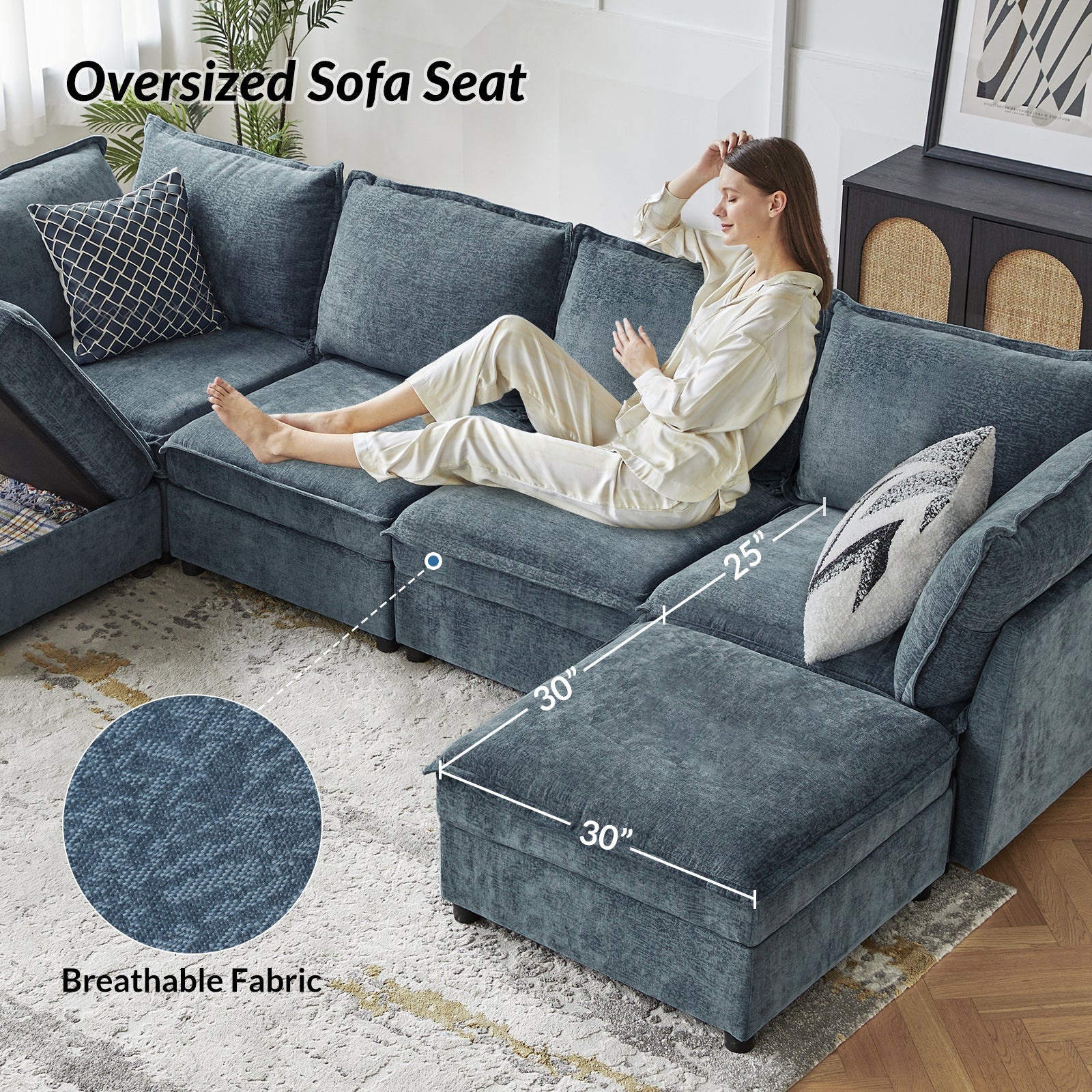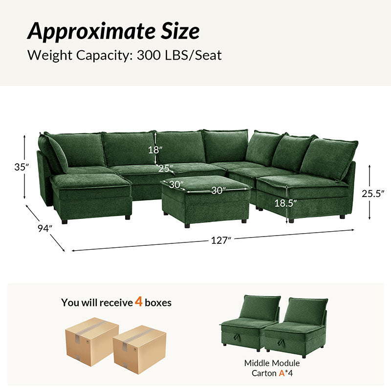 This modular sofa is designed for maximum comfort and versatility. Featuring 1.5x extra-wide seats, it caters specifically to larger individuals and expansive spaces. The soft cushions offer exceptional comfort. Hidden storage compartments under the seats help reduce clutter and provide easy access to everyday items. Its modular design allows you to rearrange the sections to create different living room layouts. Assembly is hassle-free with no tools required, and the sofa's segmented packaging ensures easy transportation. Additionally, the fabric covers are removable and washable, maintaining a fresh and clean look.