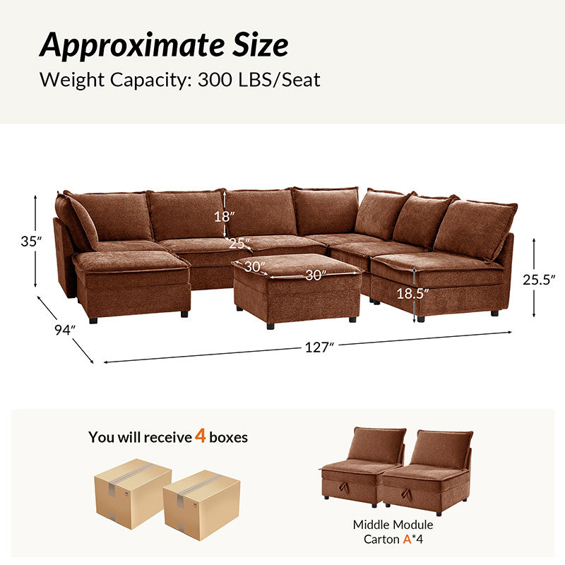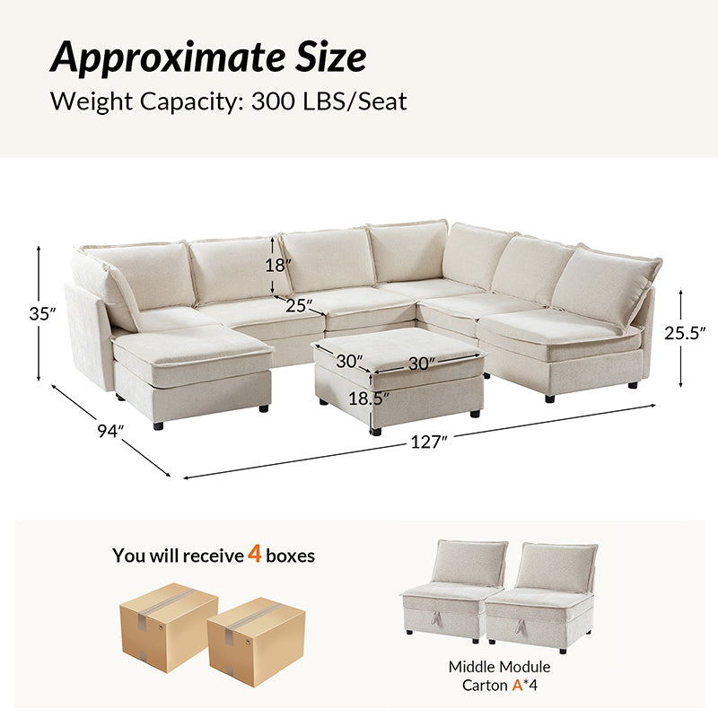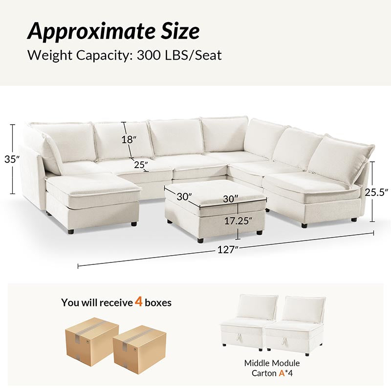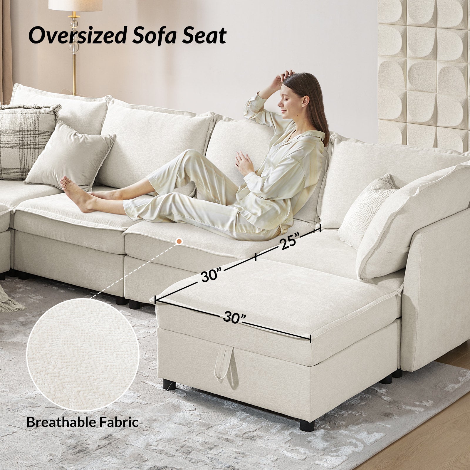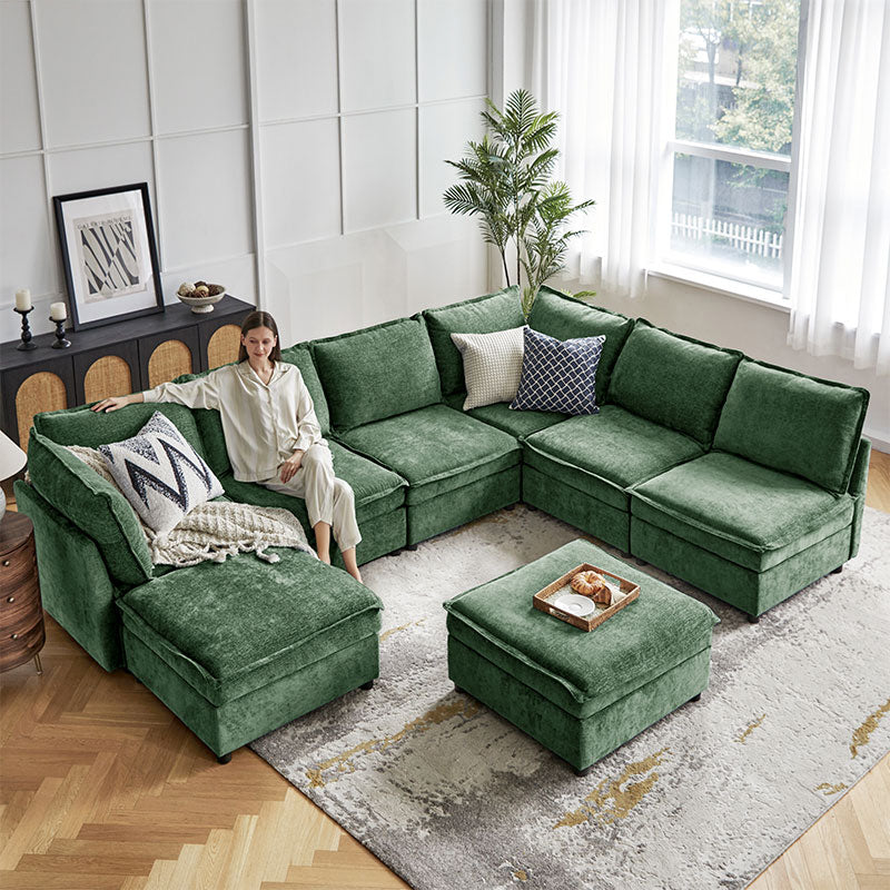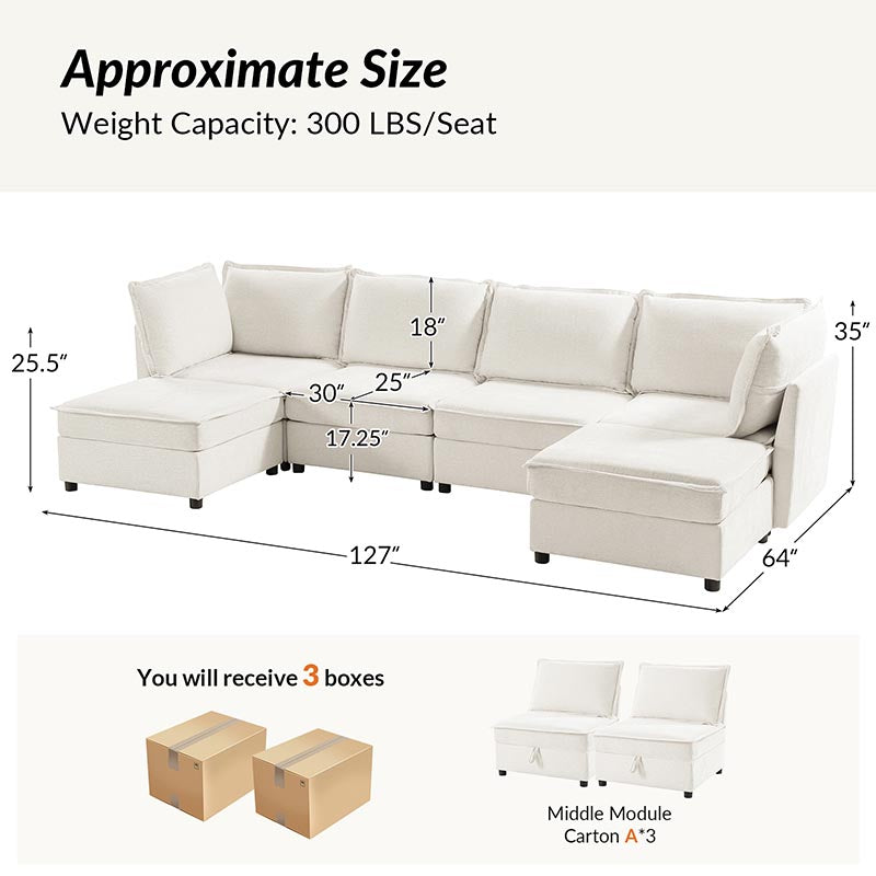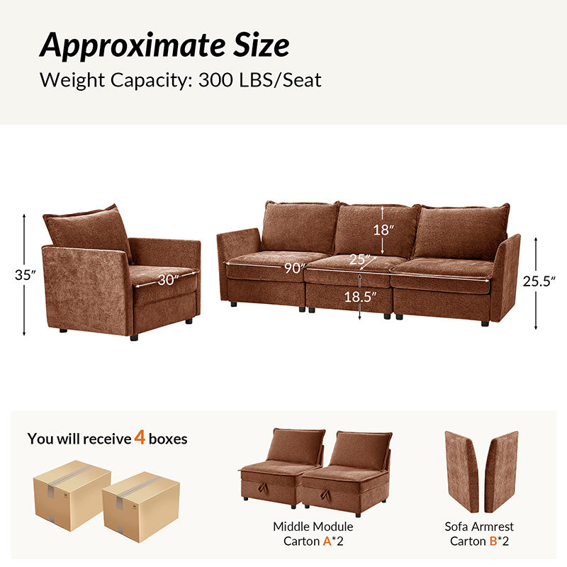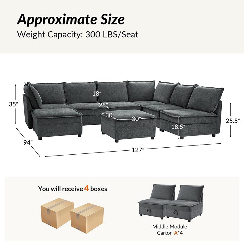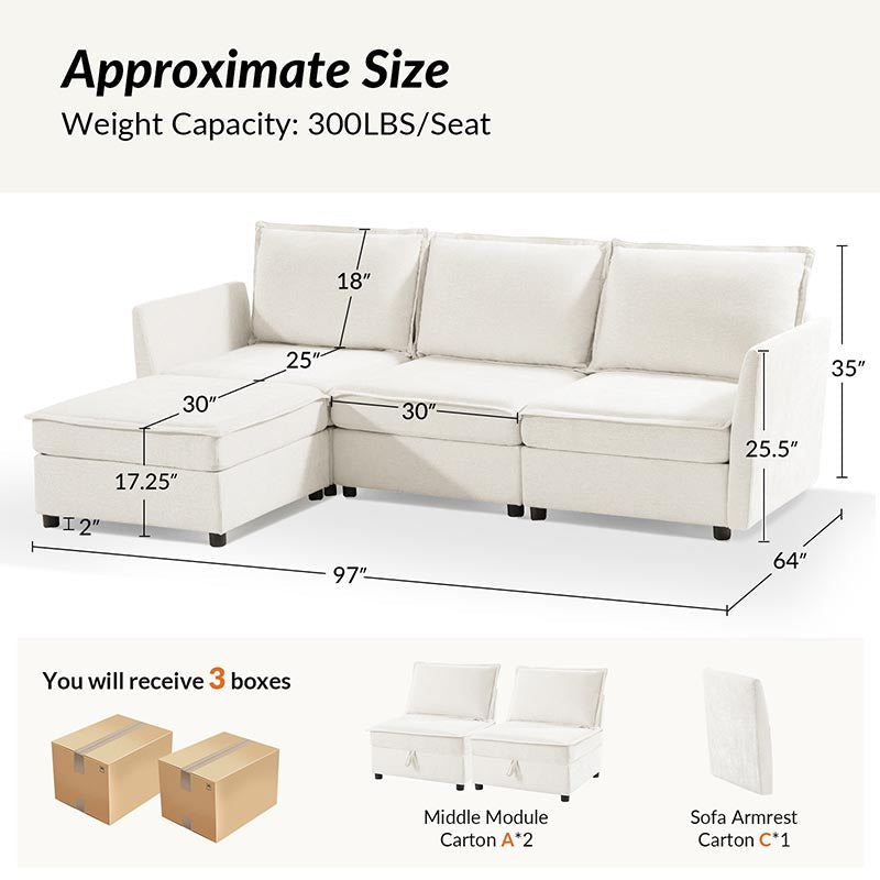 This modular sofa is designed for maximum comfort and versatility. Featuring 1.5x extra-wide seats, it caters specifically to larger individuals and expansive spaces. The soft cushions offer exceptional comfort. Hidden storage compartments under the seats help reduce clutter and provide easy access to everyday items. Its modular design allows you to rearrange the sections to create different living room layouts. Assembly is hassle-free with no tools required, and the oversized sectional sofa's segmented packaging ensures easy transportation. Additionally, the fabric covers are removable, maintaining a fresh and clean look.