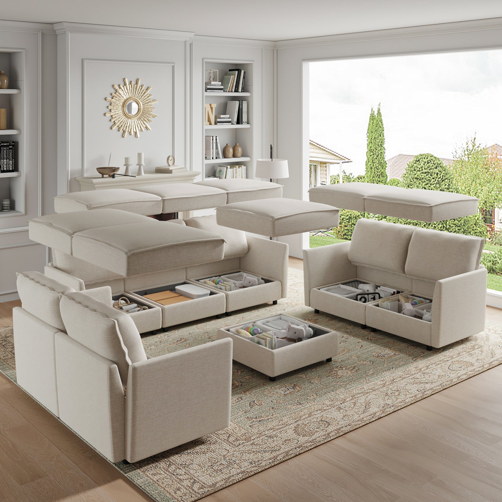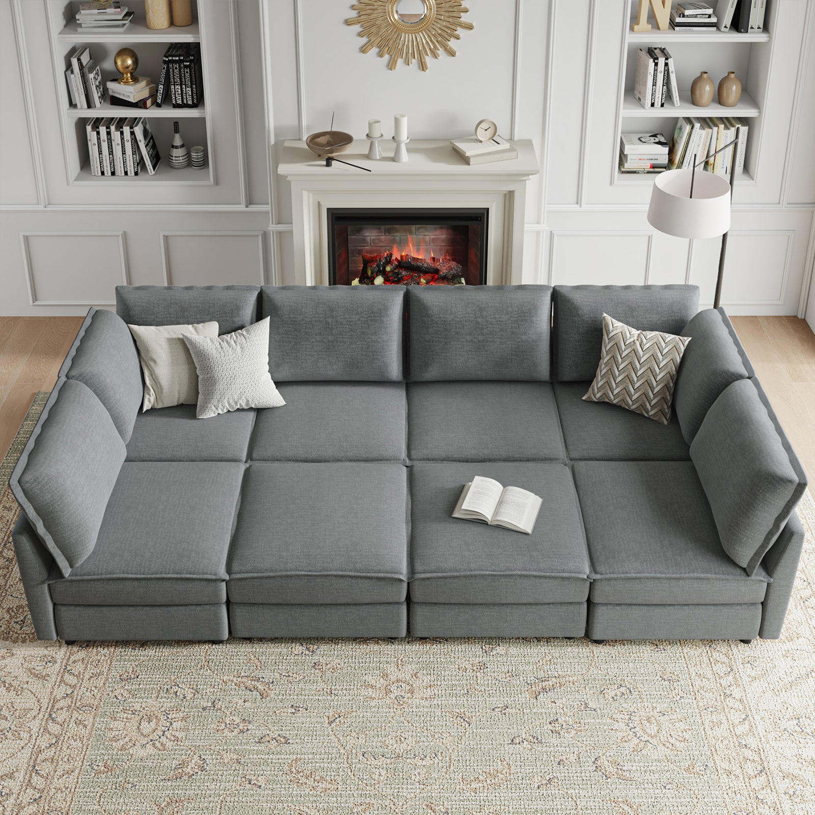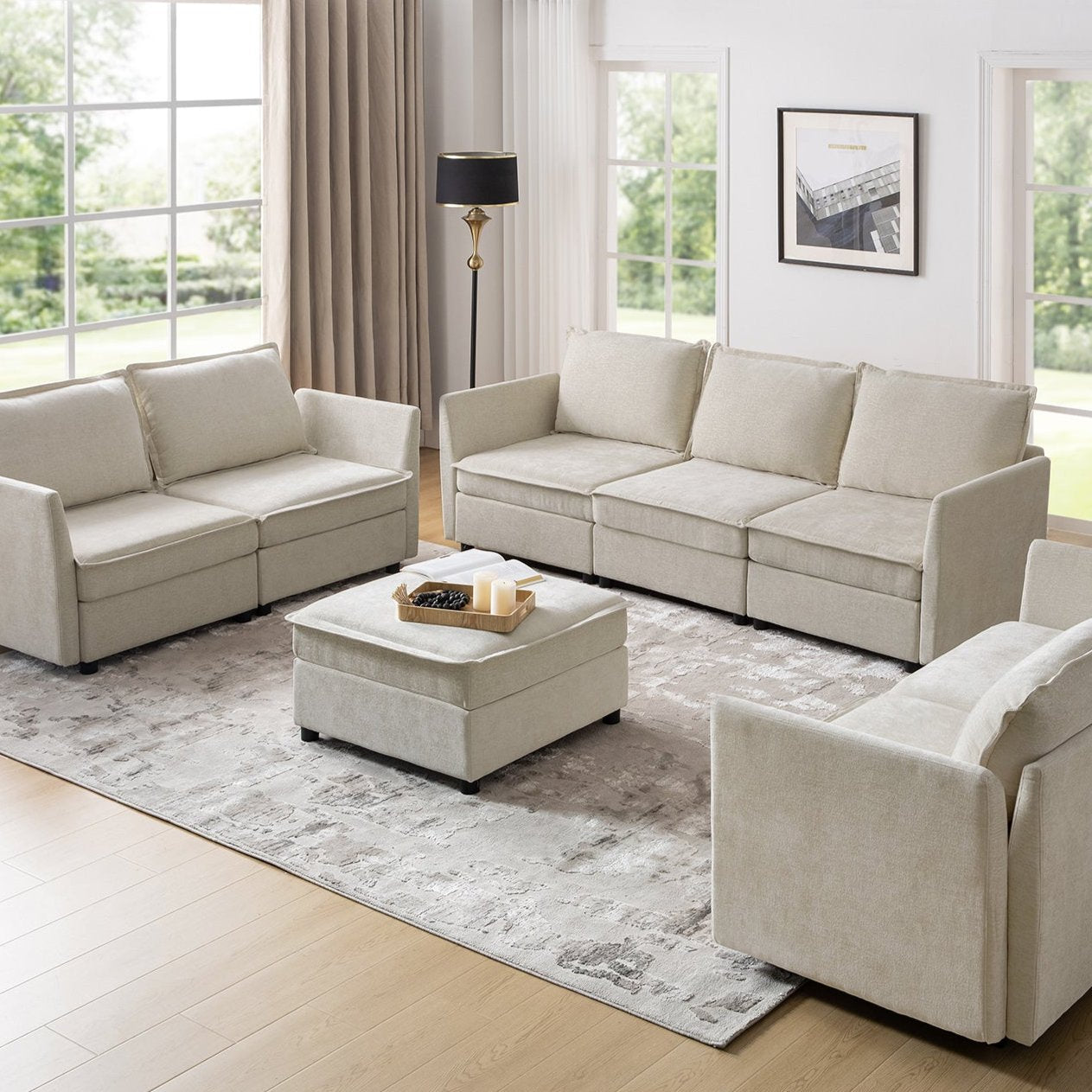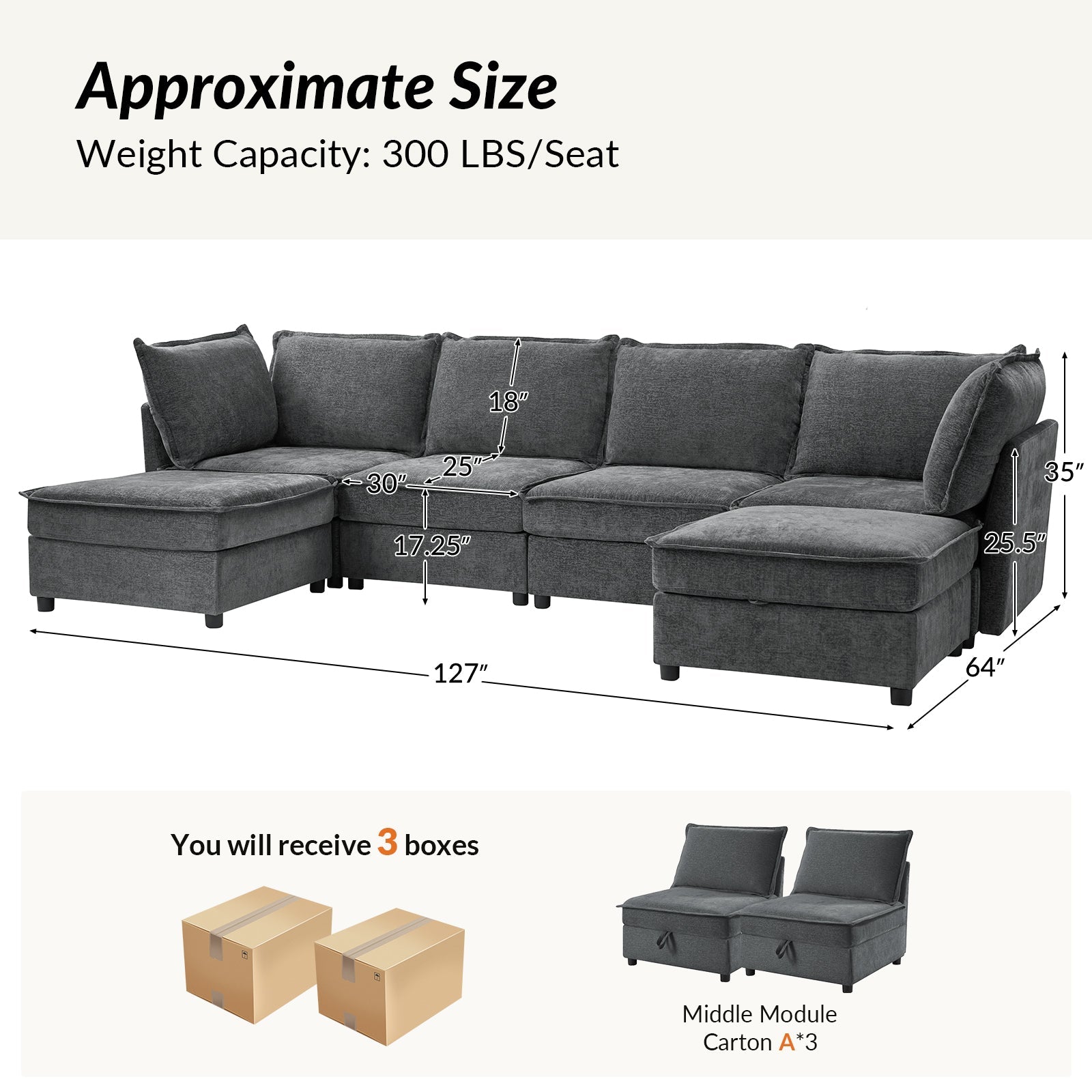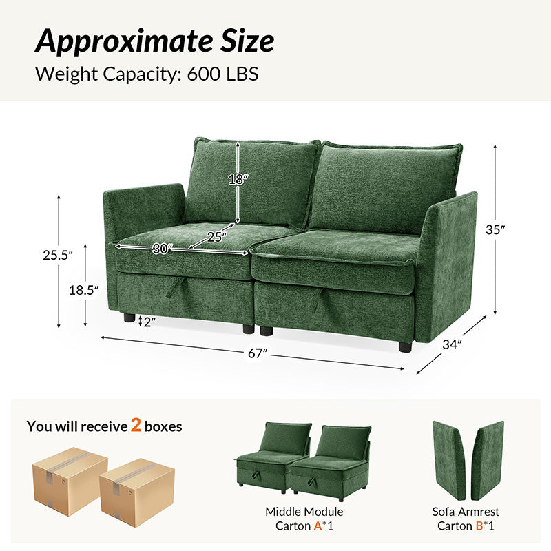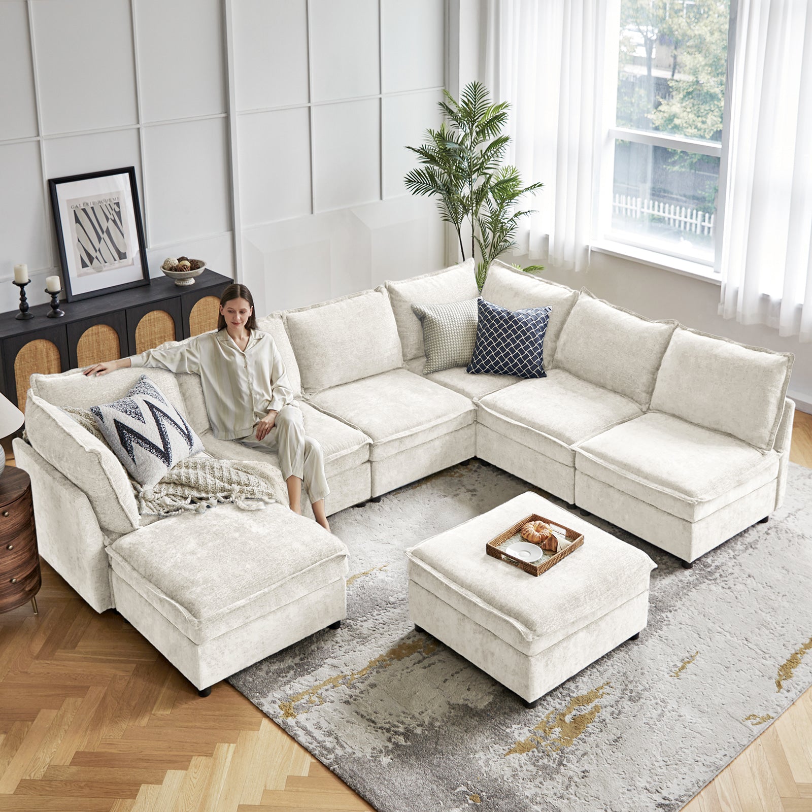 This modular sofa is designed for maximum comfort and versatility. Featuring 1.5x extra-wide seats, it caters specifically to larger individuals and expansive spaces. The soft cushions offer exceptional comfort. Hidden storage compartments under the seats help reduce clutter and provide easy access to everyday items. Its modular design allows you to rearrange the sections to create different living room layouts. Assembly is hassle-free with no tools required, and the oversized sectional sofa's segmented packaging ensures easy transportation. Additionally, the fabric covers are removable, maintaining a fresh and clean look.