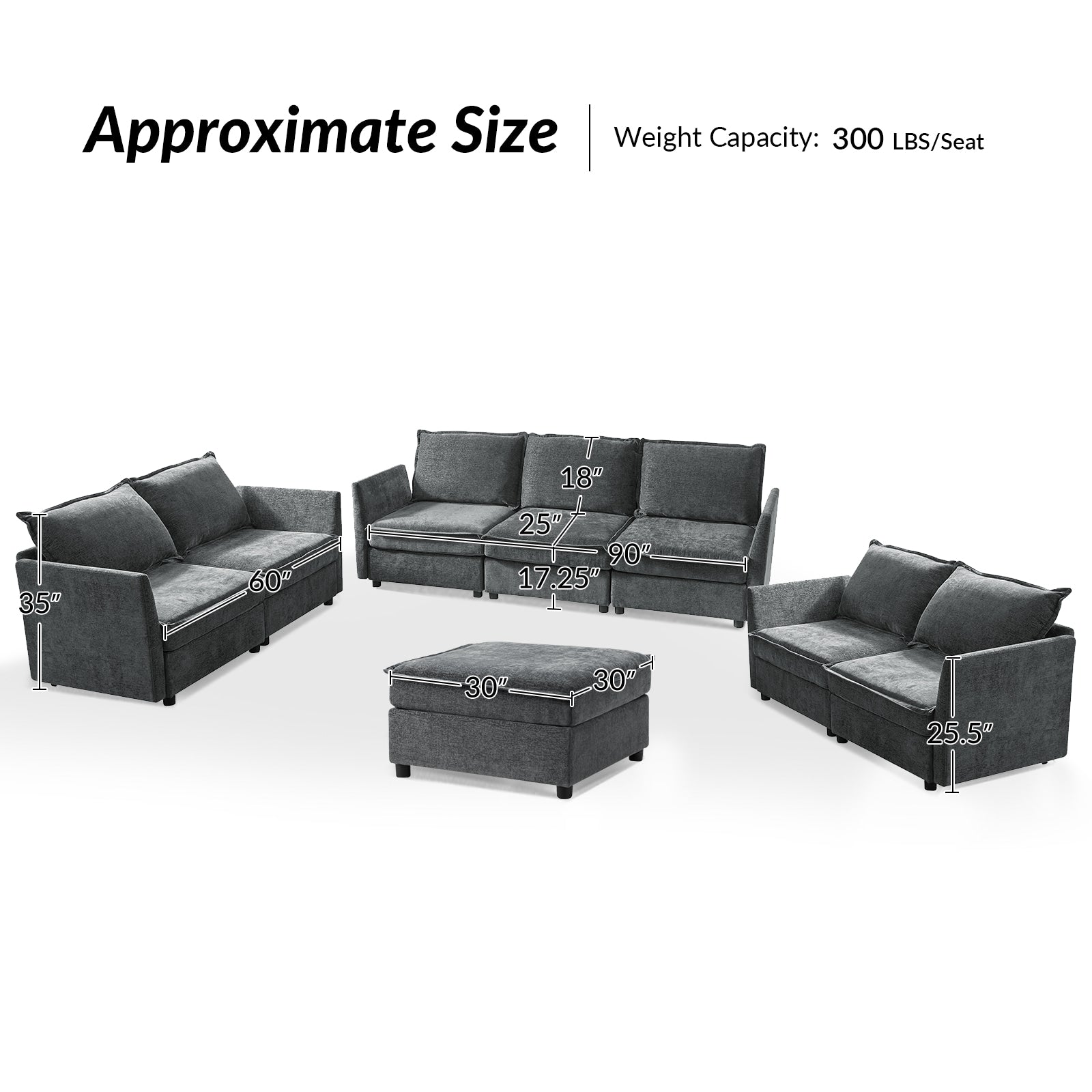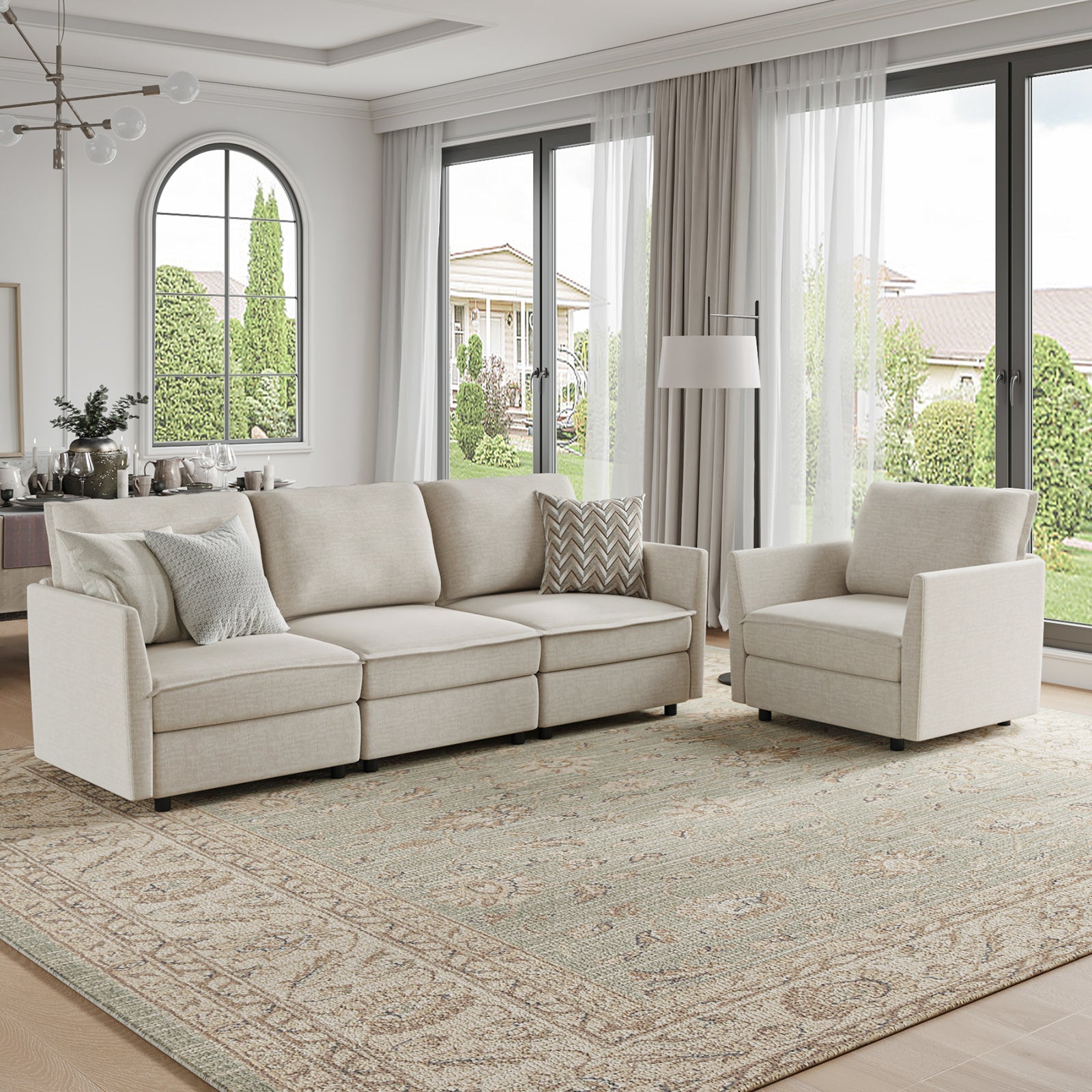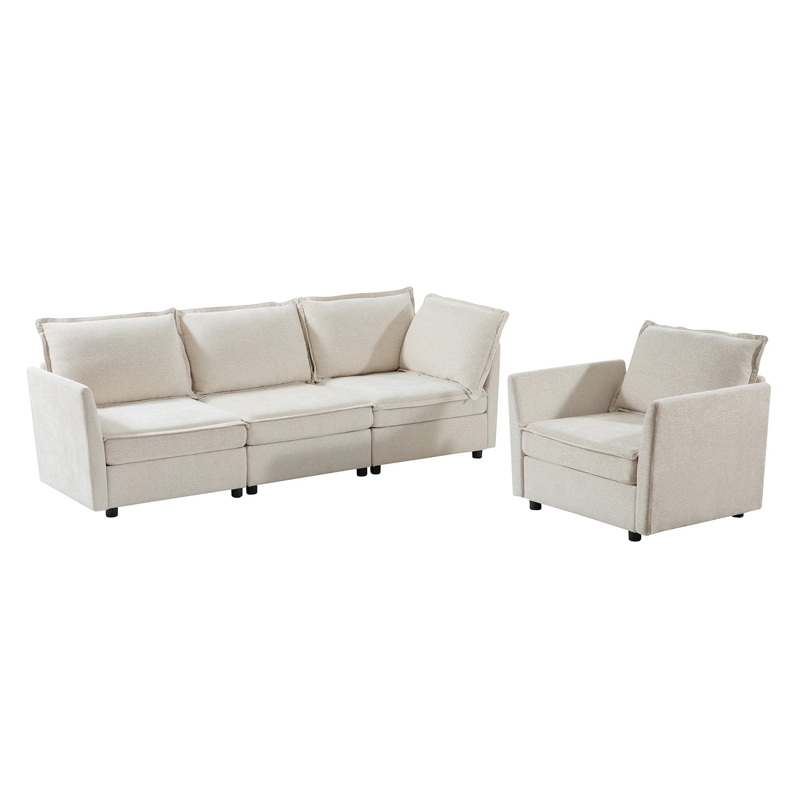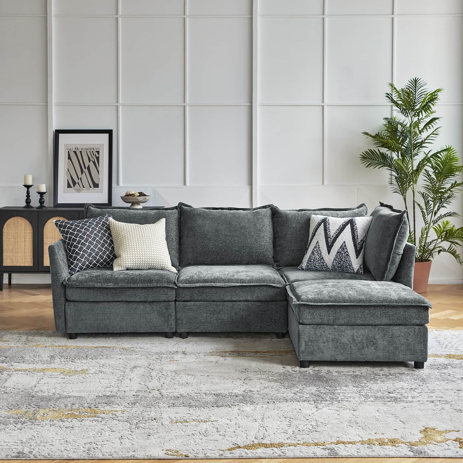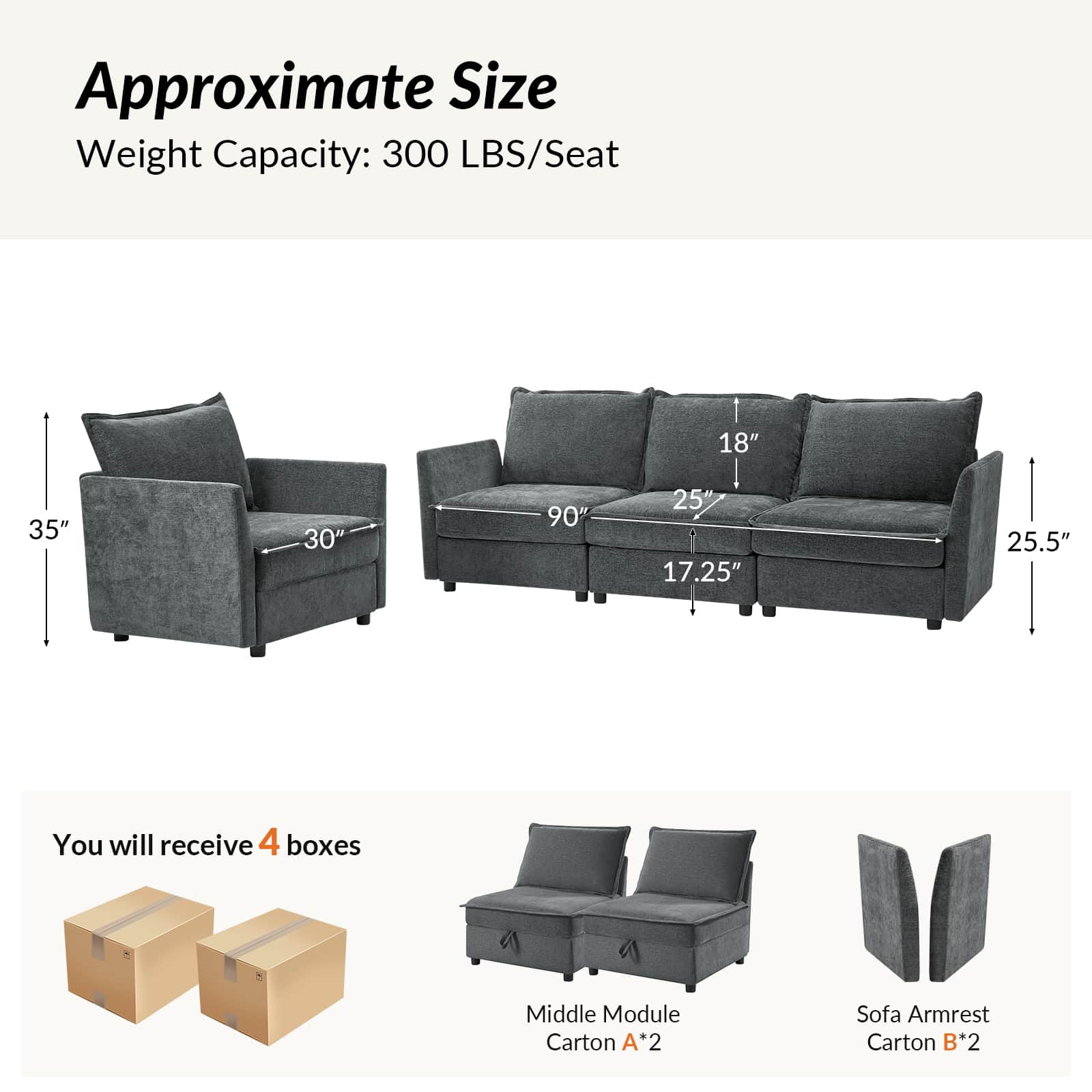 This modular sofa is designed for maximum comfort and versatility. Featuring 1.5x extra-wide seats, it caters specifically to larger individuals and expansive spaces. The soft cushions offer exceptional comfort. Hidden storage compartments under the seats help reduce clutter and provide easy access to everyday items. Its modular design allows you to rearrange the sections to create different living room layouts. Assembly is hassle-free with no tools required, and the oversized sectional sofa's segmented packaging ensures easy transportation. Additionally, the fabric covers are removable, maintaining a fresh and clean look.