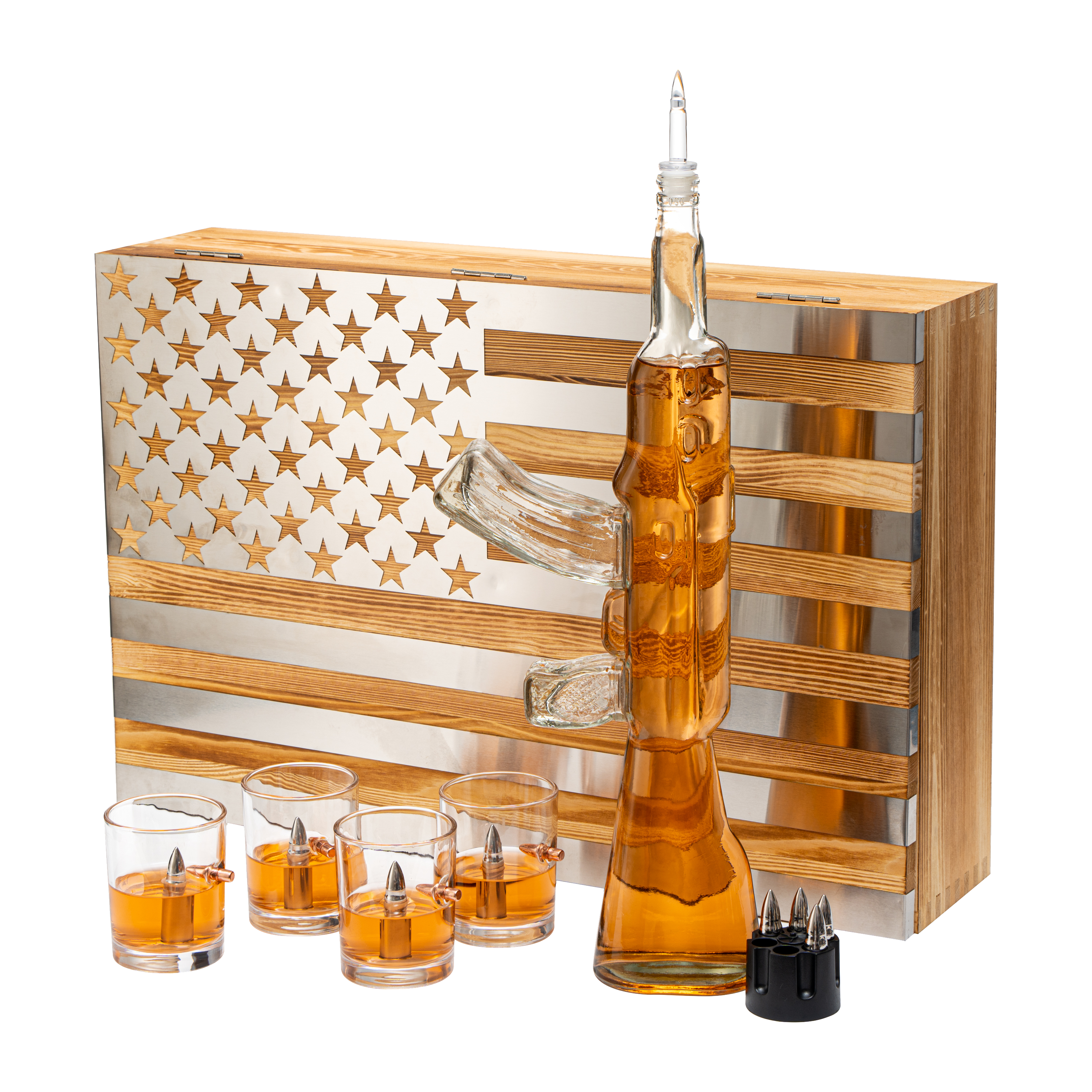 Whiskey Decanter Flag Set - 1000ml AK47 Rifle Gun, Glasses & Chillers Set in Box - Hanging Storage American Flag Gift Box With Silver Metal Flag, Great Gift Army, Navy, Marines, Veterans