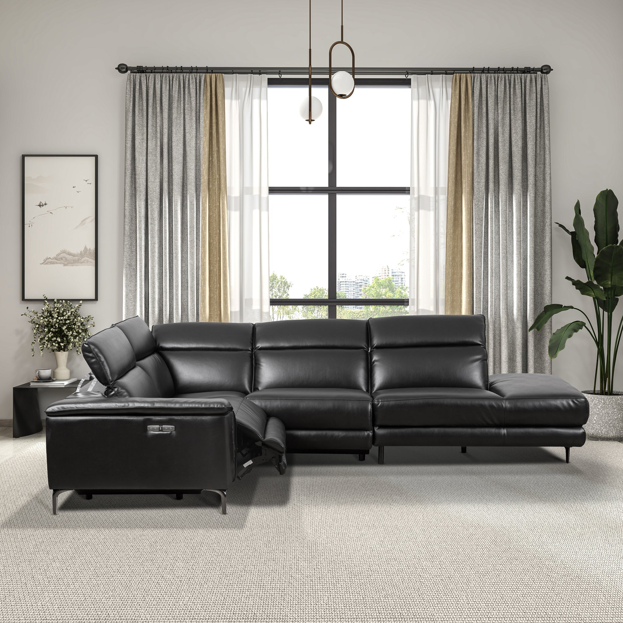 Presenting the Zander Reclining Sectional in black leather, the ideal combination of modern design, luxury, and functionality. This L-shaped sectional is comfortable and easy to maintain, thanks to its upholstery made of premium soft-touch vegan leather. With its motorized reclining mechanism and adjustable headrest for customized support, the Zander sectional allows for effortless modifications for optimal comfort. This space-efficient sectional, which can easily seat four to five people, is ideal for compact living spaces without compromising design. Family-friendly materials make it well-suited for homes with kids and pets, and it comes with simple assembly and CARB and TB117 safety compliance for added assurance.