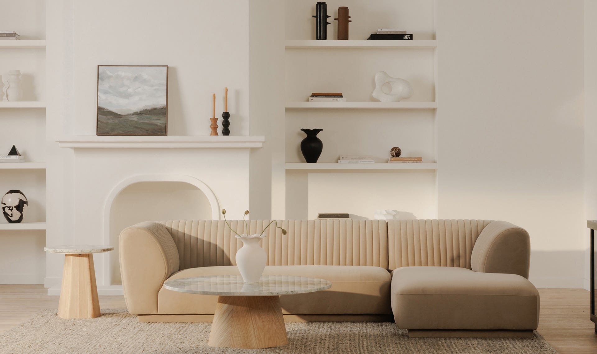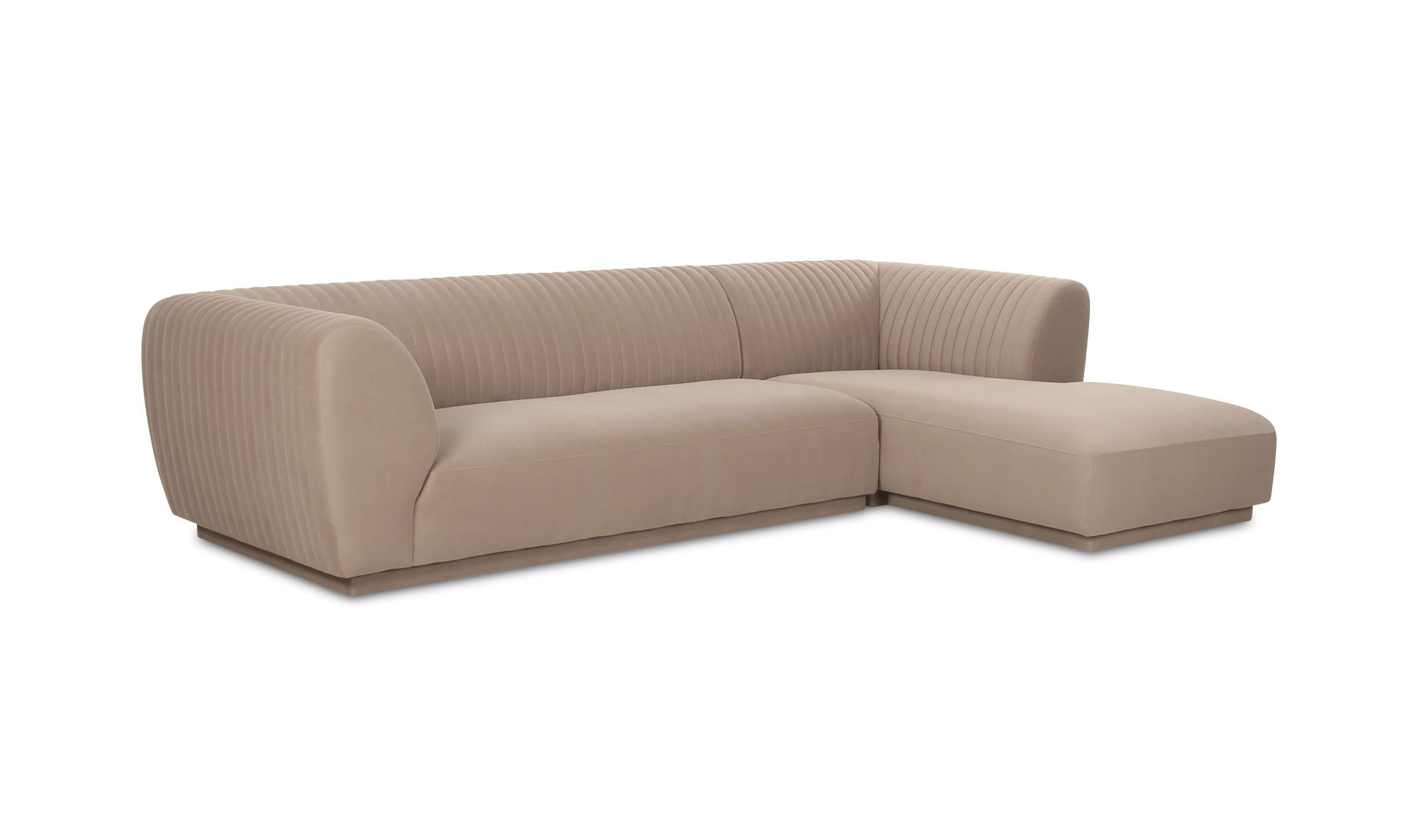 The Zandro sectional brings a tasteful touch to any room with its plush velvet upholstery, a soft touch with subtle elegance. Its vertical channel detailing along the back and arms adds a sophisticated visual texture, while the warm, neutral color allows it to blend seamlessly into any décor without overwhelming.